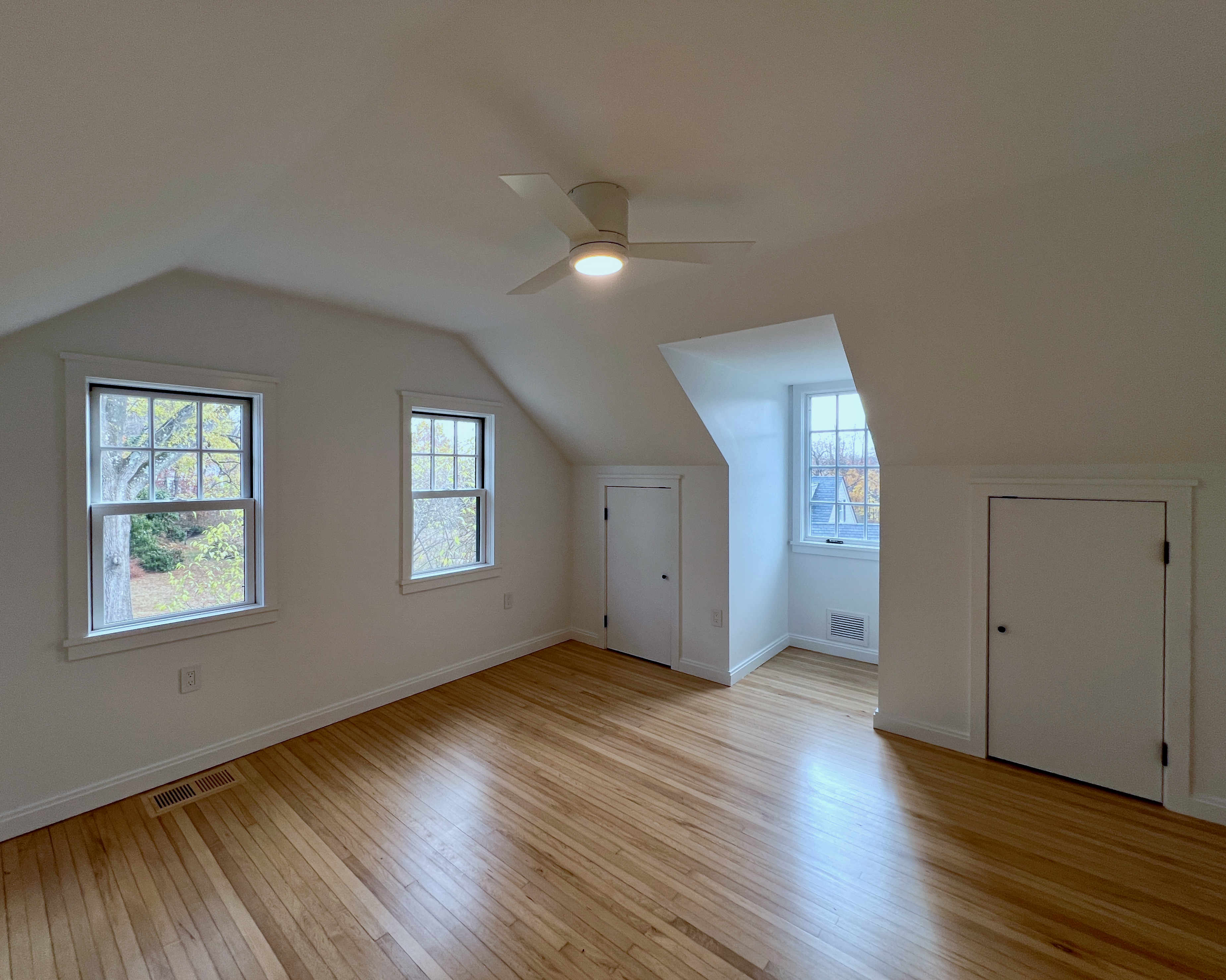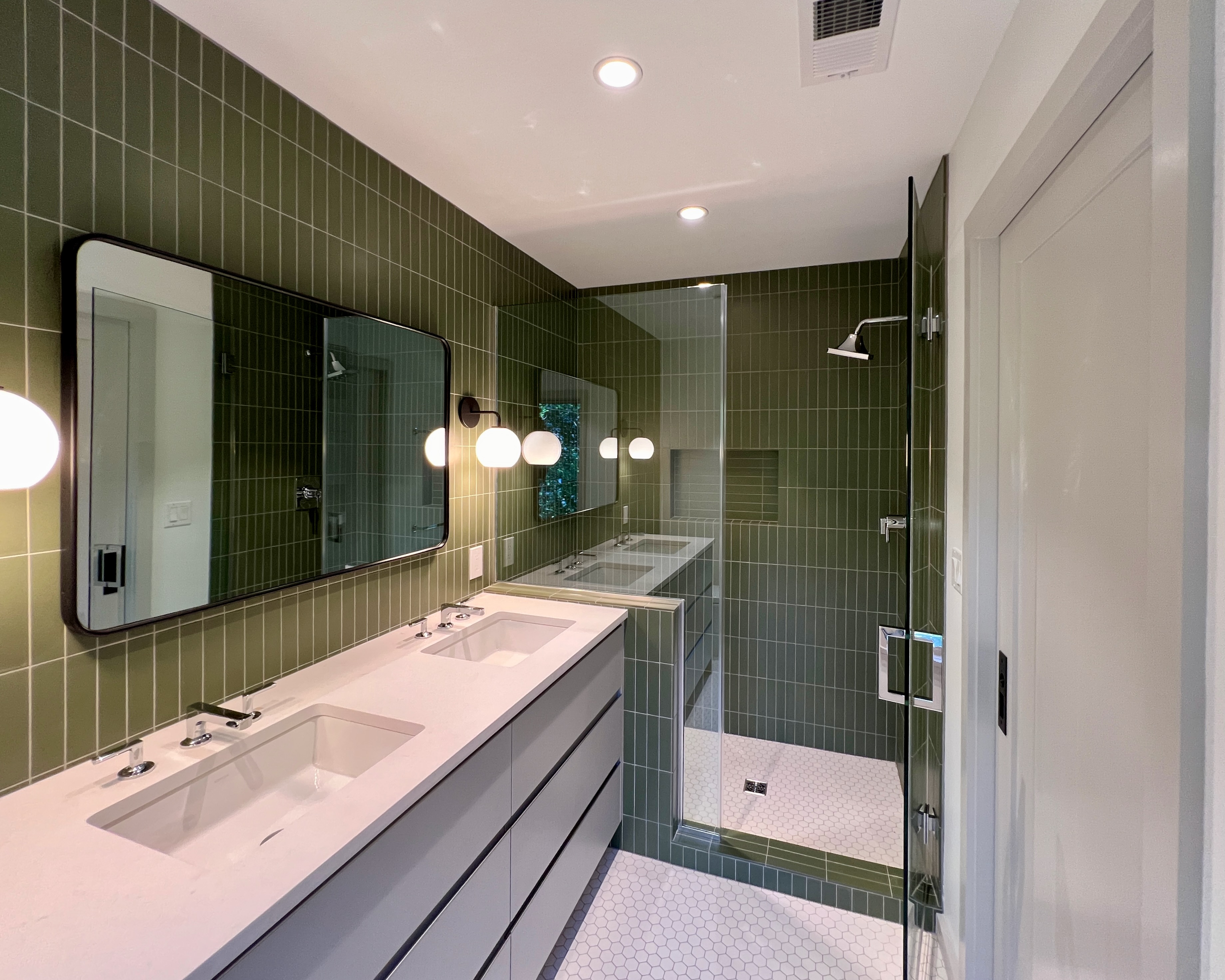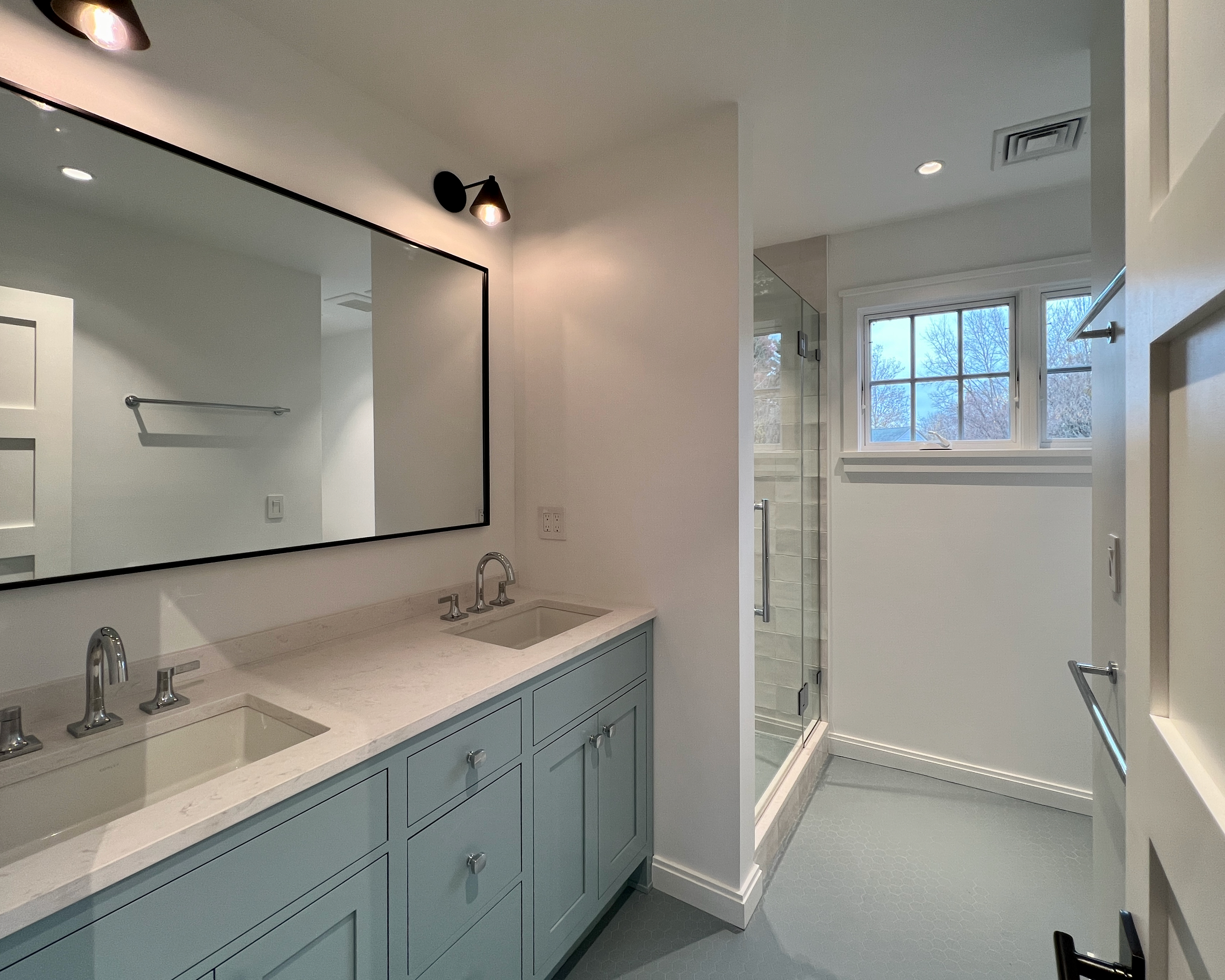 This home was originally constructed in 1953, it was "House #8" of a small development of modest homes clustered around a Lake. The original layout was congested. The serpentine circulation path cut through the living room, small dining room, and galley kitchen. We reorganized all the spaces on the first floor and designed a small but purposeful addition into the backyard to relieve the plan and allow larger living and social spaces that did not double as corridors. Large format glazing at the addition improved views and indoor/outdoor connectivity. The garage was converted into a bedroom suite. The second floor features a new rear-facing shed dormer to enlarge the bathroom and create a laundry closet.