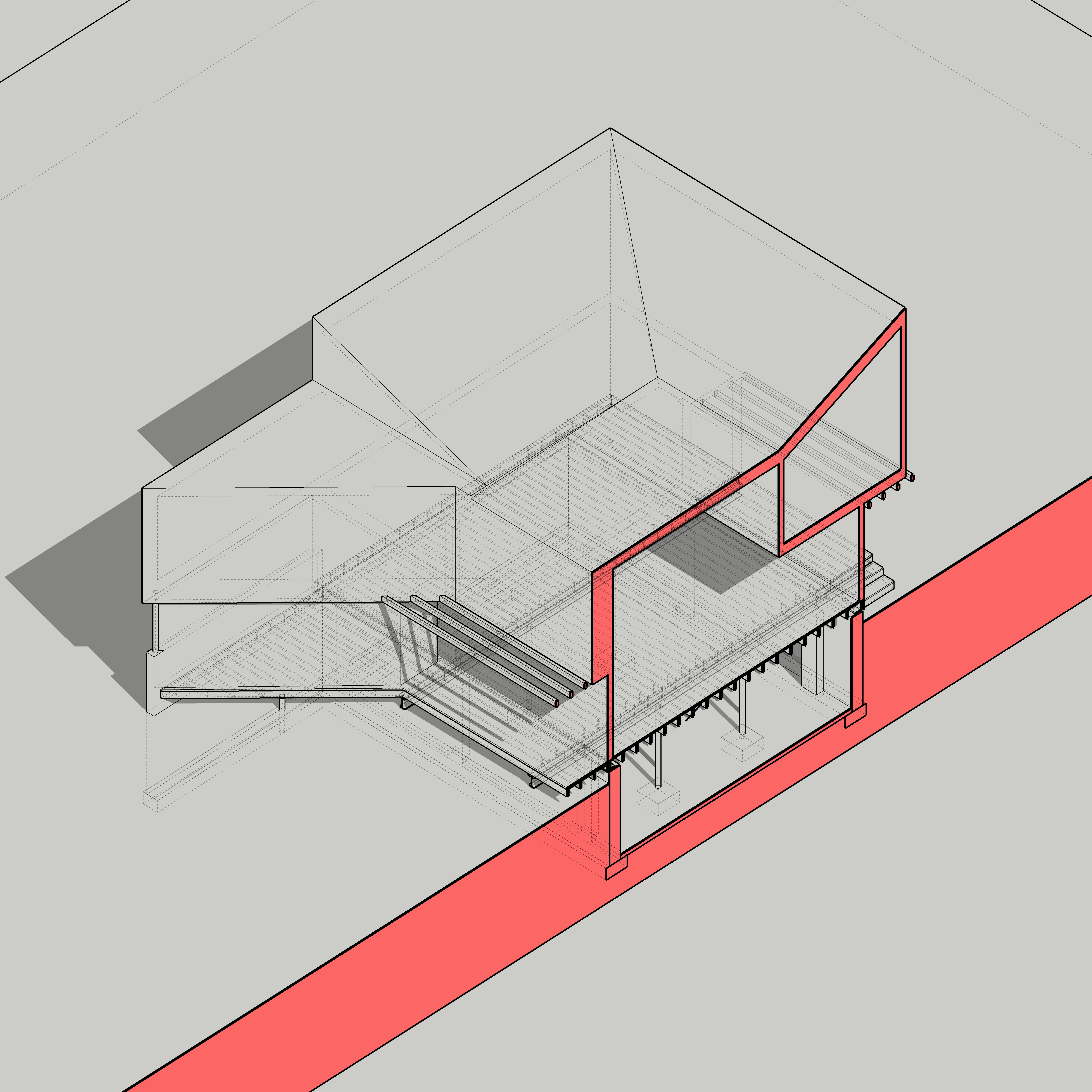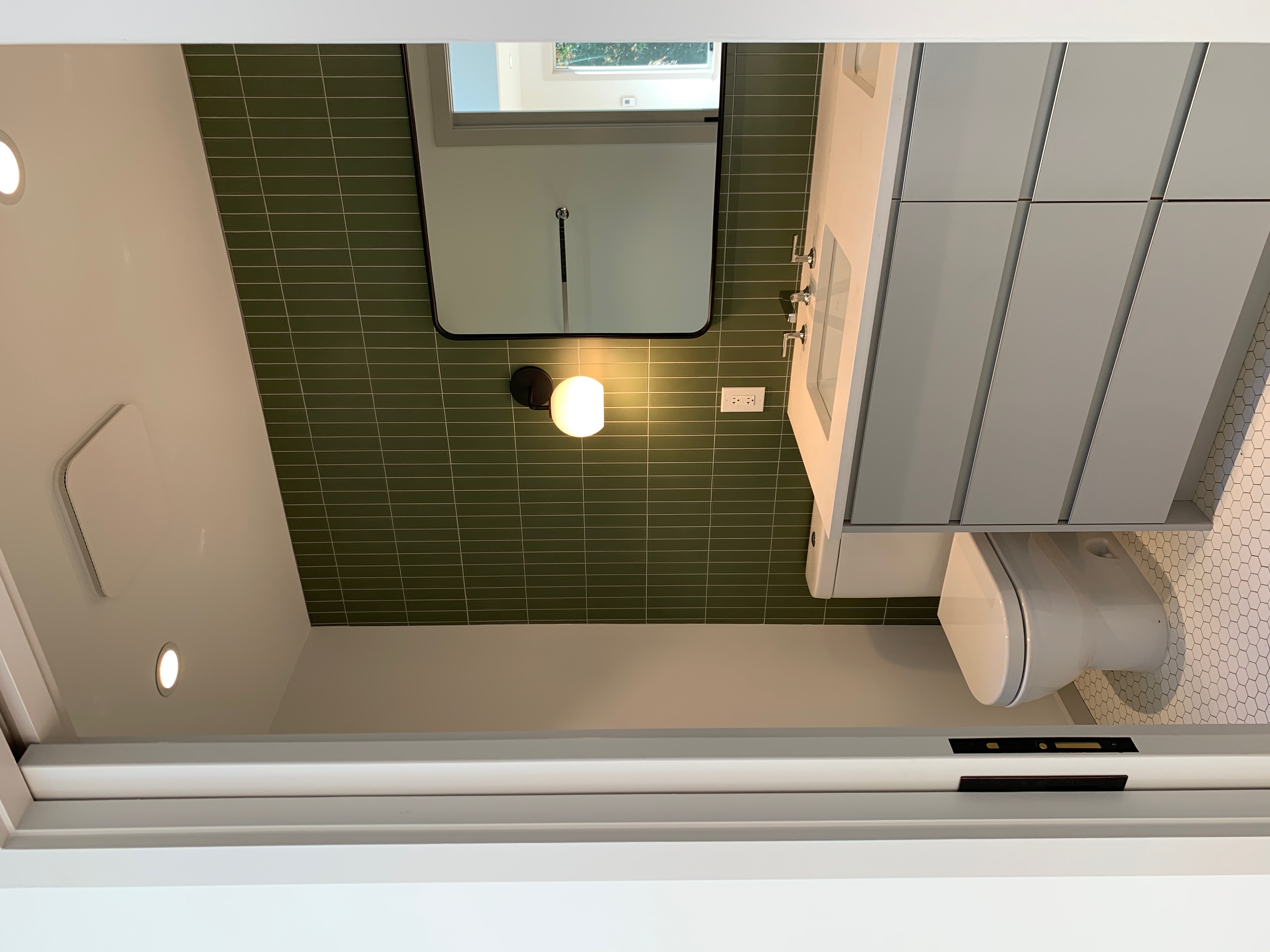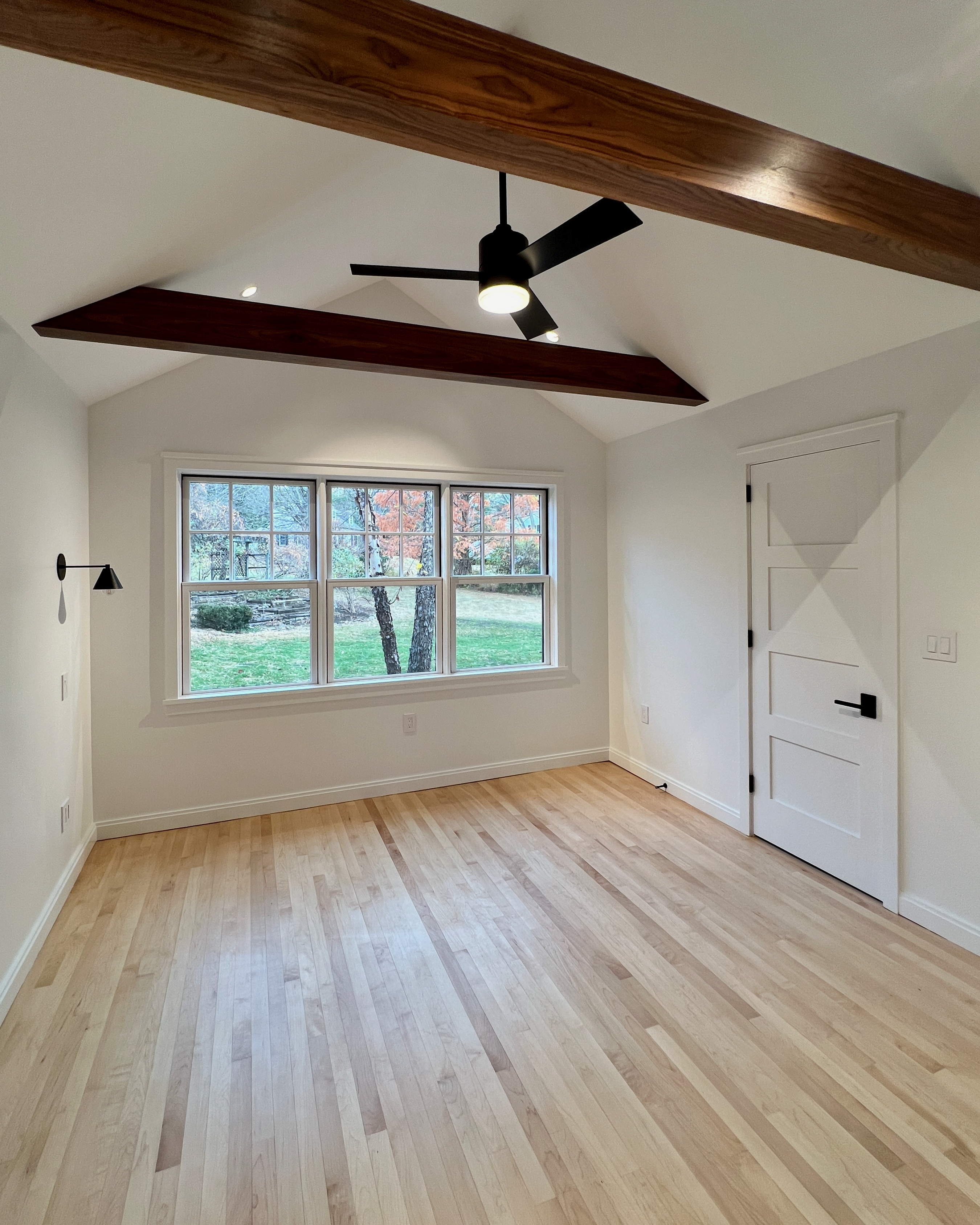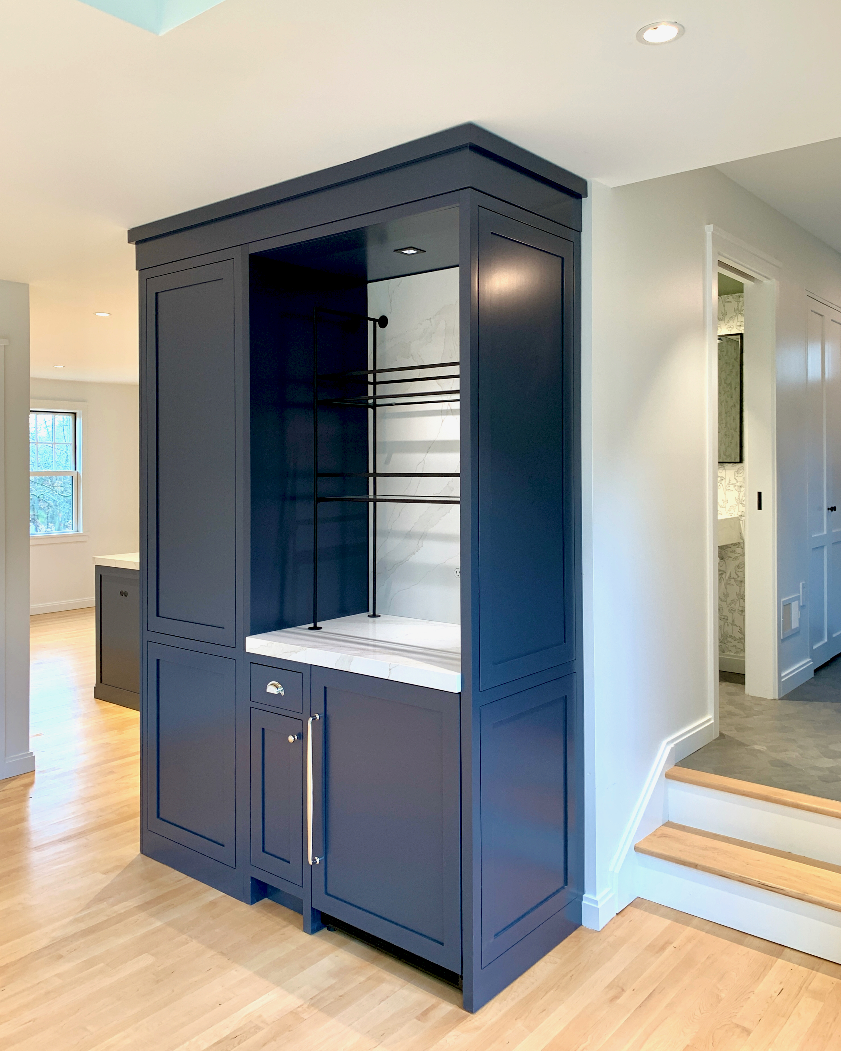 This home was originally constructed in 1953, it was "House #8" of a small development of modest homes clustered around a Lake. The original layout was congested. The serpentine circulation path cut through the living room, small dining room, and galley kitchen. We reorganized all the spaces on the first floor and designed a small but purposeful addition into the backyard to relieve the plan and allow larger living and social spaces that did not double as corridors. Large format glazing at the addition improved views and indoor/outdoor connectivity. The garage was converted into a bedroom suite. The second floor features a new rear-facing shed dormer to enlarge the bathroom and create a laundry closet.