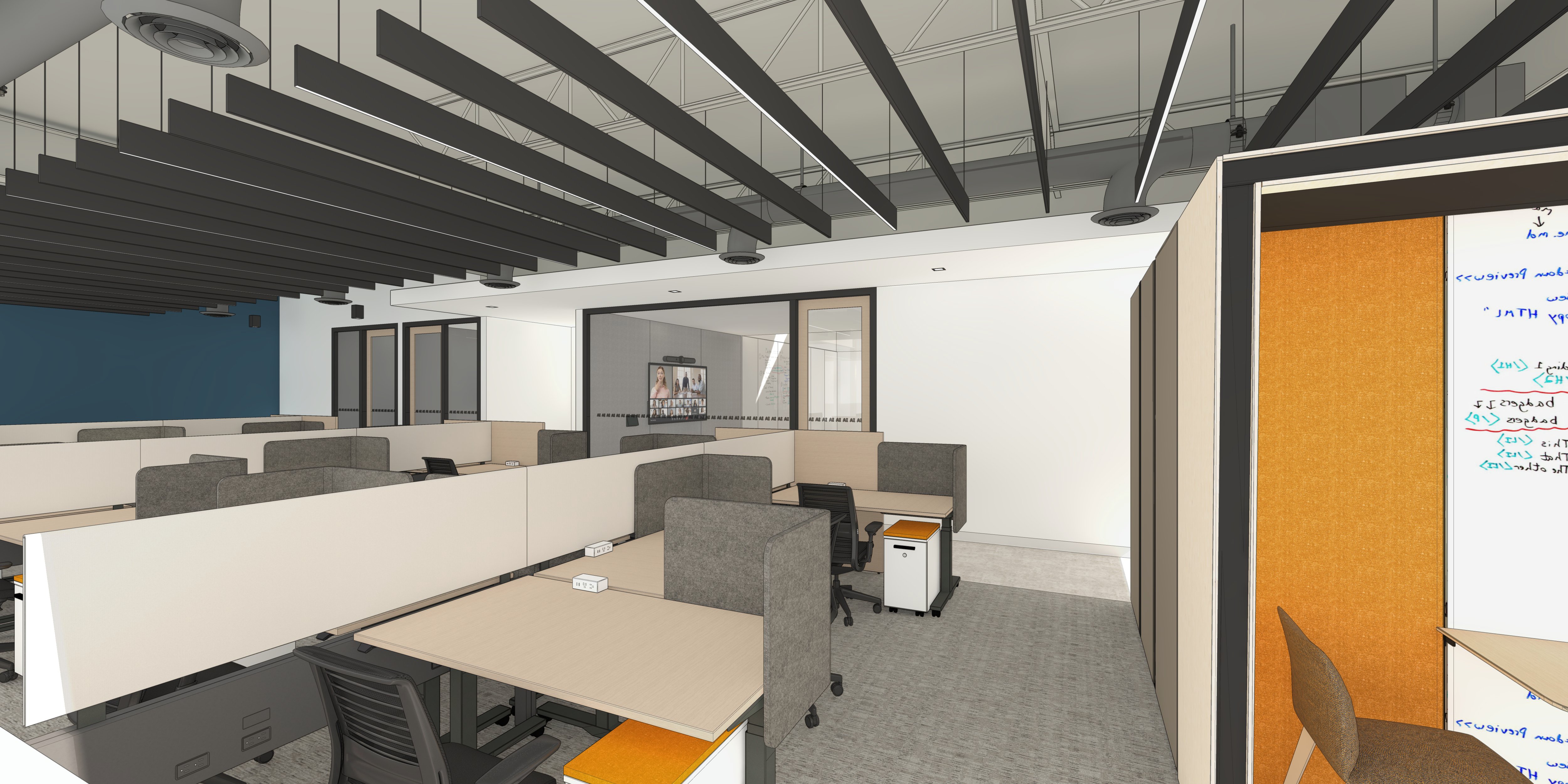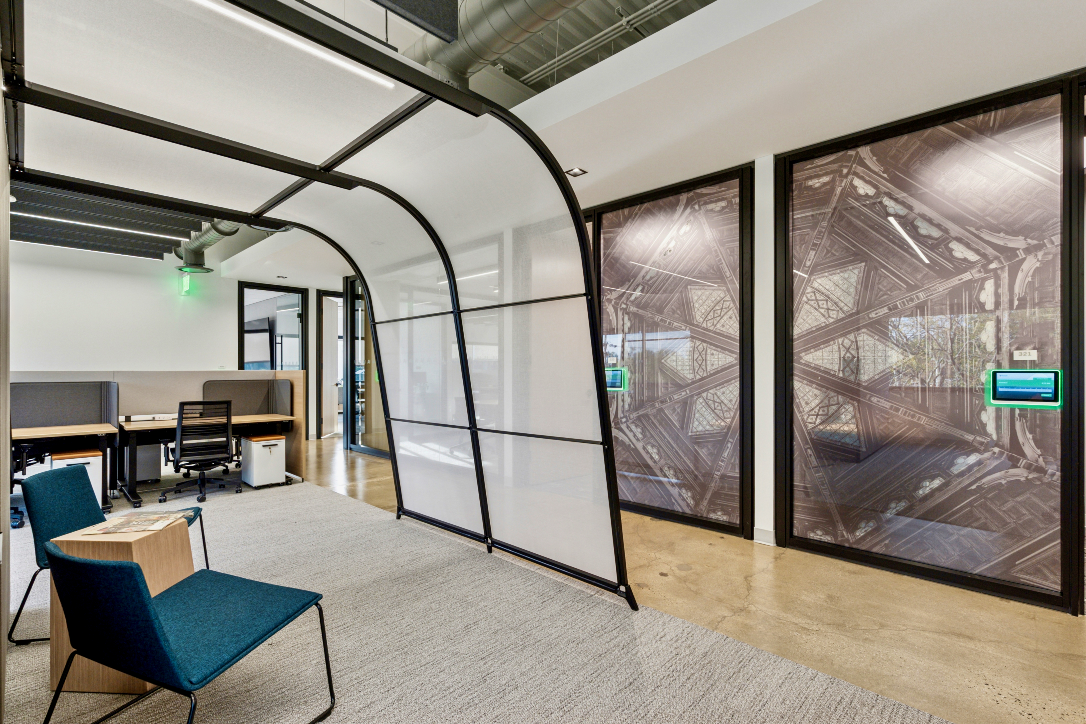 The goal of the project was to create an easily accessible and convenient service center for students to interface with various University Services, as well as touchdown space for University Services staff. The Point is in one of the lower levels of a highrise building on campus, which presented several design challenges. We used expanses of luminous panels and glass to help create a feeling of spaciousness and openness in an area of relatively low ceiling heights. Making The Point highly visible was another challenge. We responded to this by designing an orange acoustical felt accent wall with a corner-wrapping graphic sign that is visible from the entry doors.