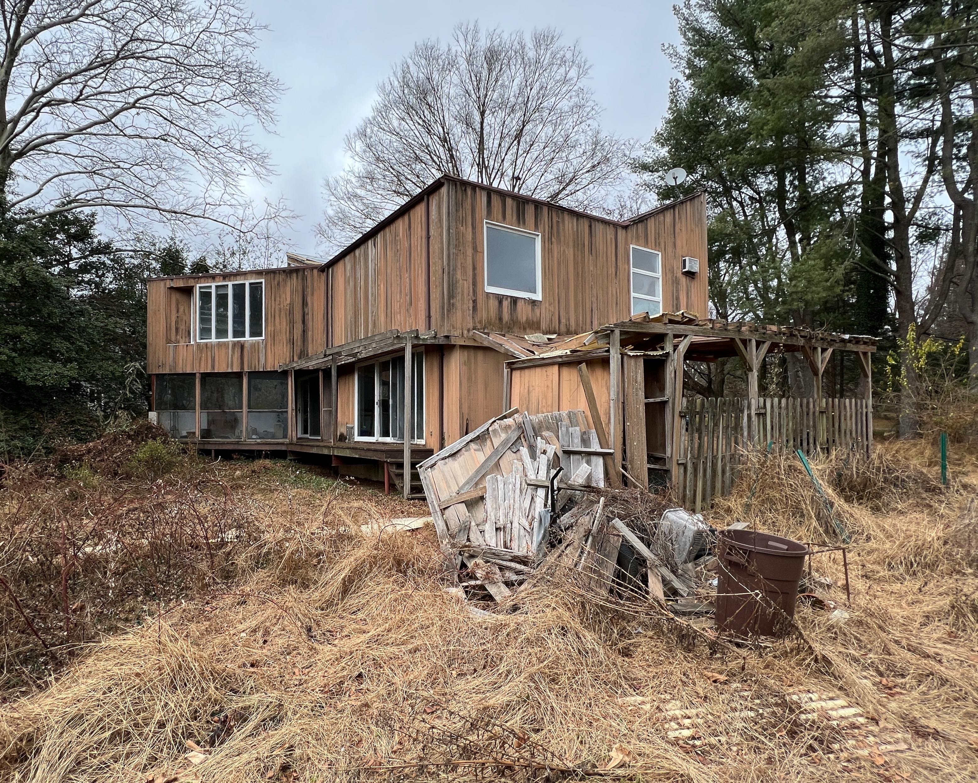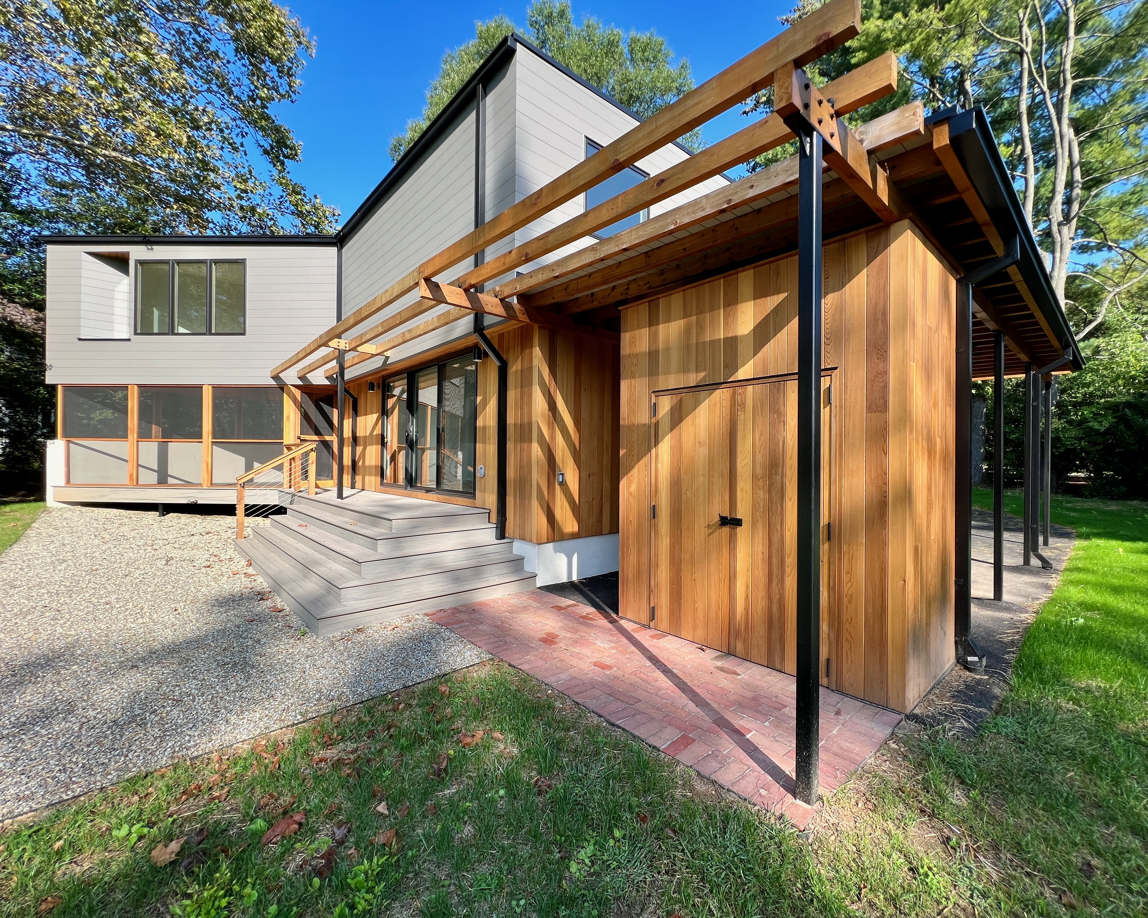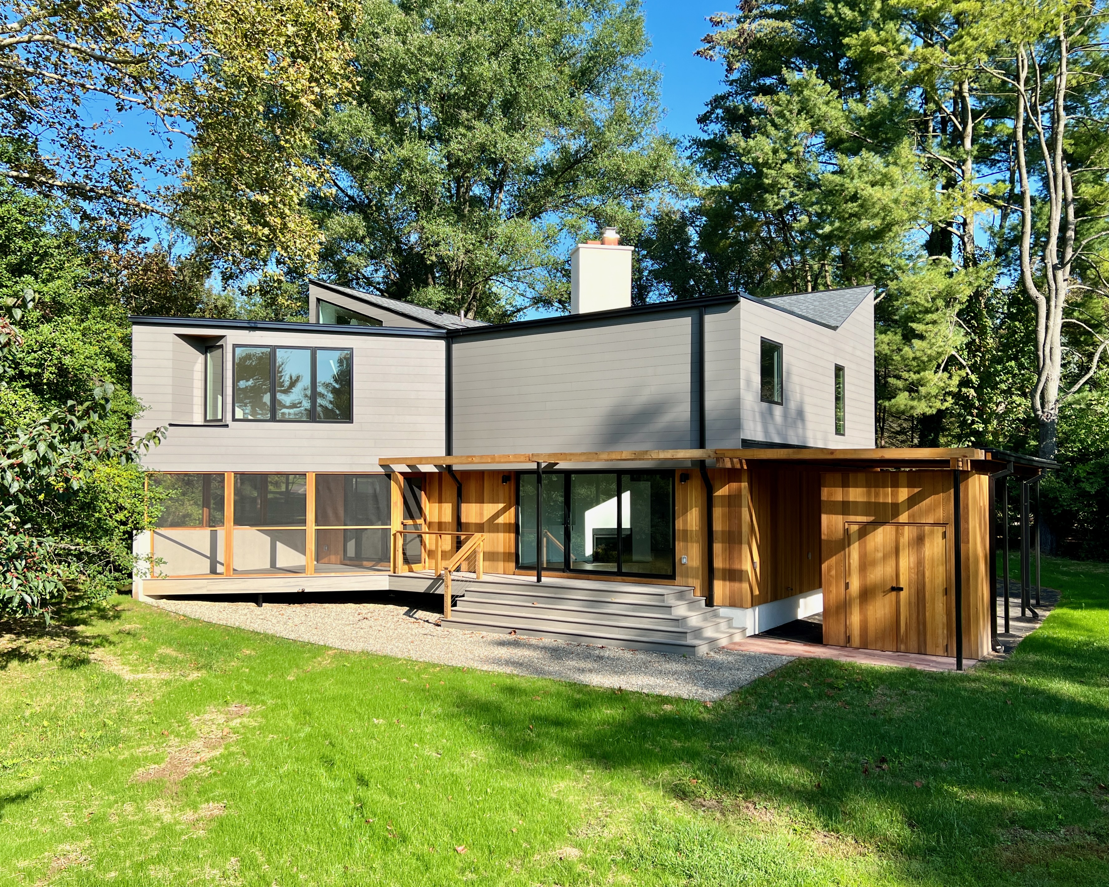 The residence, originally constructed in 1971 and designed by R. Scofidio, had been unoccupied for several years. To revitalize the property, our firm undertook a comprehensive restoration, which included "selective opening" of the first floor and the addition of a full bath and a third bedroom on the second floor to enhance its value. The front of the home presents a tall, rigid mass when viewed from the street, while our design approach prioritized openness, illumination, and integration with the surrounding environment at the rear of the structure. Entry points were accentuated with natural cedar cladding. The interior design scheme used a tranquil palette, clean and understated detailing, and playful pops of color in private areas to complement the mid-century modern aesthetic.