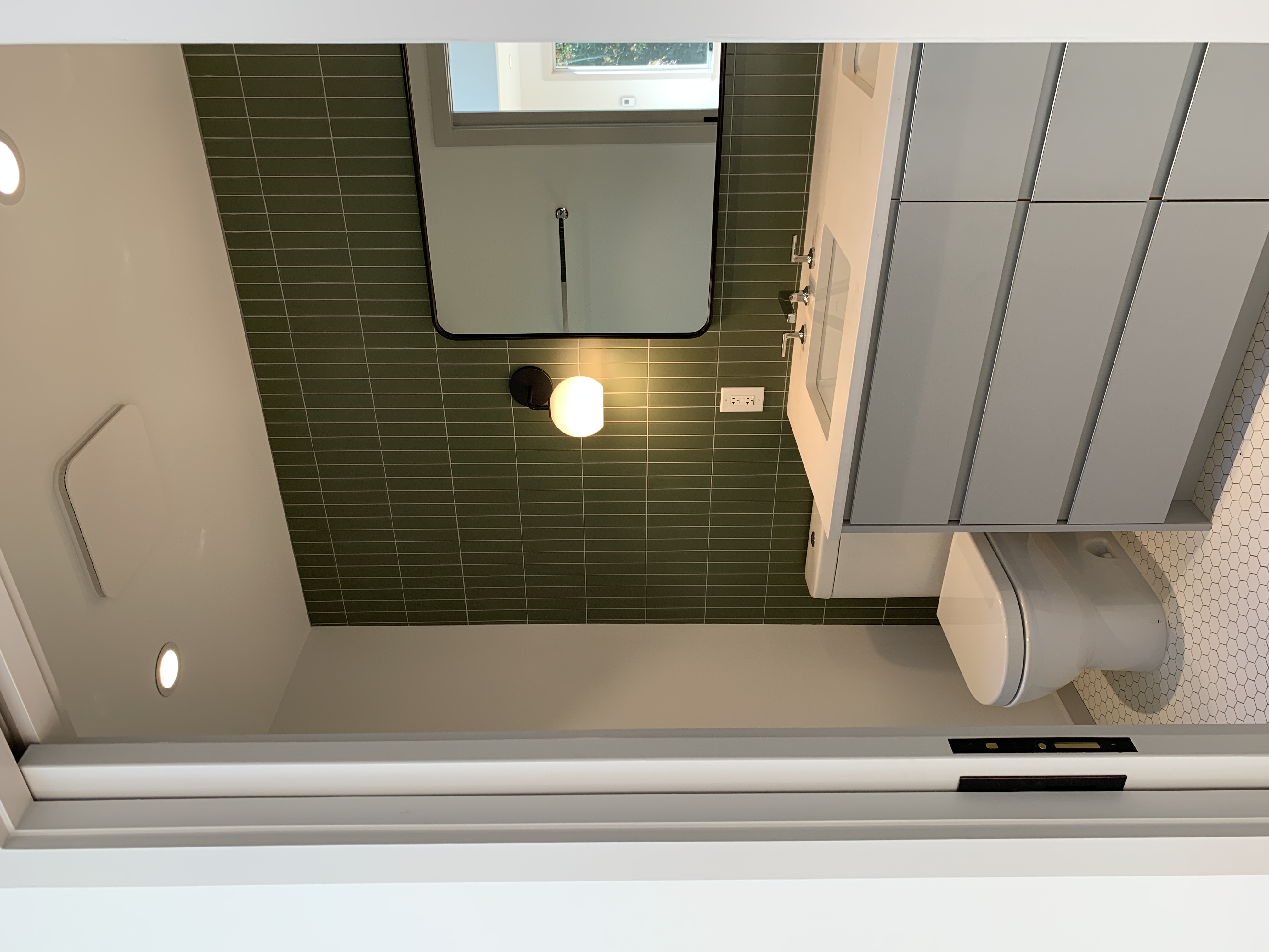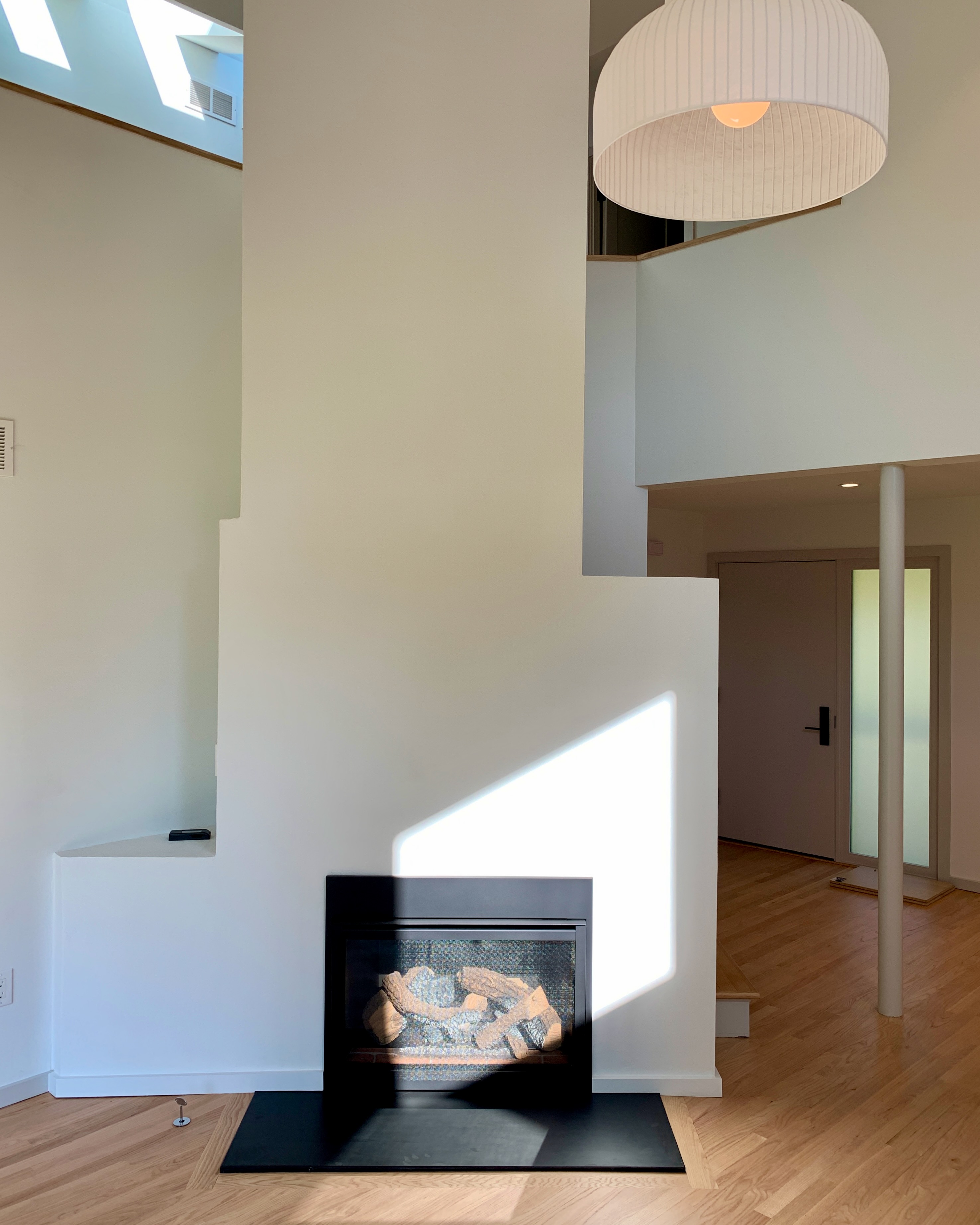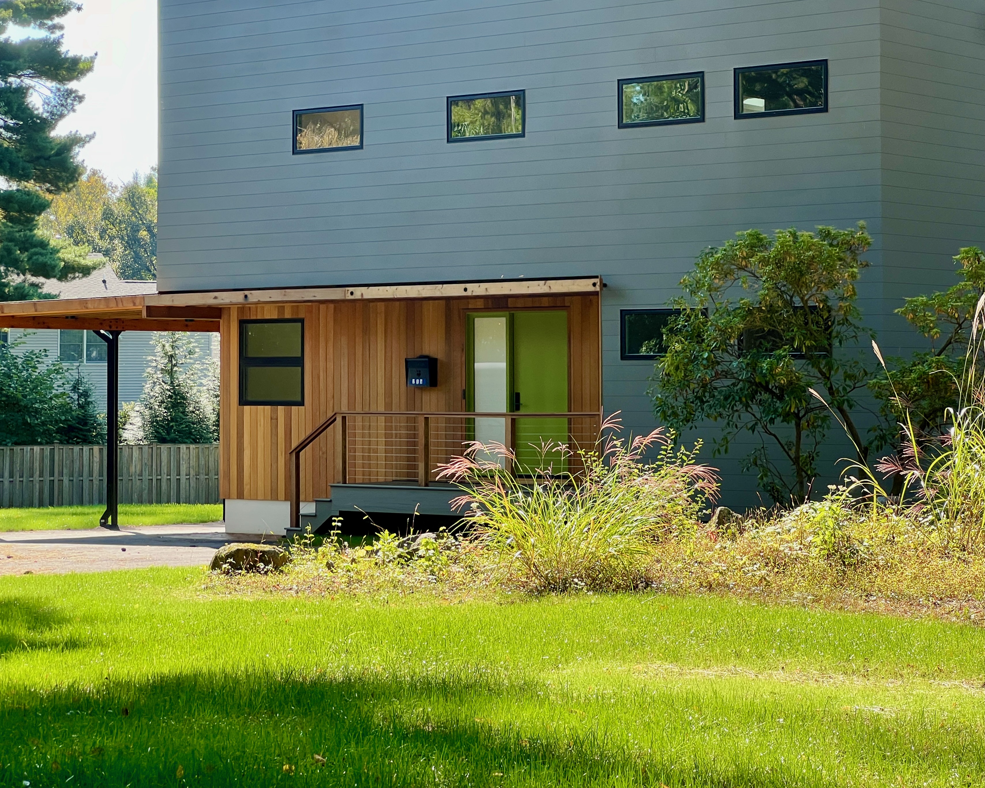 The residence, originally constructed in 1971 and designed by R. Scofidio, had been unoccupied for several years. To revitalize the property, our firm undertook a comprehensive restoration, which included "selective opening" of the first floor and the addition of a full bath and a third bedroom on the second floor to enhance its value. The front of the home presents a tall, rigid mass when viewed from the street, while our design approach prioritized openness, illumination, and integration with the surrounding environment at the rear of the structure. Entry points were accentuated with natural cedar cladding. The interior design scheme used a tranquil palette, clean and understated detailing, and playful pops of color in private areas to complement the mid-century modern aesthetic.
