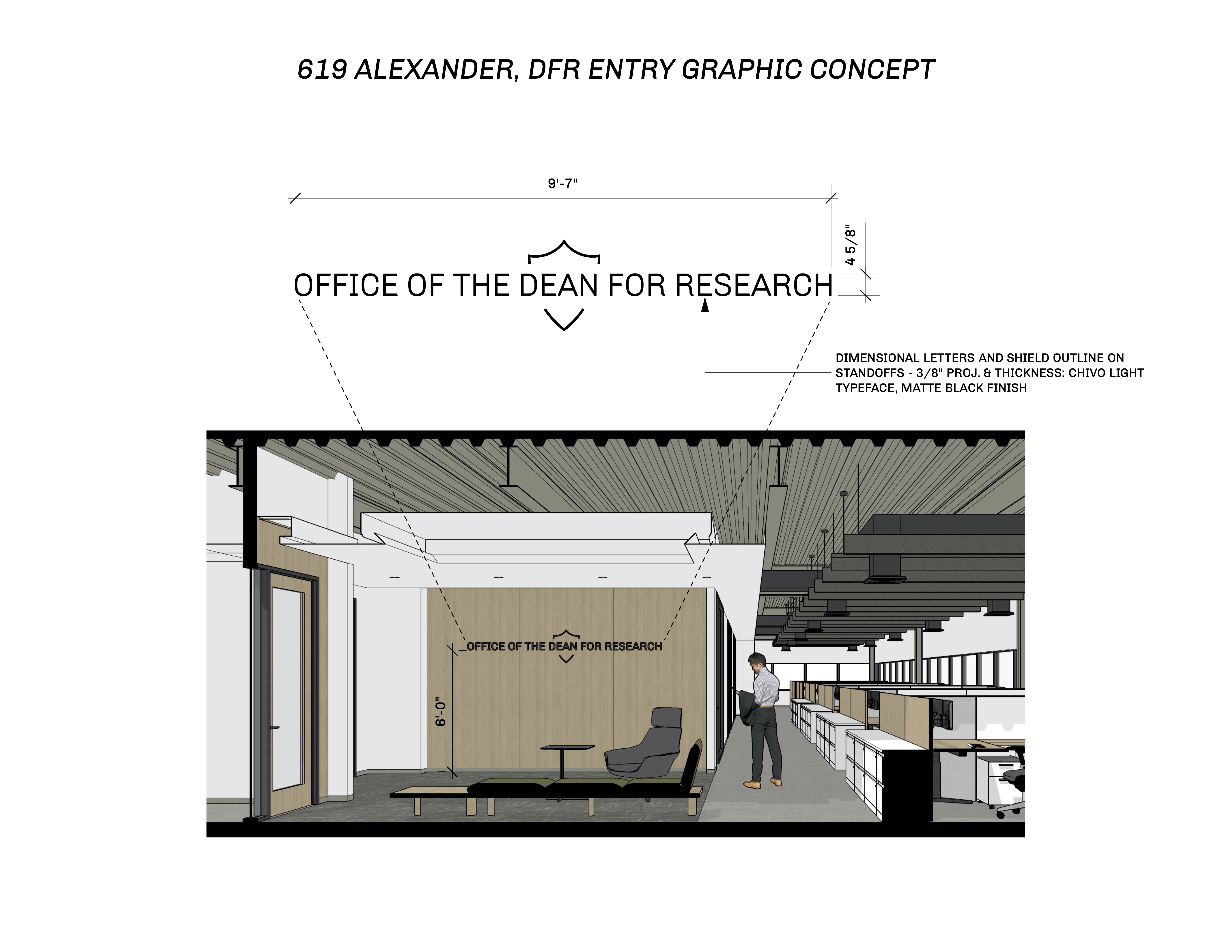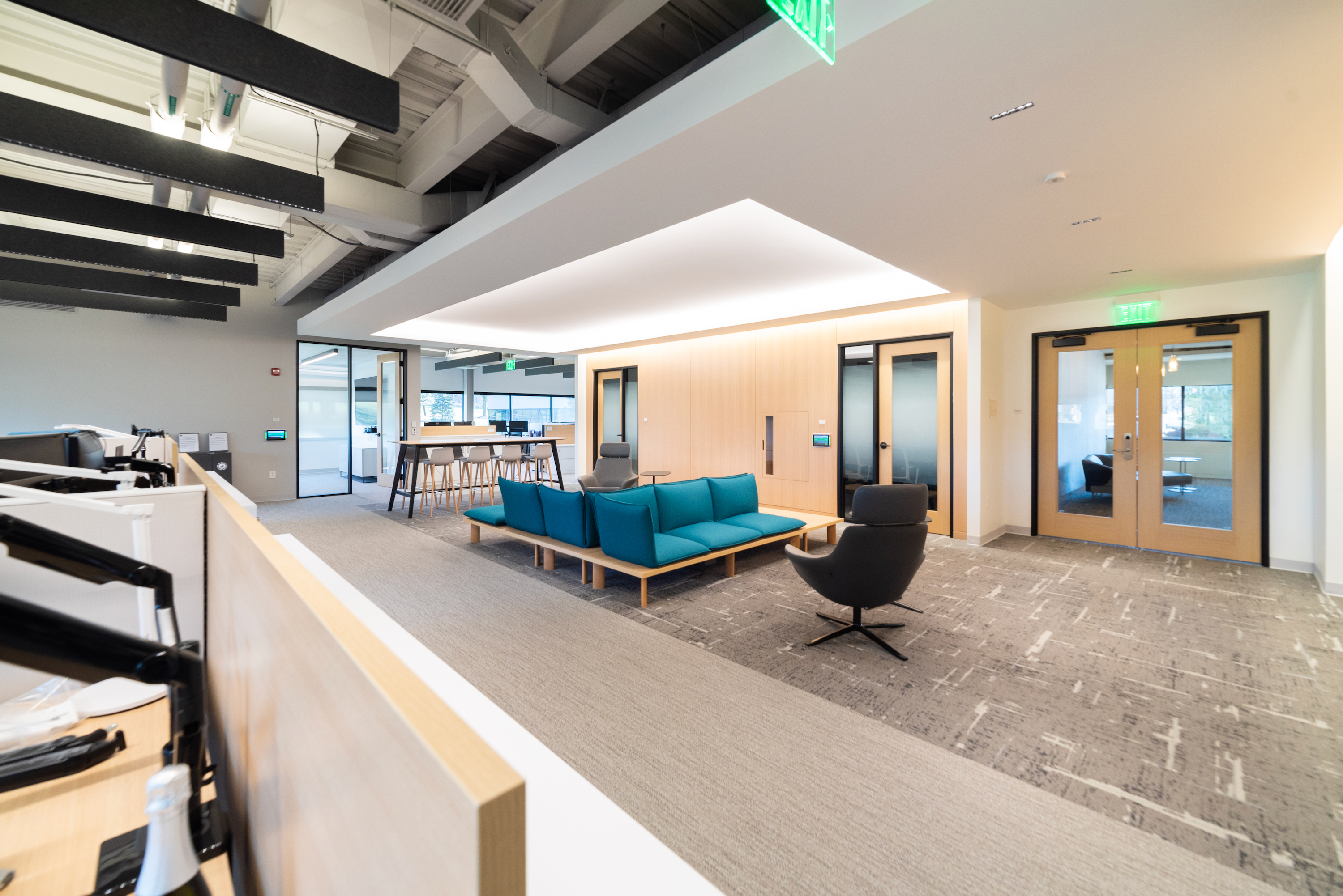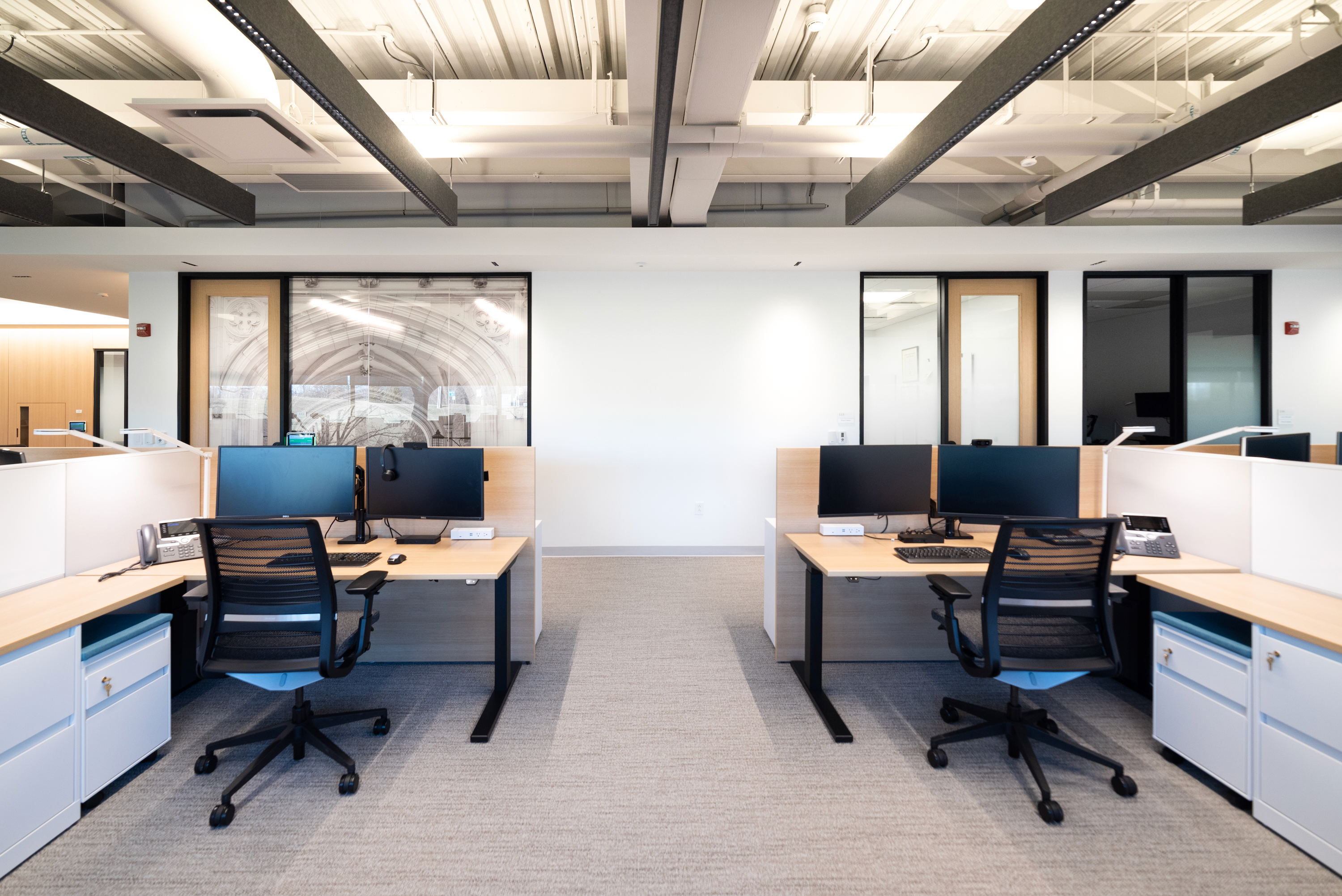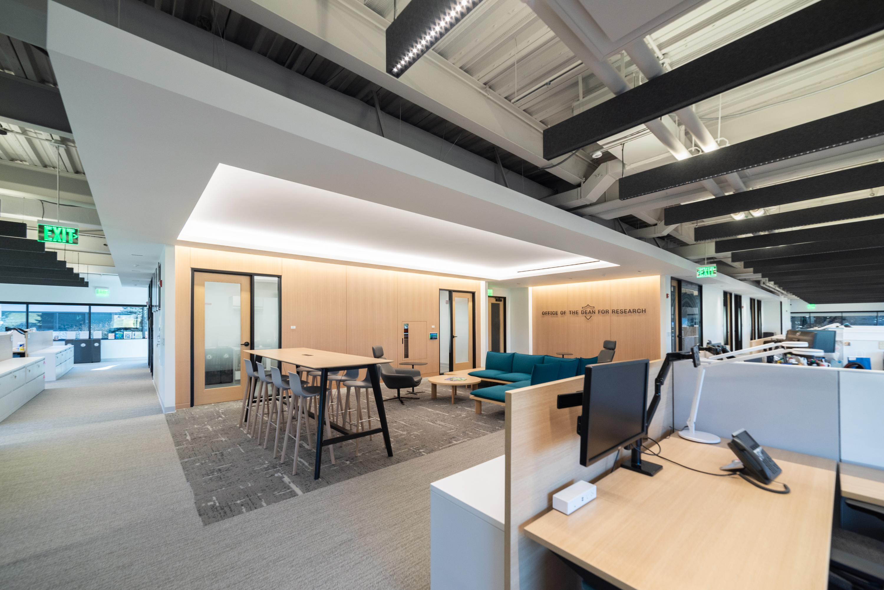 This 6,200 SF office suite was renovated for the Office of the Dean for Research. The floor plan flips workstations and shared spaces to the windows and allows daylight to filter through to the interior offices. The entry features an illuminated ceiling cove and rift sawn white oak wall panels. Infrastructure was carefully organized and felt clad pendant lights were utilized to increase acoustic comfort in the open work areas.