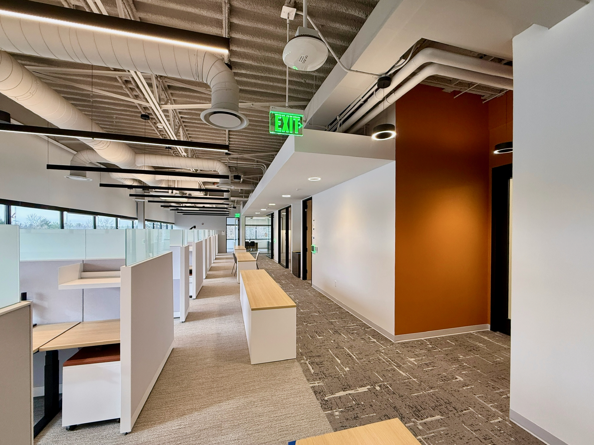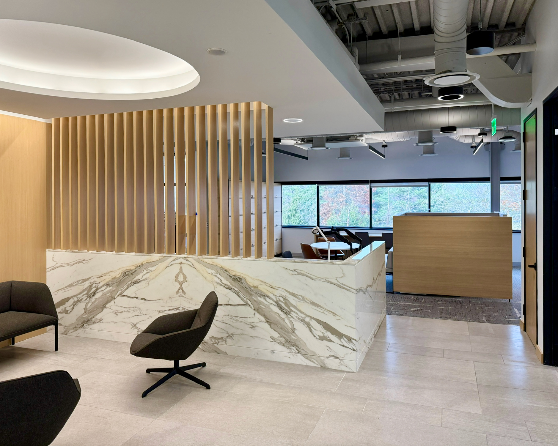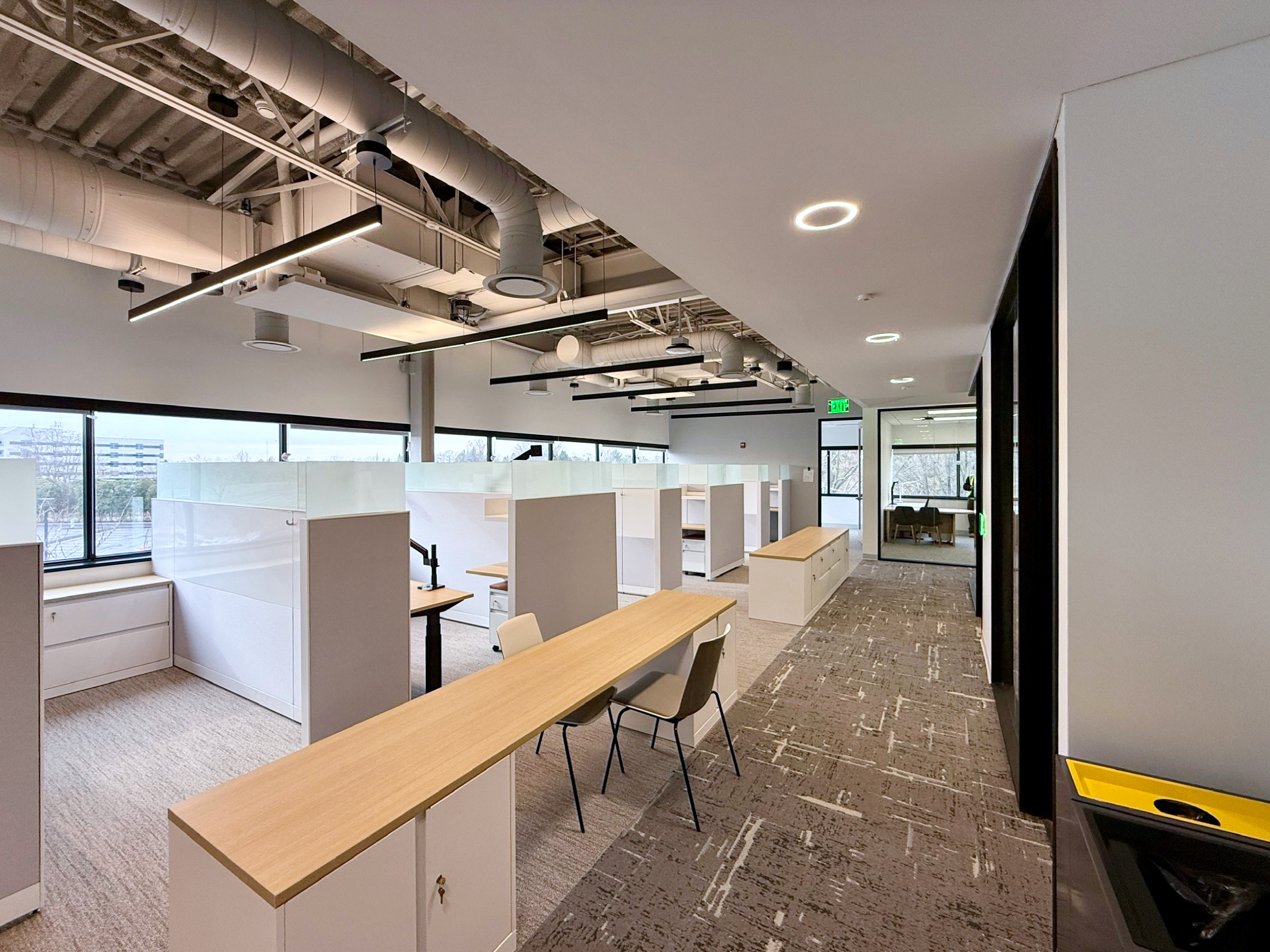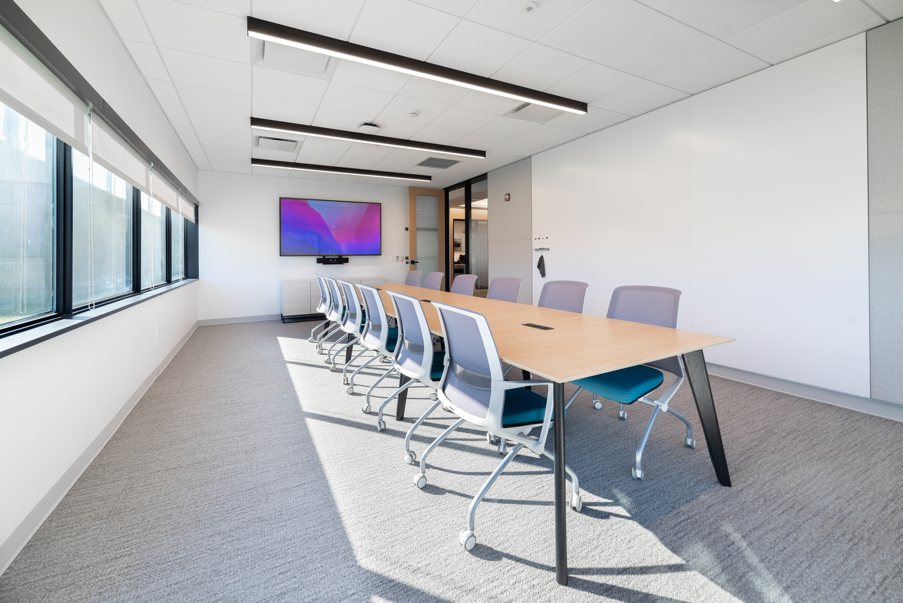 This 6,200 SF office suite was renovated for the Office of the Dean for Research. The floor plan flips workstations and shared spaces to the windows and allows daylight to filter through to the interior offices. The entry features an illuminated ceiling cove and rift sawn white oak wall panels. Infrastructure was carefully organized and felt clad pendant lights were utilized to increase acoustic comfort in the open work areas.