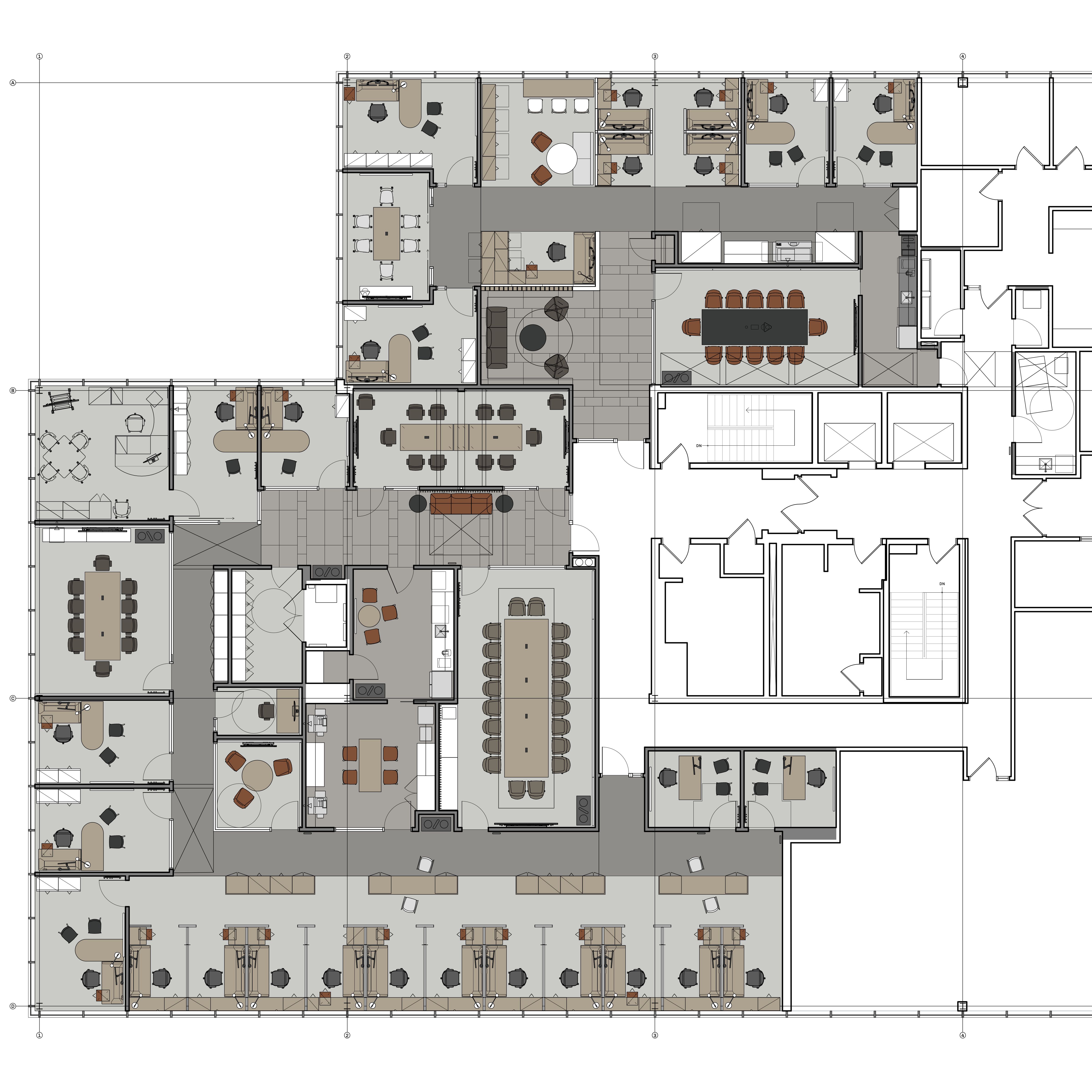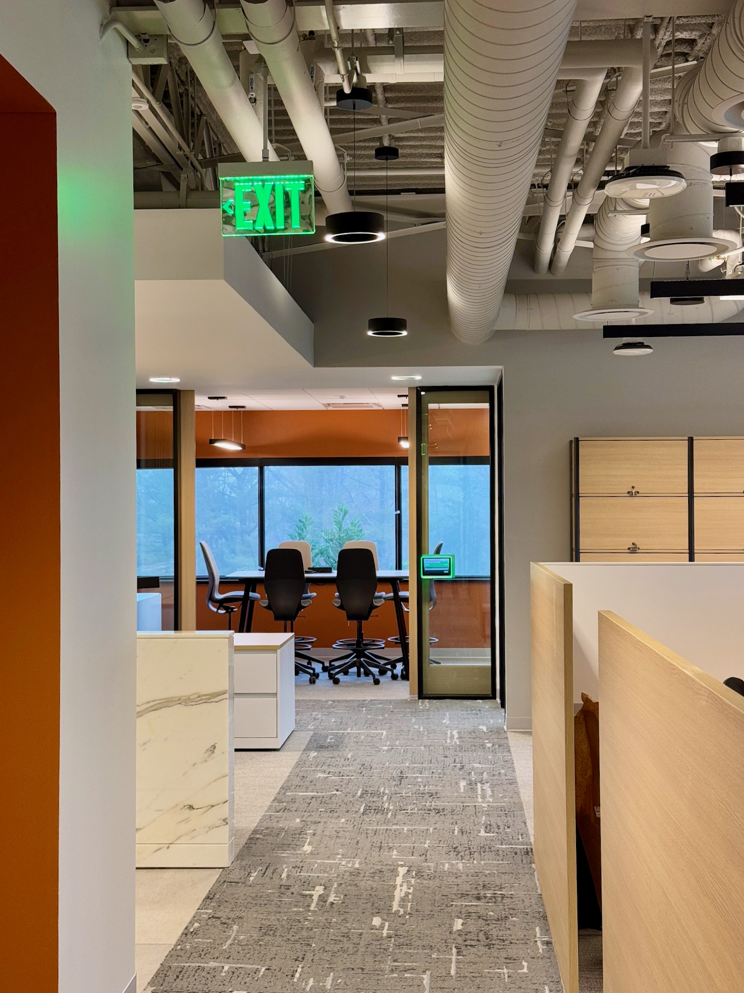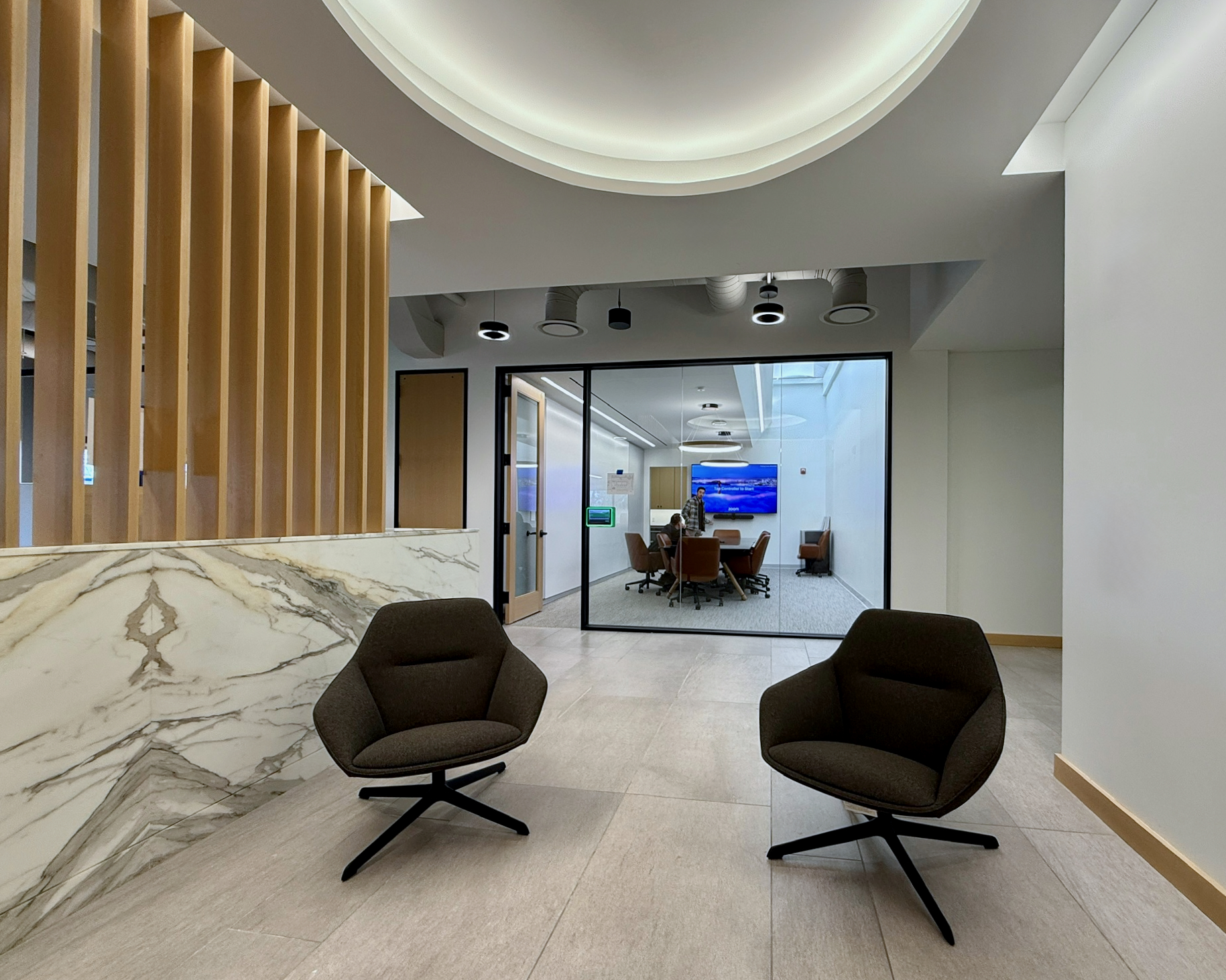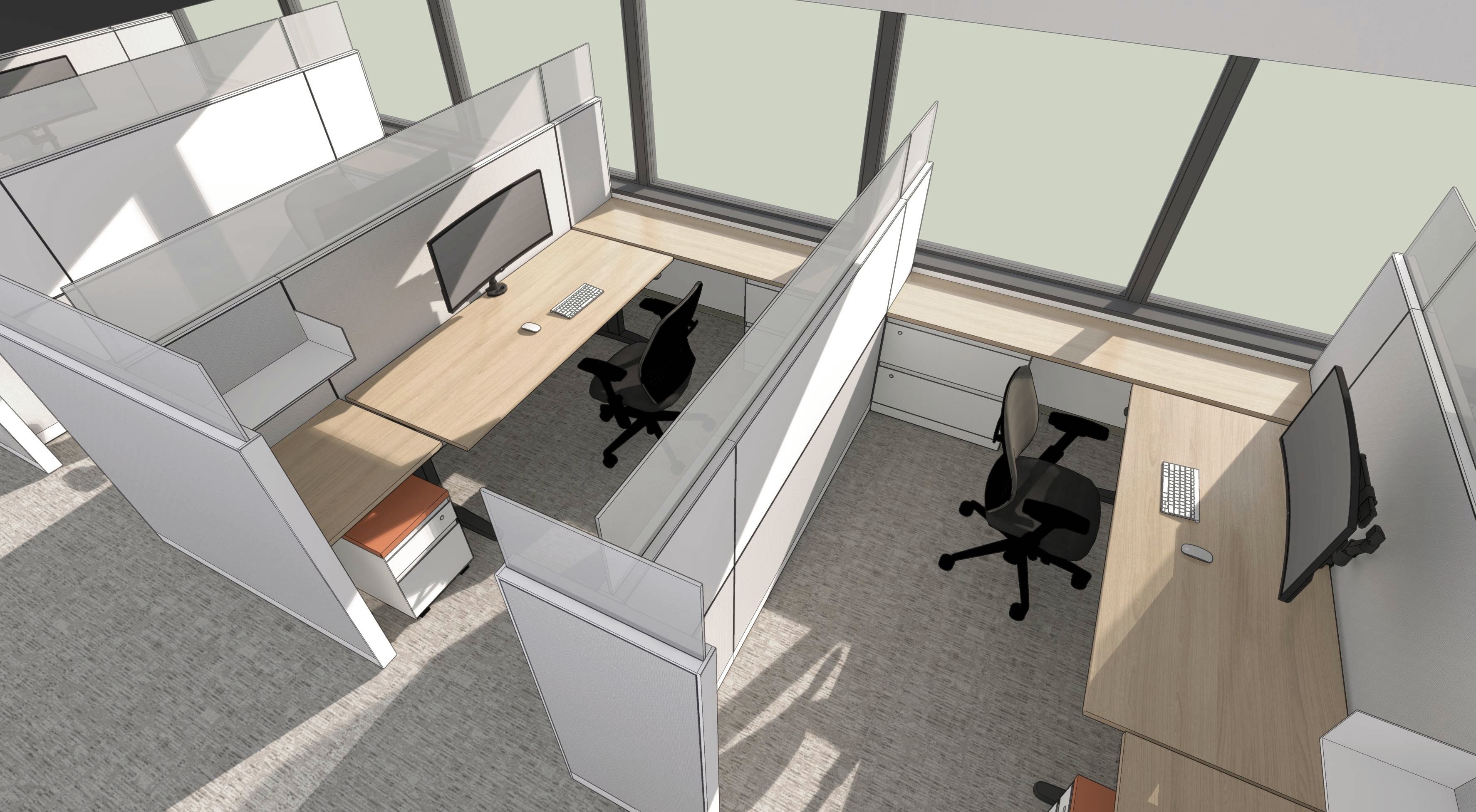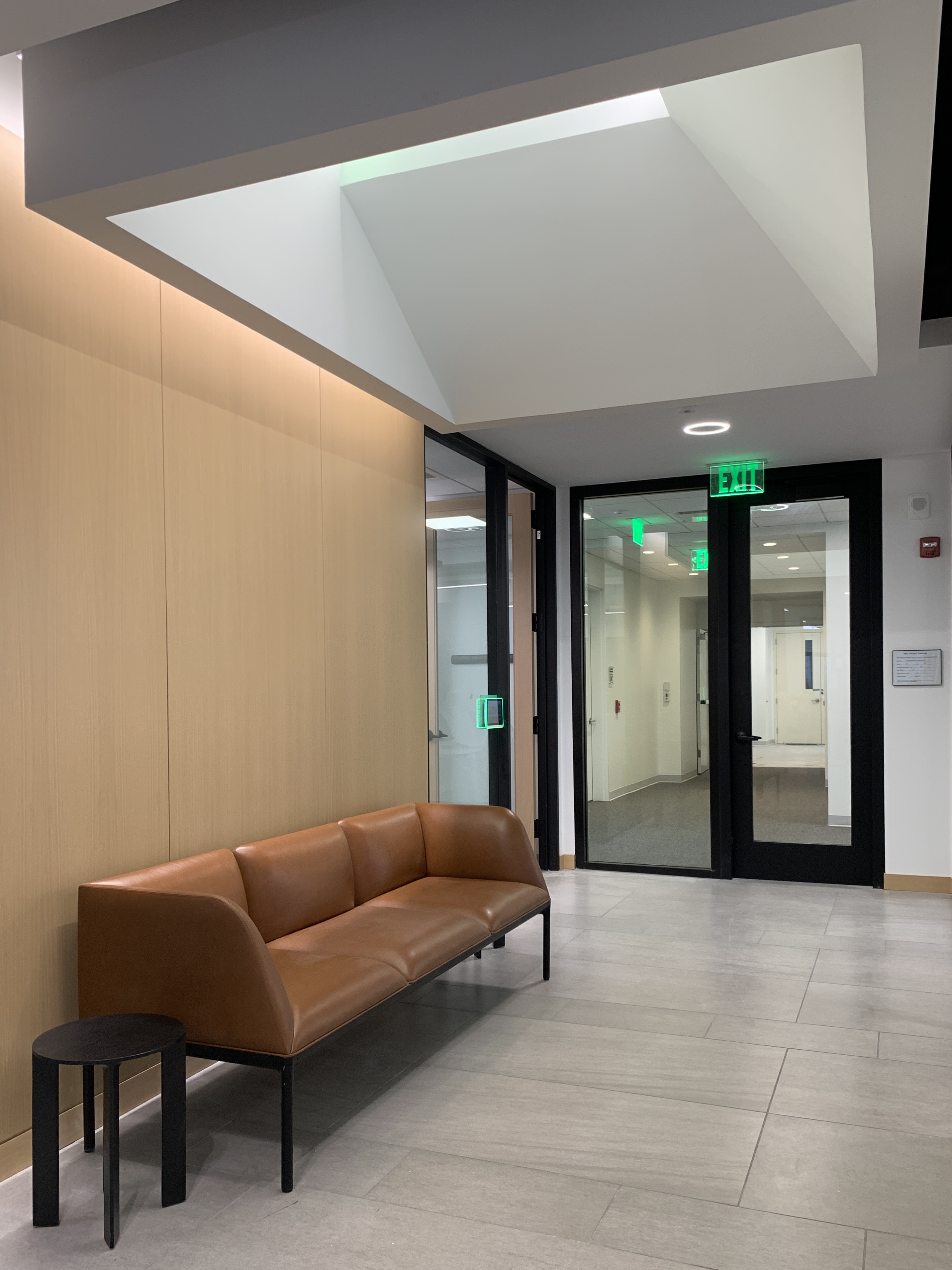 This 6,200 SF office suite was renovated for the Office of the Dean for Research. The floor plan flips workstations and shared spaces to the windows and allows daylight to filter through to the interior offices. The entry features an illuminated ceiling cove and rift sawn white oak wall panels. Infrastructure was carefully organized and felt clad pendant lights were utilized to increase acoustic comfort in the open work areas.