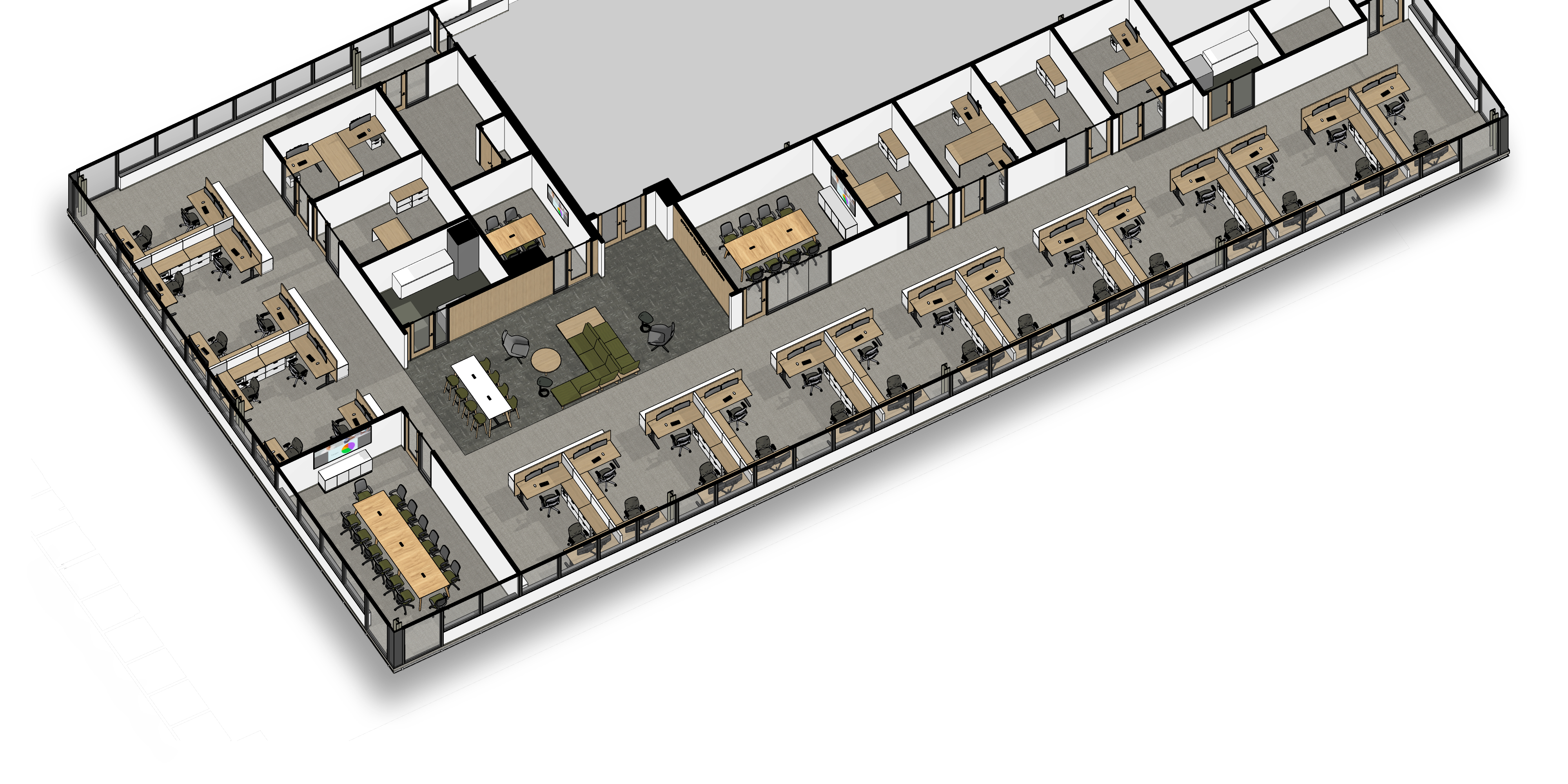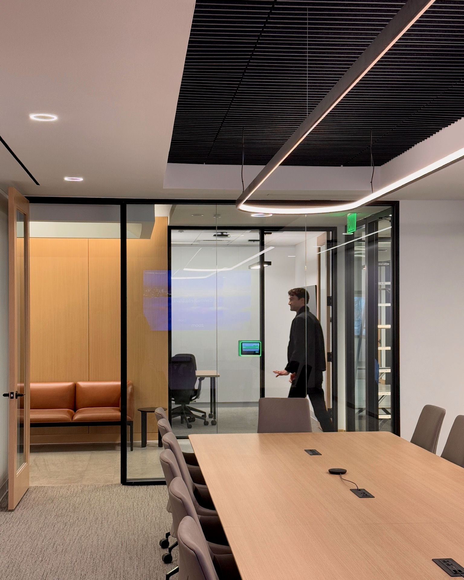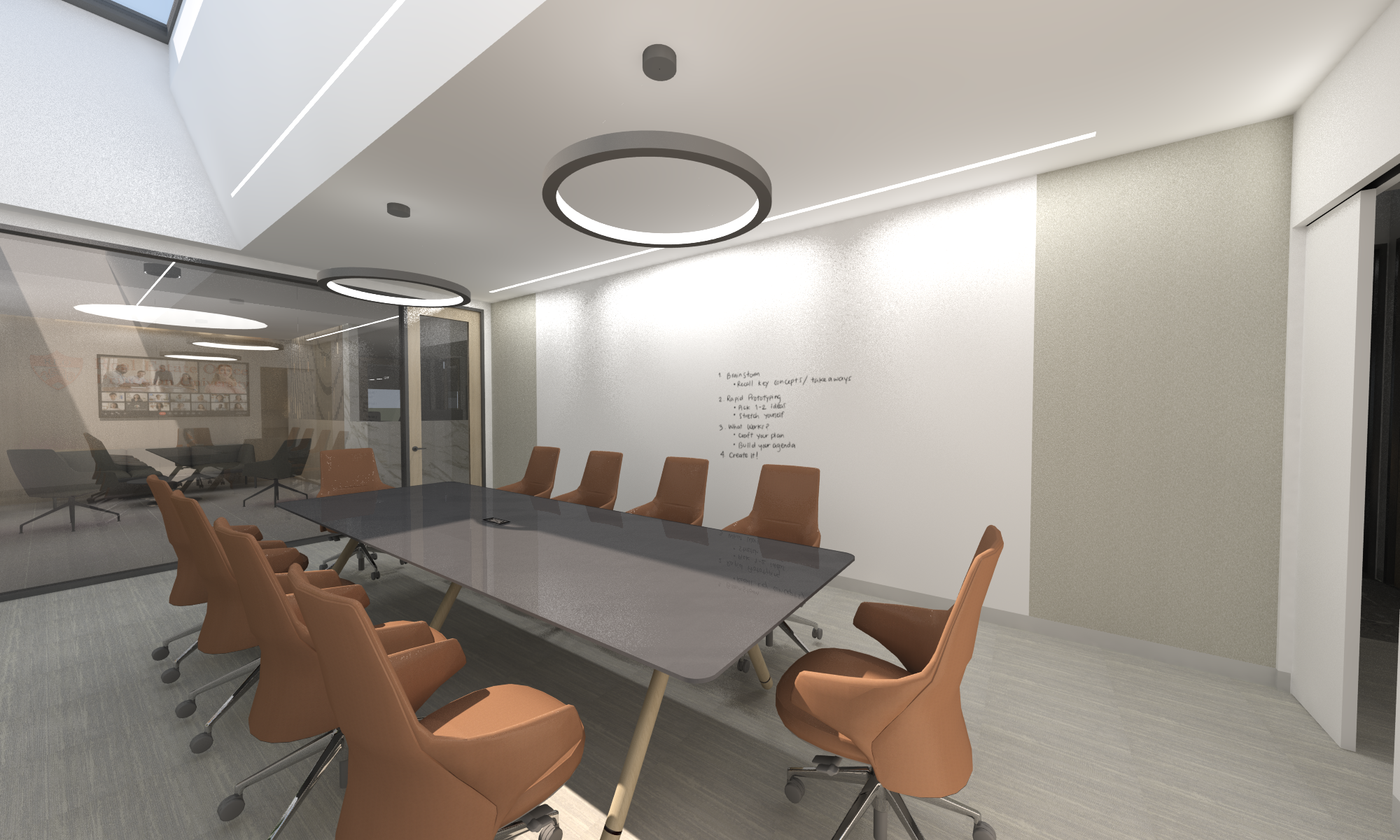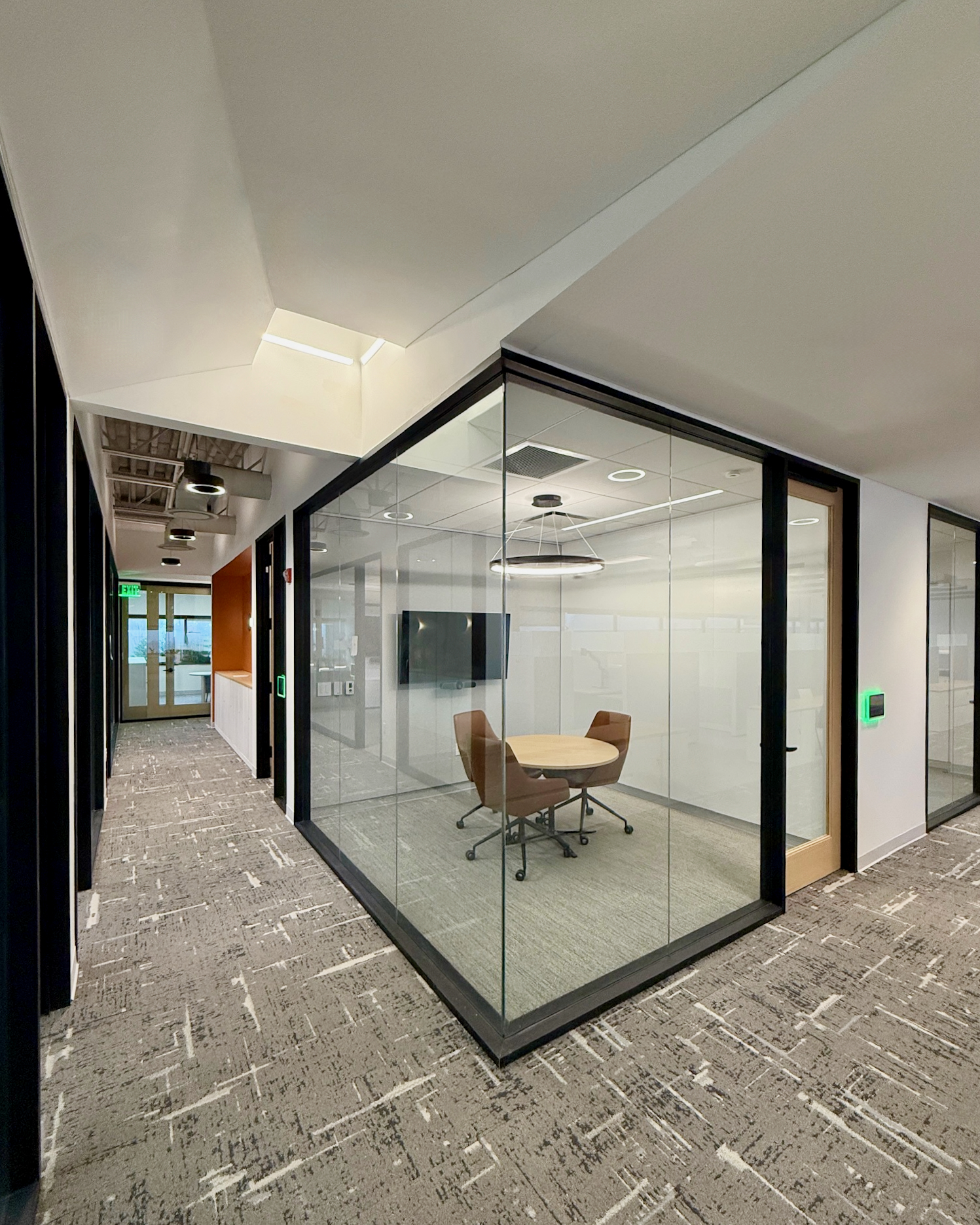 This 6,200 SF office suite was renovated for the Office of the Dean for Research. The floor plan flips workstations and shared spaces to the windows and allows daylight to filter through to the interior offices. The entry features an illuminated ceiling cove and rift sawn white oak wall panels. Infrastructure was carefully organized and felt clad pendant lights were utilized to increase acoustic comfort in the open work areas.