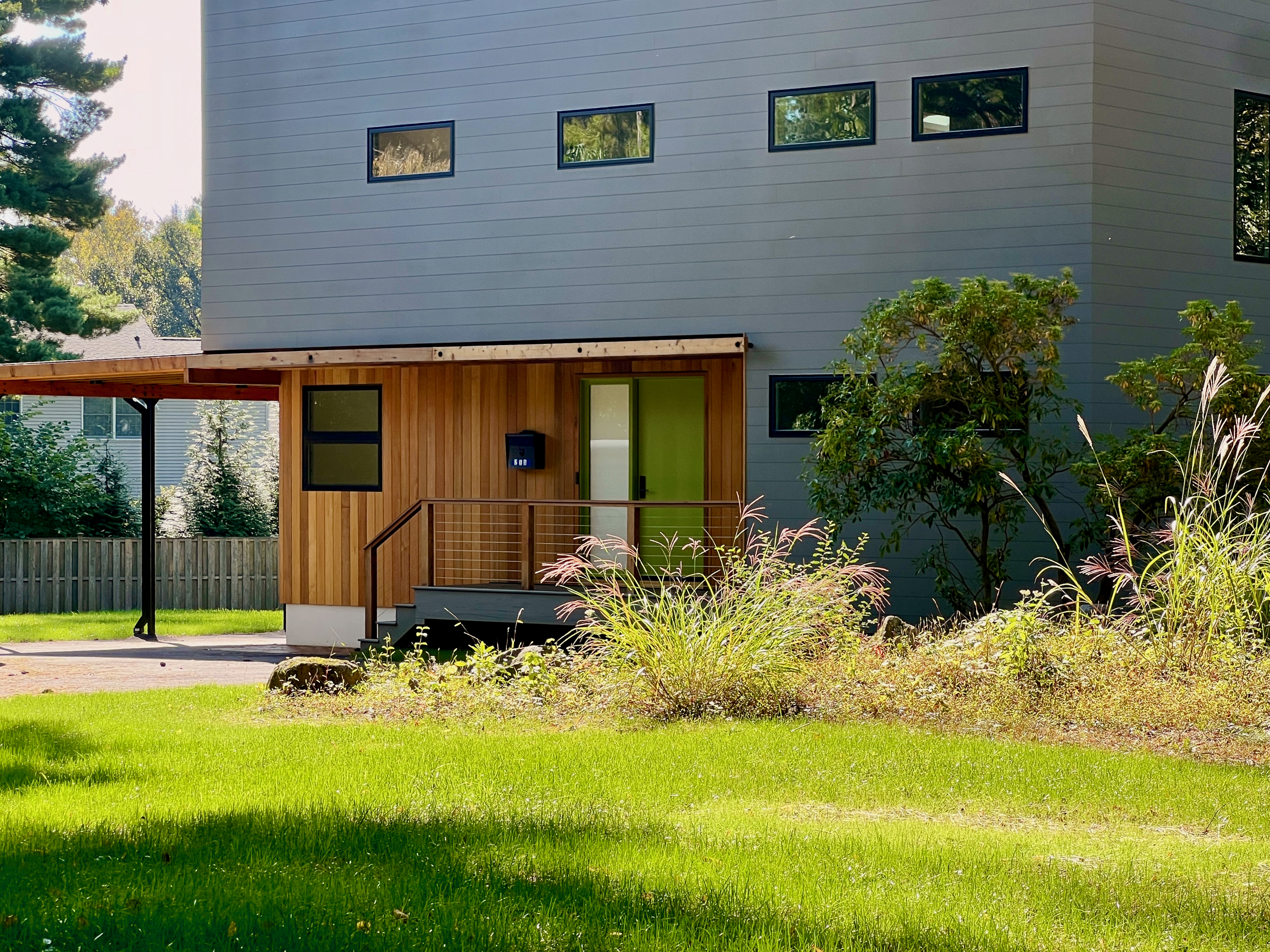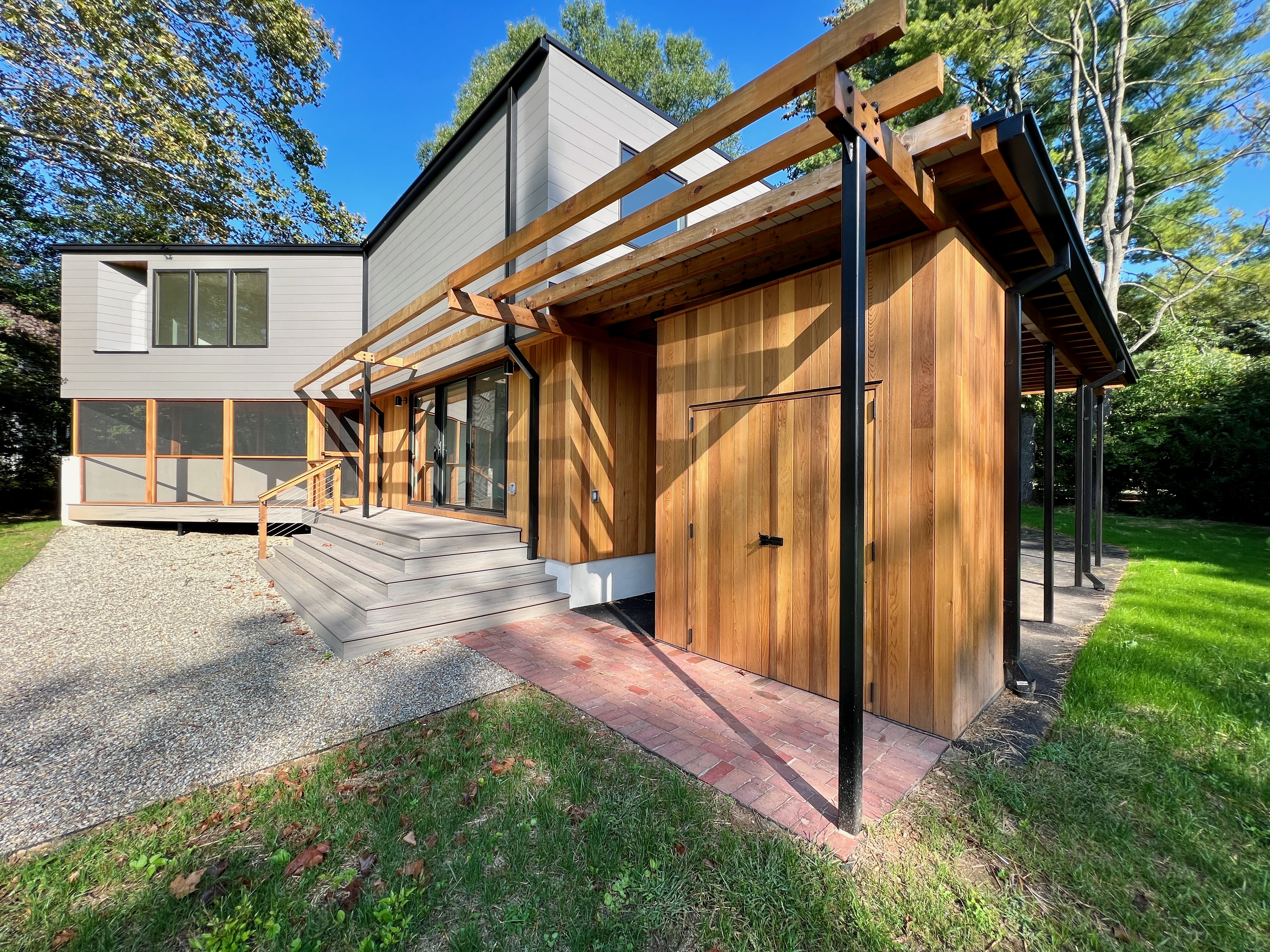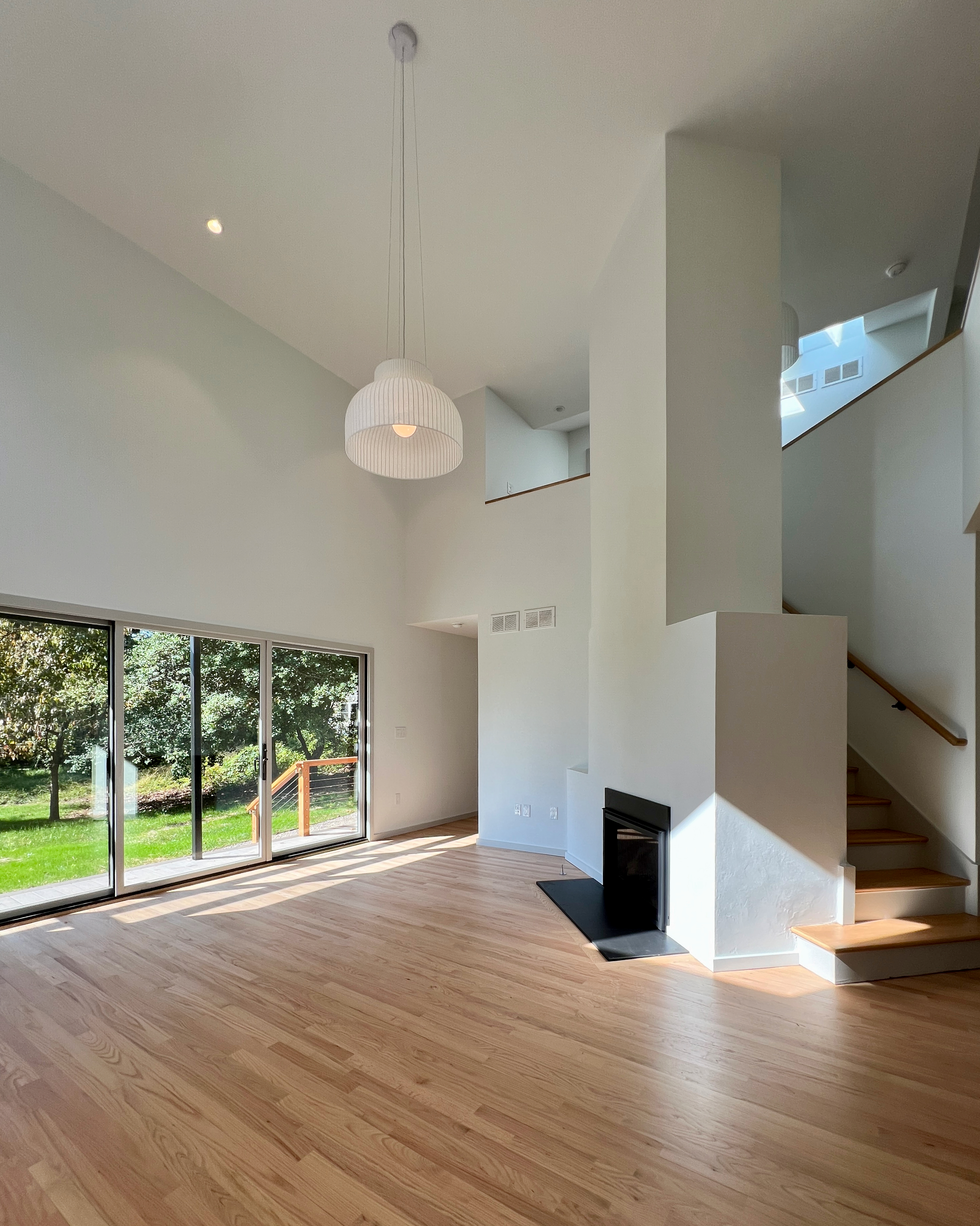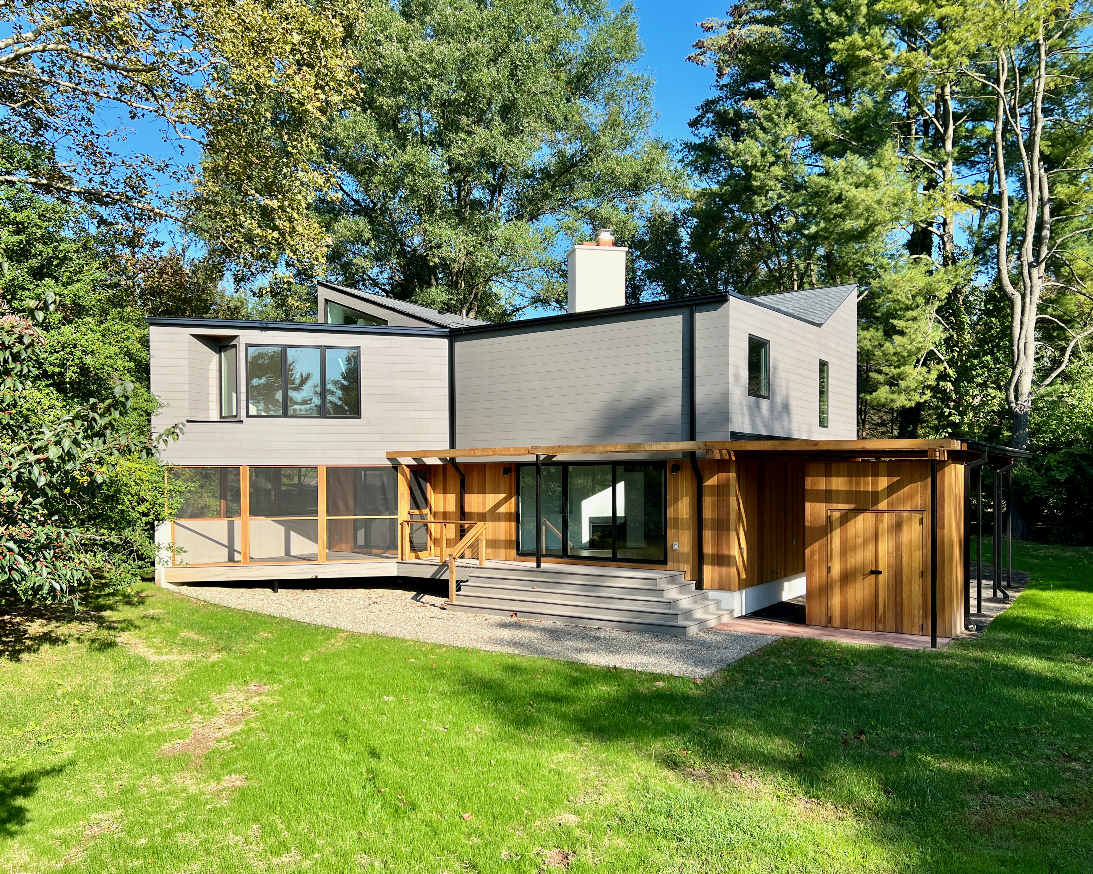 The residence, originally constructed in 1971 and designed by R. Scofidio, had been unoccupied for several years. To revitalize the property, our firm undertook a comprehensive restoration, which included "selective opening" of the first floor and the addition of a full bath and a third bedroom on the second floor to enhance its value. The front of the home presents a tall, rigid mass when viewed from the street, while our design approach prioritized openness, illumination, and integration with the surrounding environment at the rear of the structure. Entry points were accentuated with natural cedar cladding. The interior design scheme used a tranquil palette, clean and understated detailing, and playful pops of color in private areas to complement the mid-century modern aesthetic.