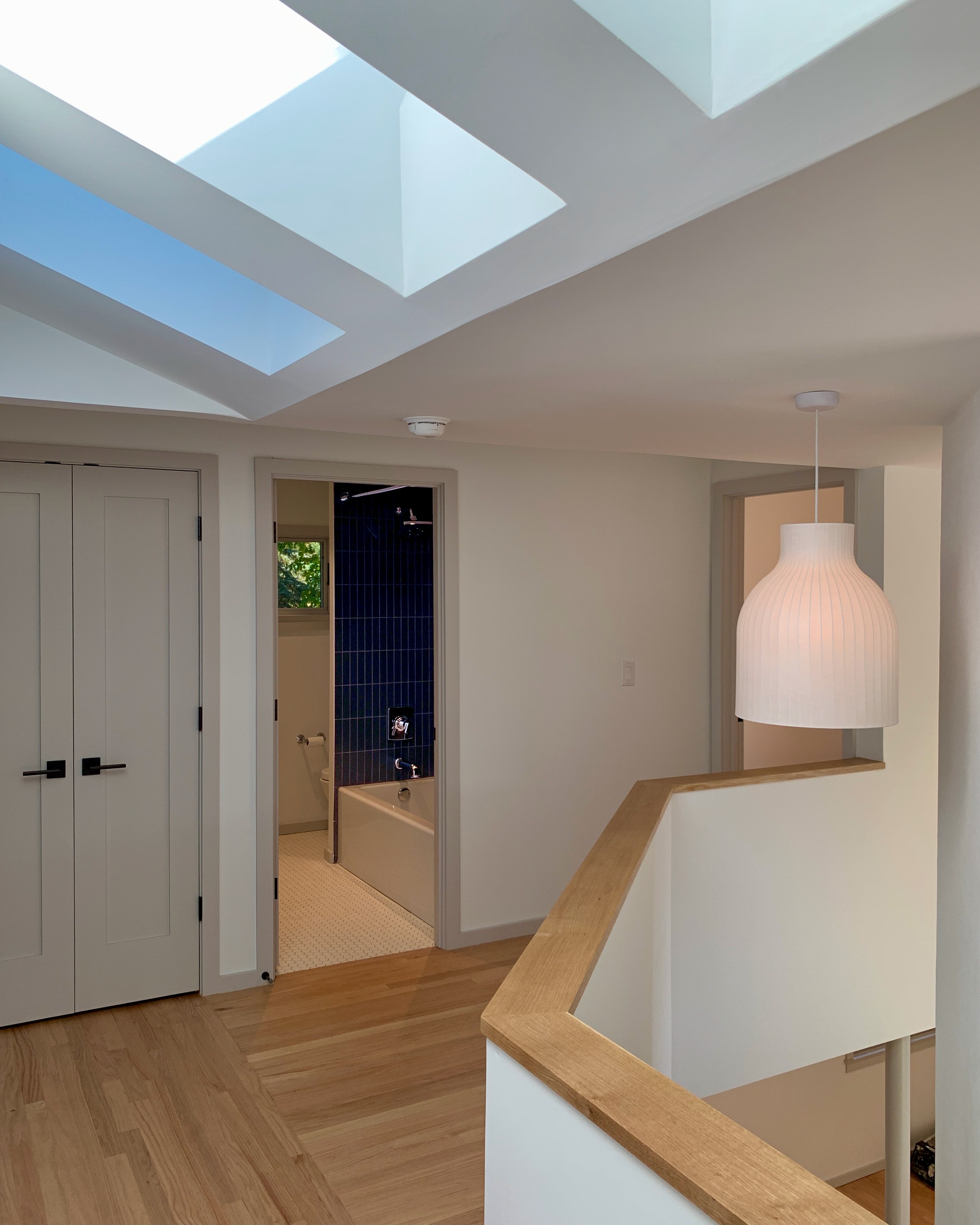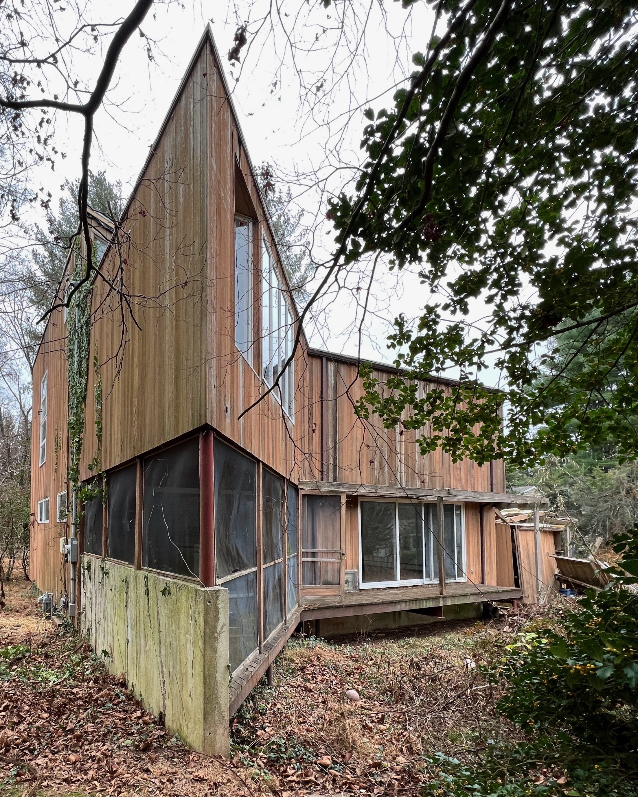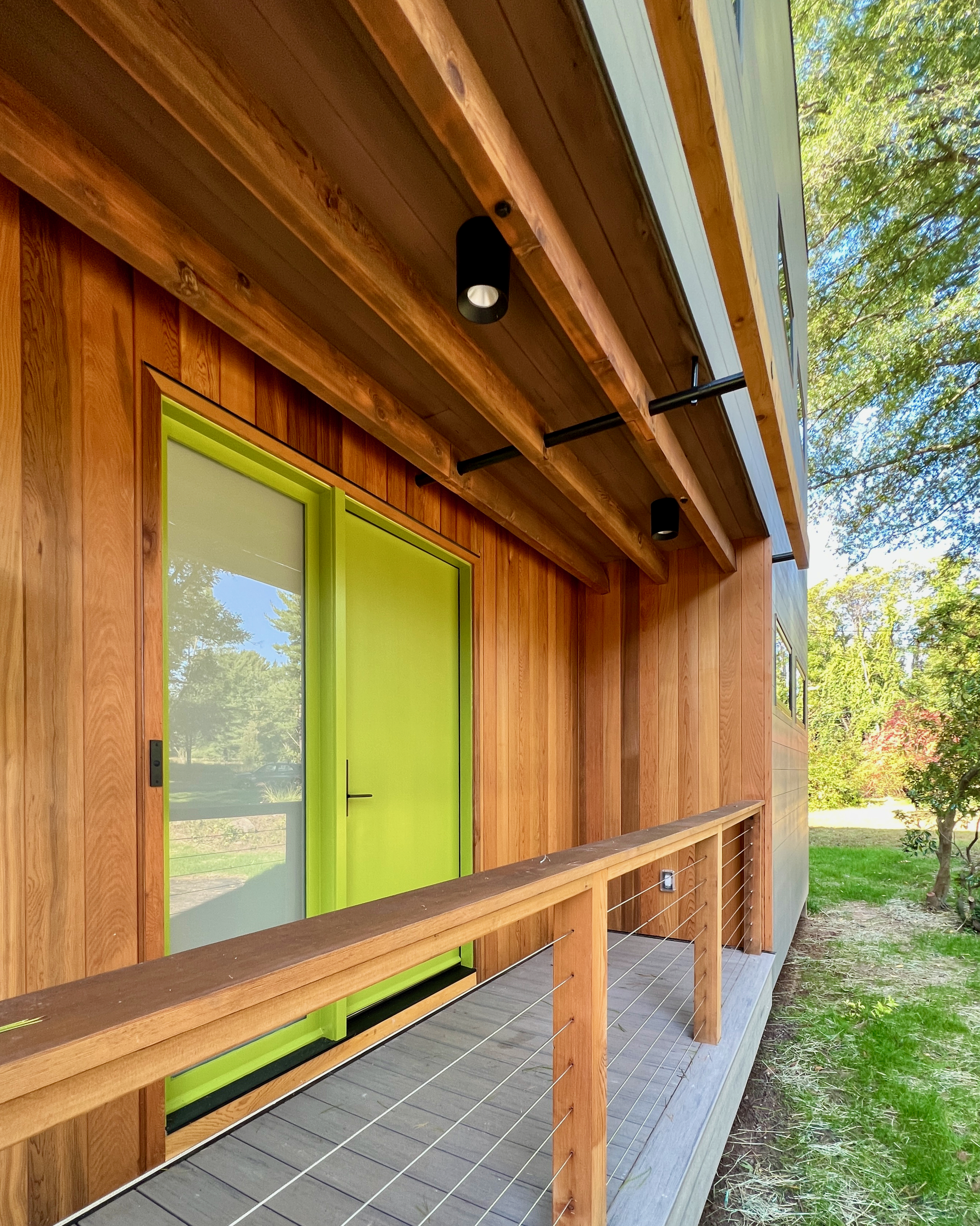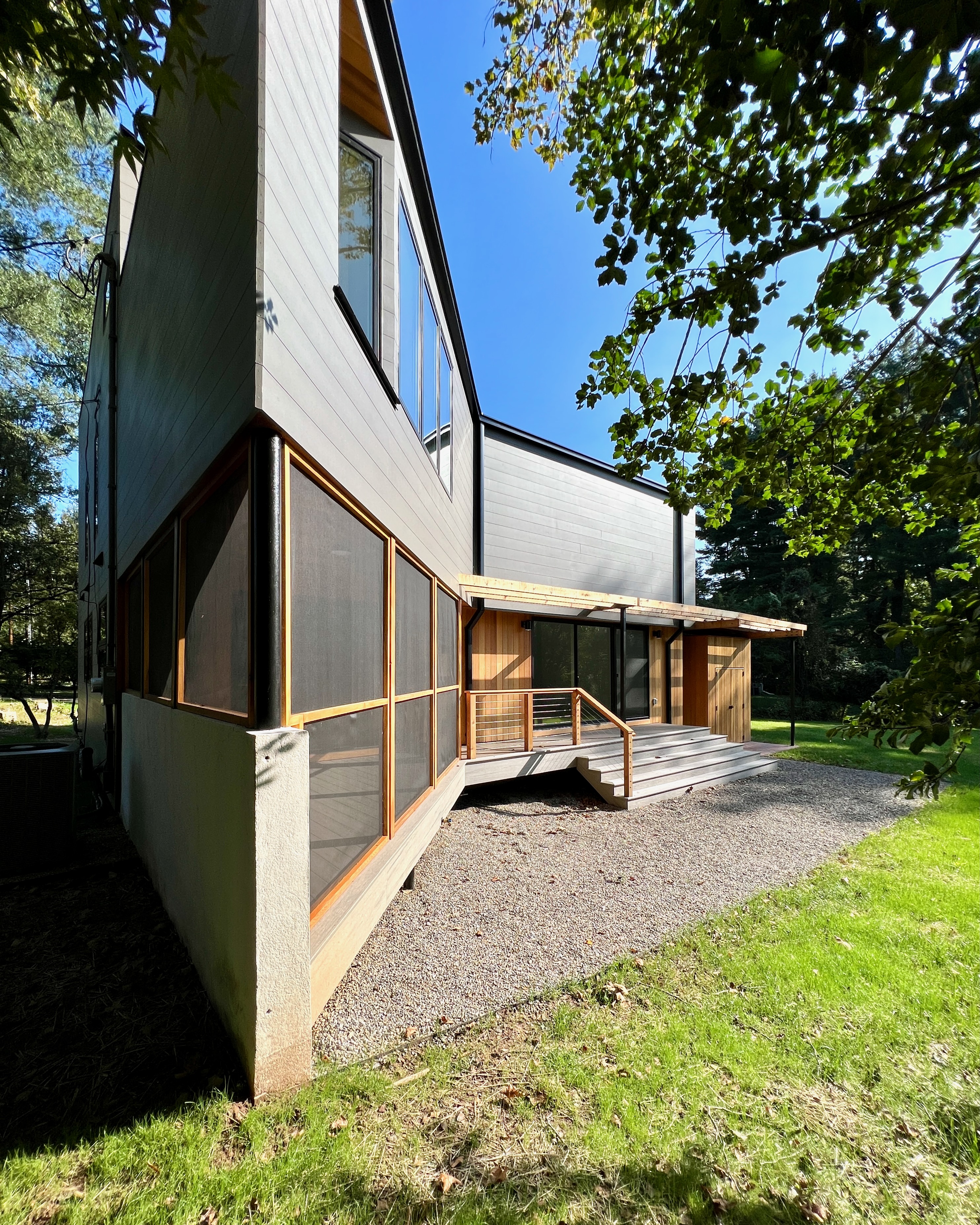 The residence, originally constructed in 1971 and designed by R. Scofidio, had been unoccupied for several years. To revitalize the property, our firm undertook a comprehensive restoration, which included "selective opening" of the first floor and the addition of a full bath and a third bedroom on the second floor to enhance its value. The front of the home presents a tall, rigid mass when viewed from the street, while our design approach prioritized openness, illumination, and integration with the surrounding environment at the rear of the structure. Entry points were accentuated with natural cedar cladding. The interior design scheme used a tranquil palette, clean and understated detailing, and playful pops of color in private areas to complement the mid-century modern aesthetic.