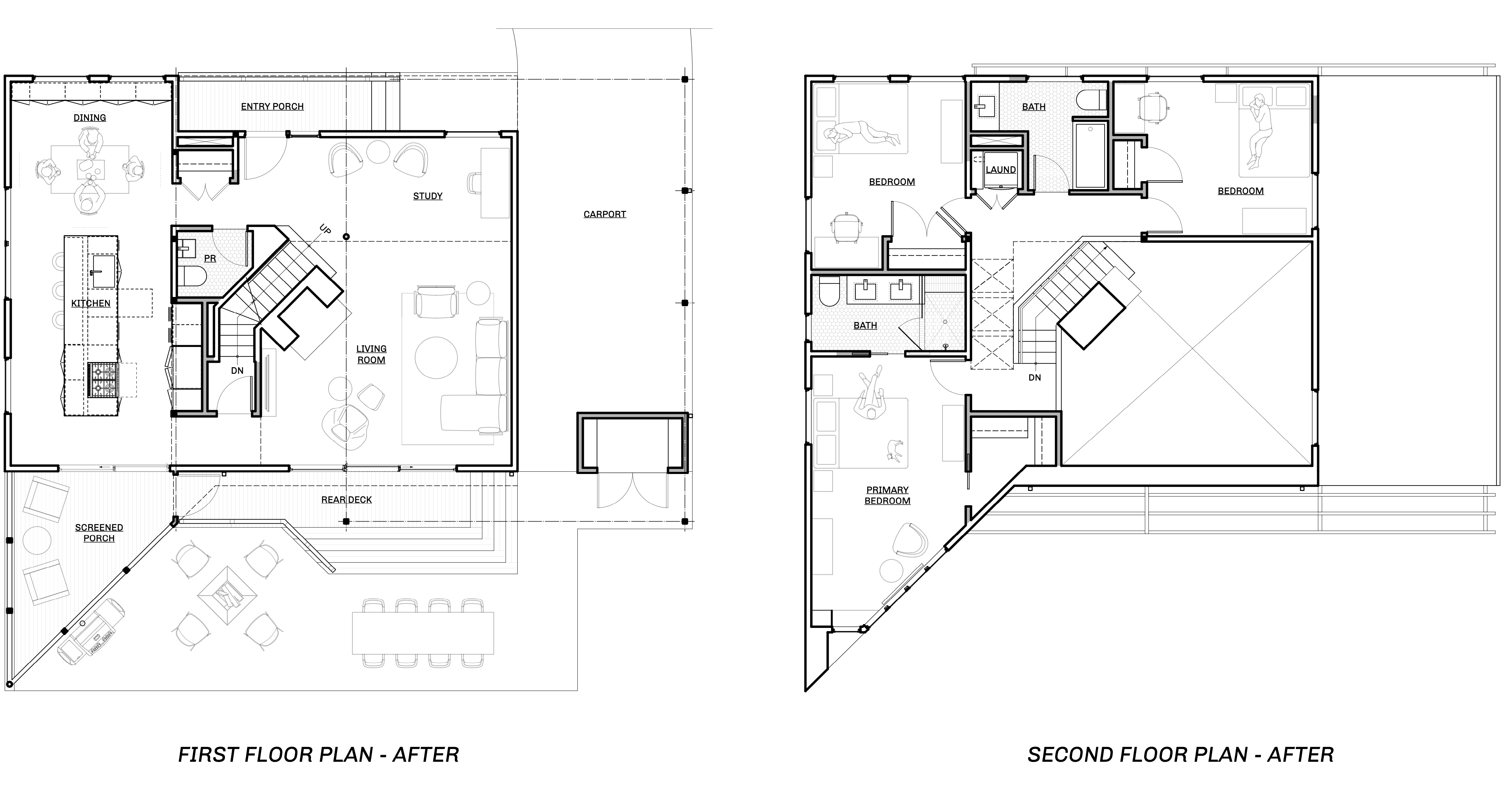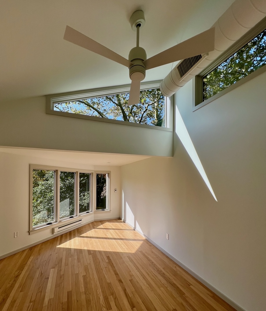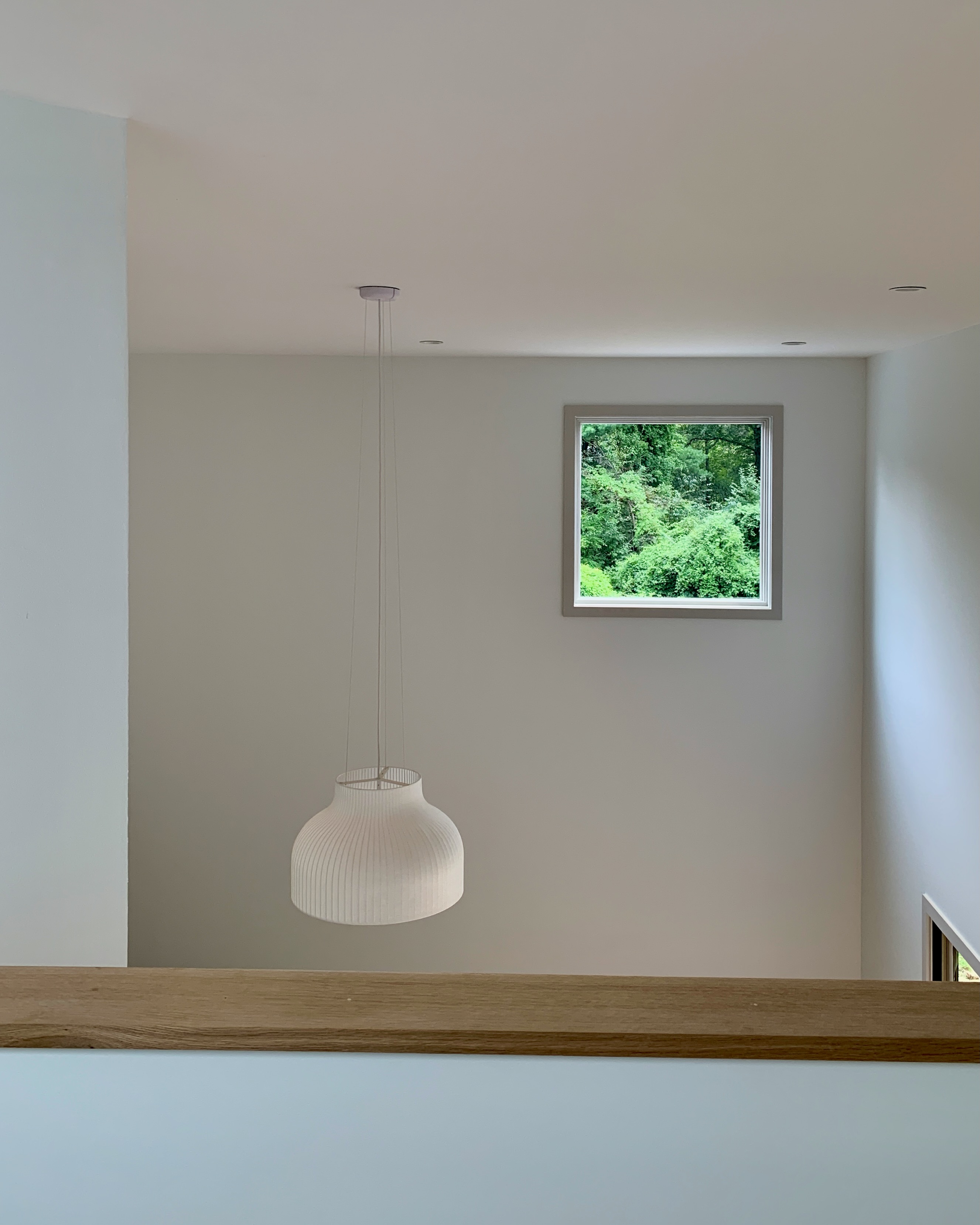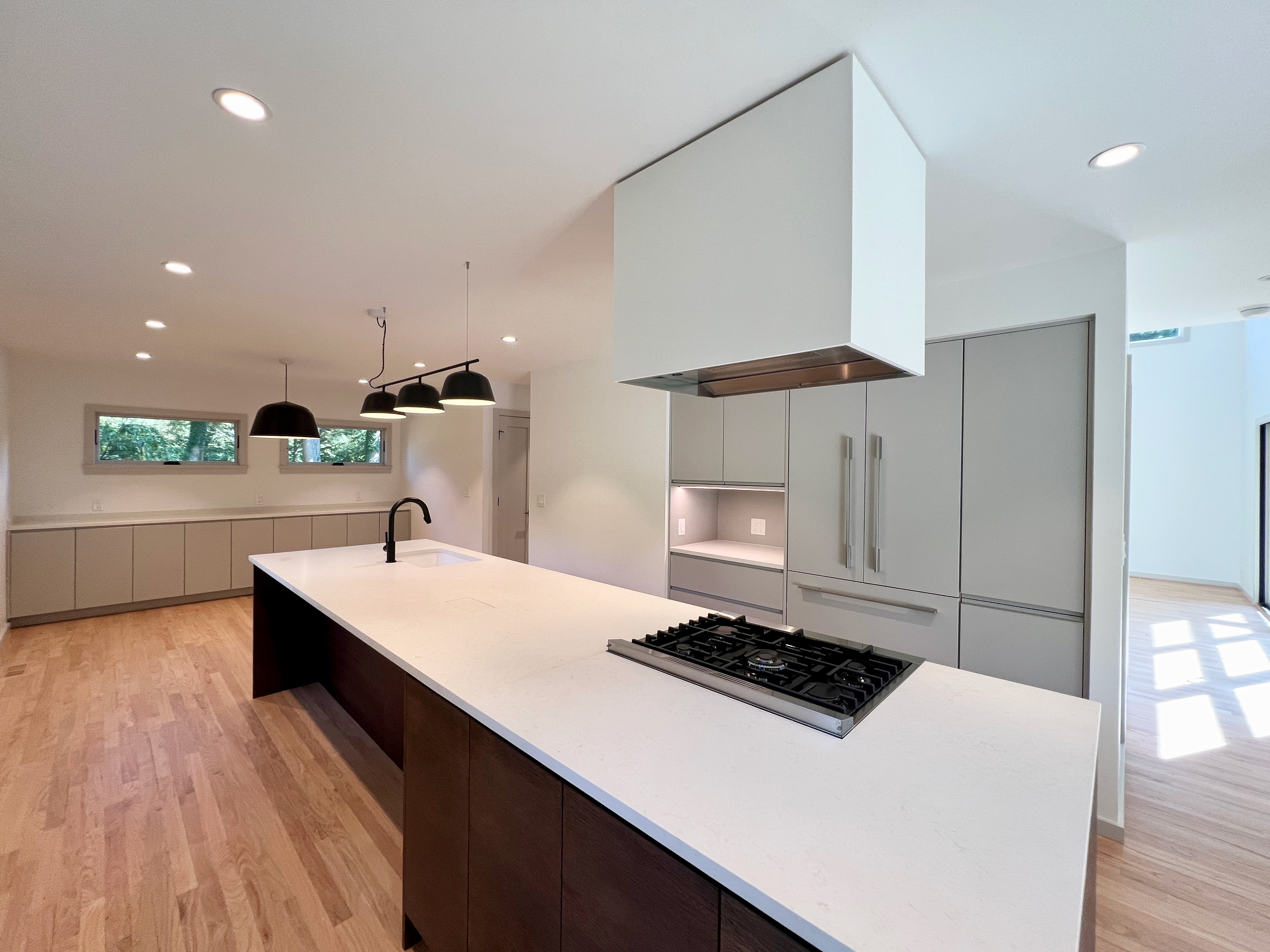 The residence, originally constructed in 1971 and designed by R. Scofidio, had been unoccupied for several years. To revitalize the property, our firm undertook a comprehensive restoration, which included "selective opening" of the first floor and the addition of a full bath and a third bedroom on the second floor to enhance its value. The front of the home presents a tall, rigid mass when viewed from the street, while our design approach prioritized openness, illumination, and integration with the surrounding environment at the rear of the structure. Entry points were accentuated with natural cedar cladding. The interior design scheme used a tranquil palette, clean and understated detailing, and playful pops of color in private areas to complement the mid-century modern aesthetic.