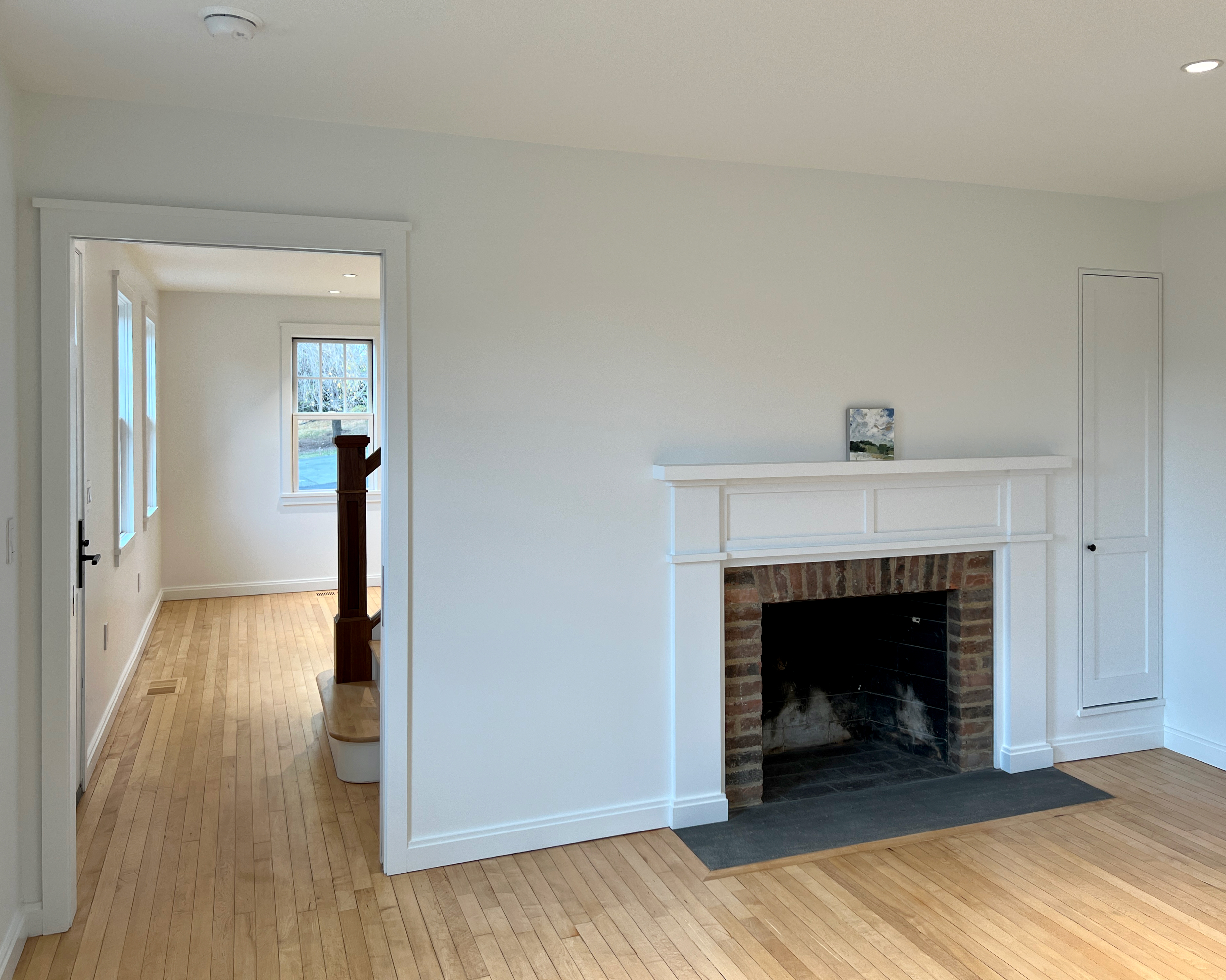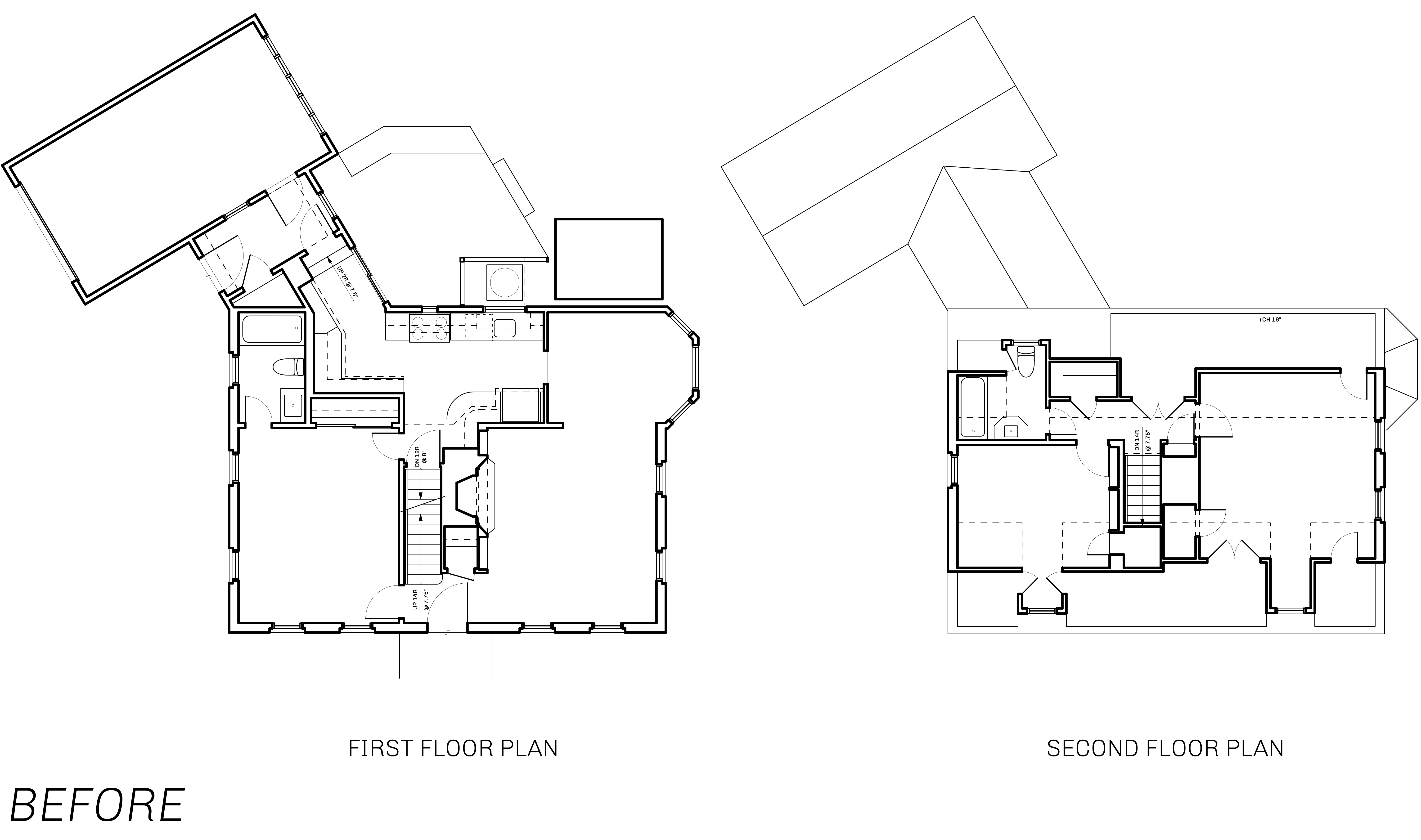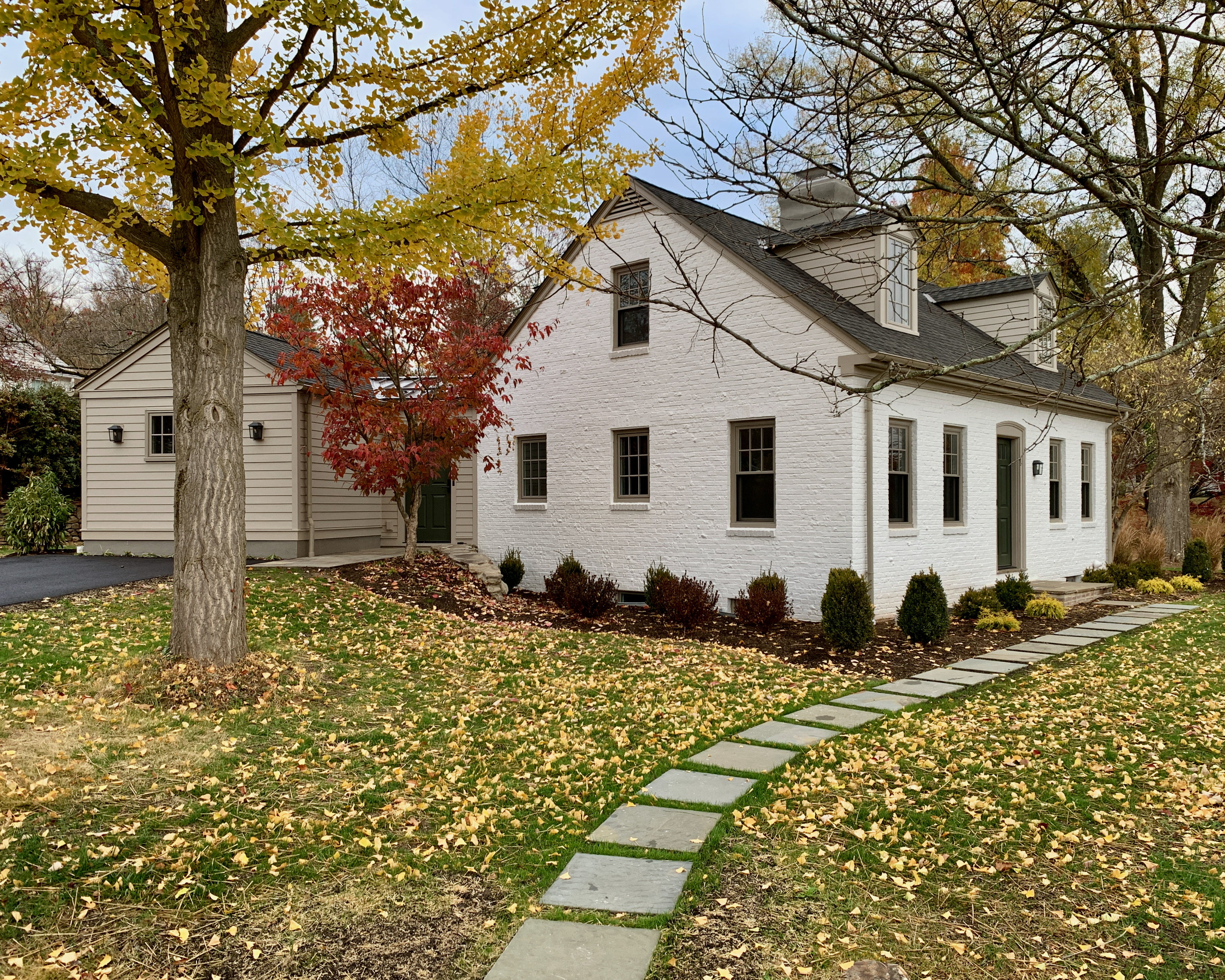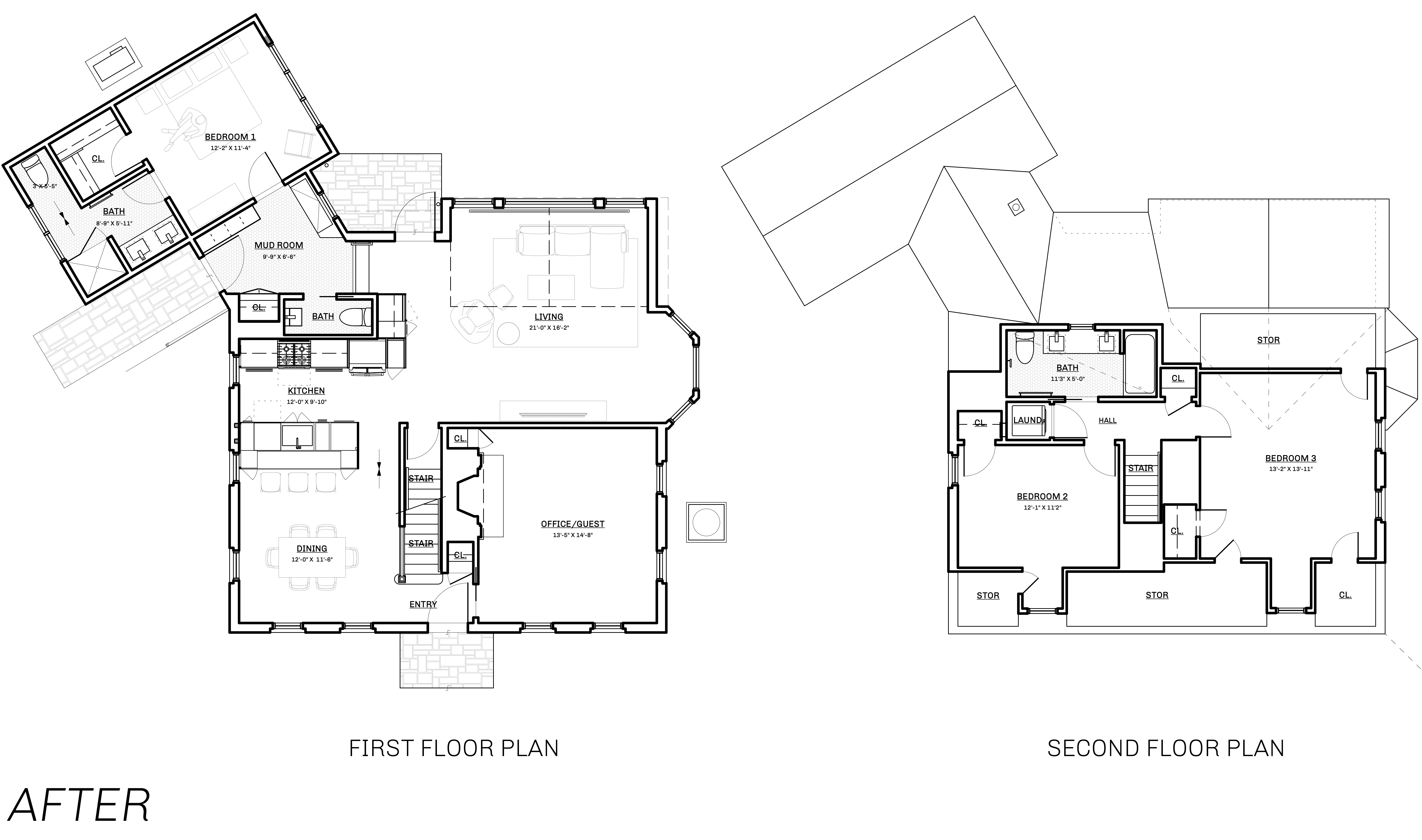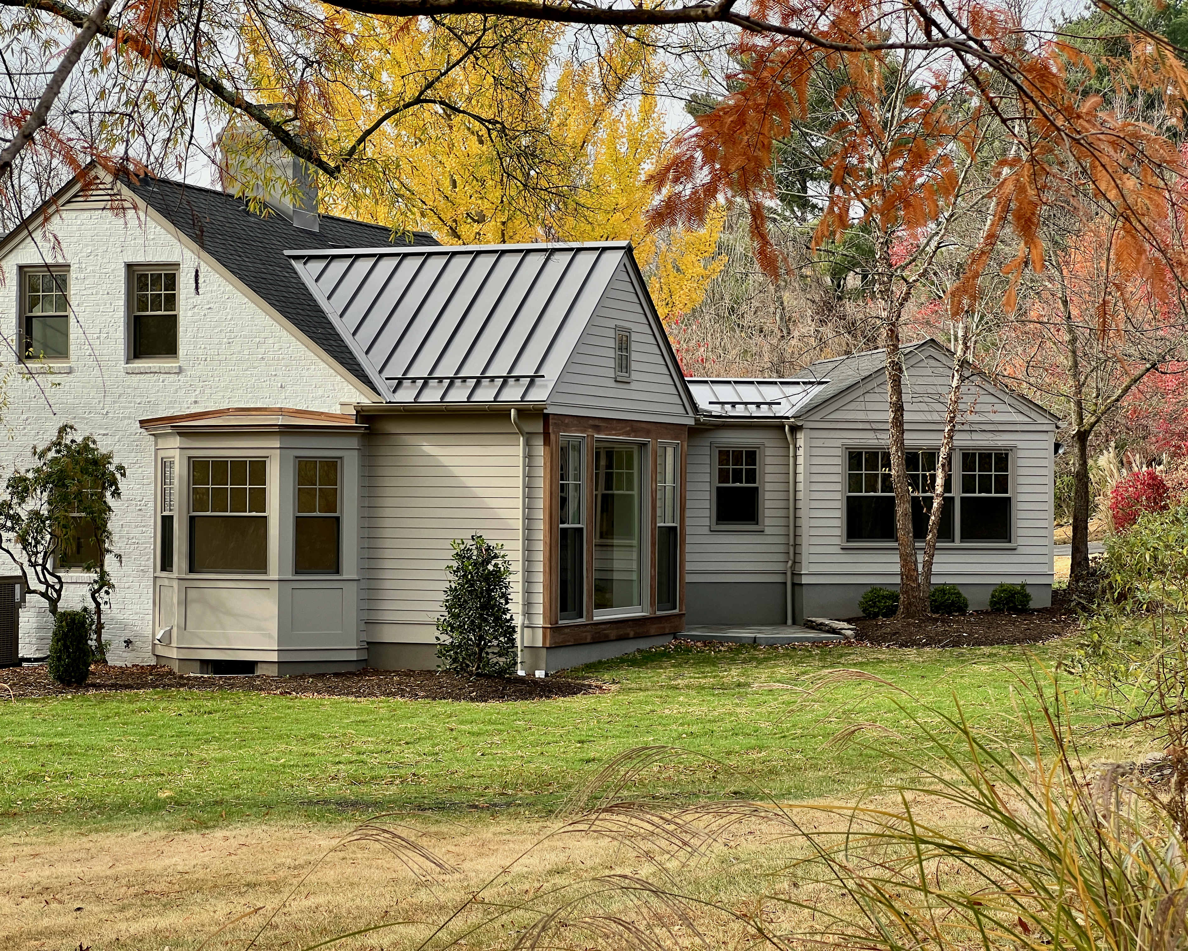 This home was originally constructed in 1953, it was "House #8" of a small development of modest homes clustered around a Lake. The original layout was congested. The serpentine circulation path cut through the living room, small dining room, and galley kitchen. We reorganized all the spaces on the first floor and designed a small but purposeful addition into the backyard to relieve the plan and allow larger living and social spaces that did not double as corridors. Large format glazing at the addition improved views and indoor/outdoor connectivity. The garage was converted into a bedroom suite. The second floor features a new rear-facing shed dormer to enlarge the bathroom and create a laundry closet.