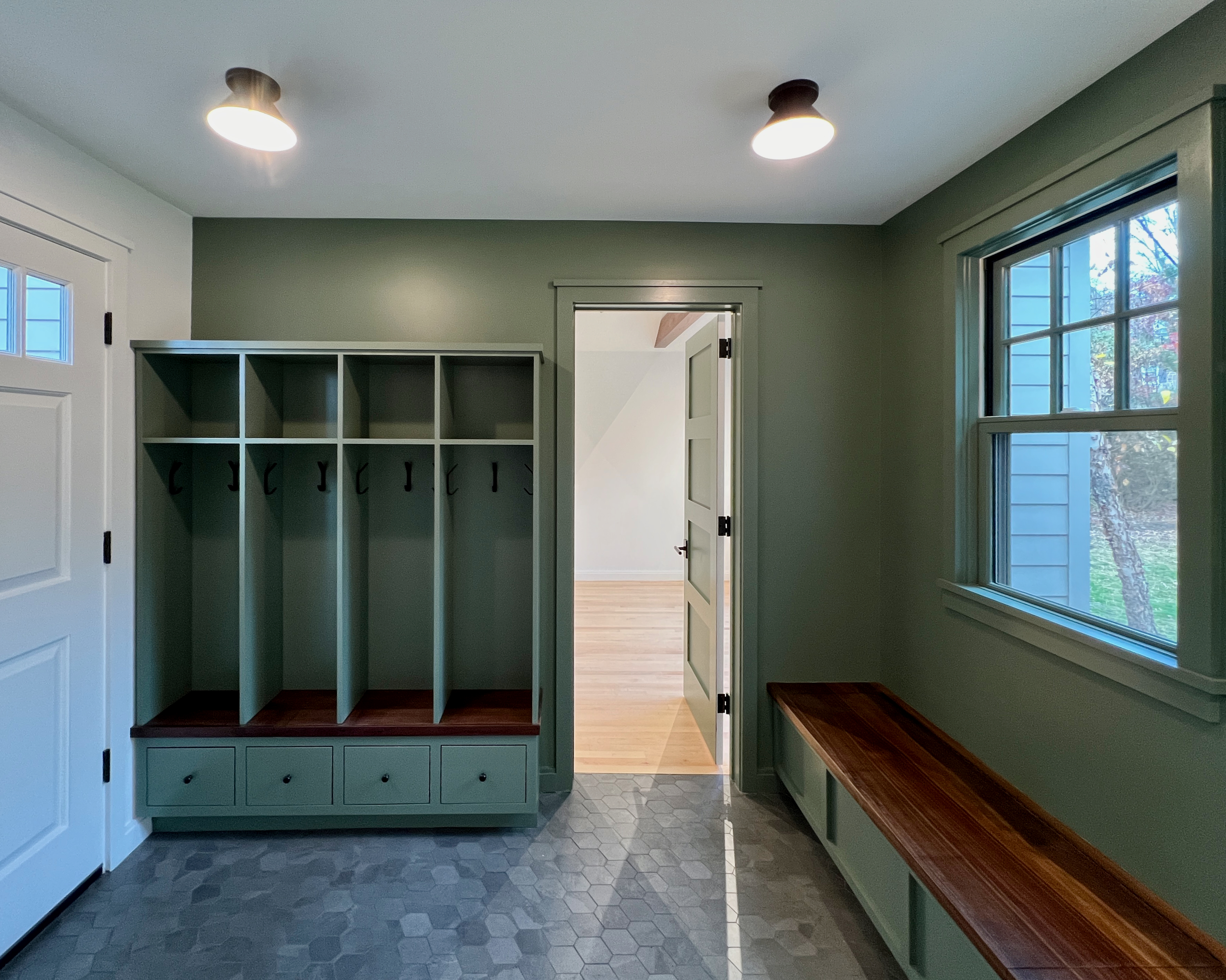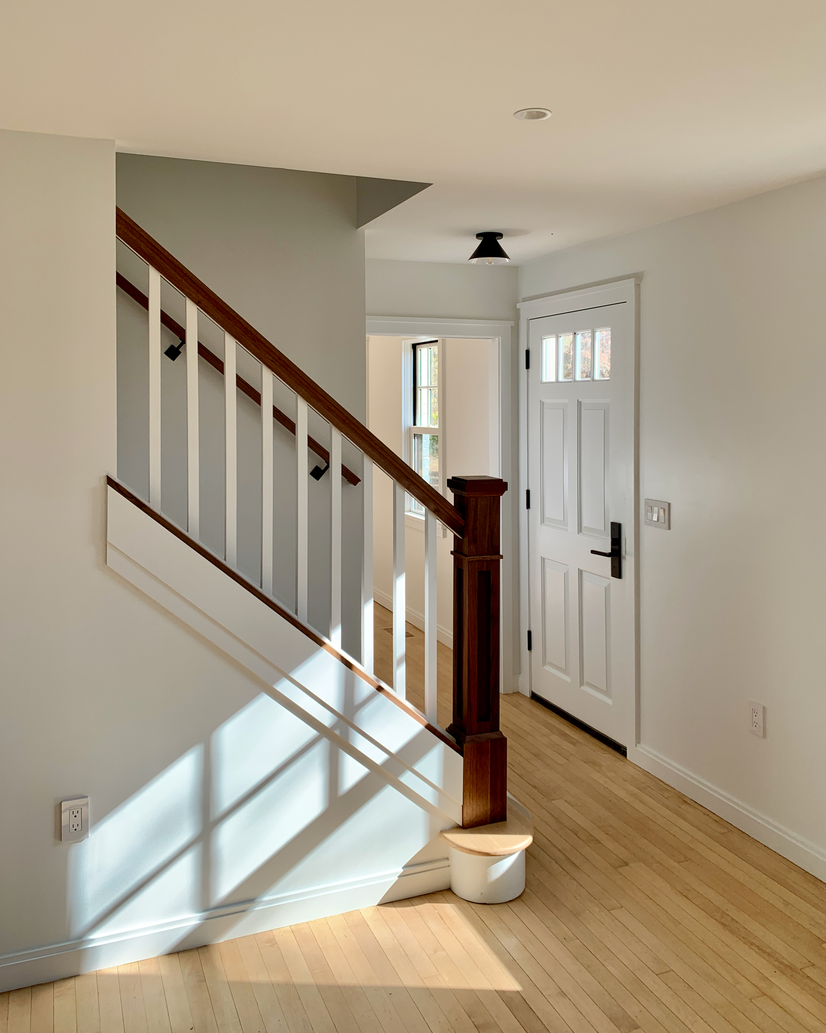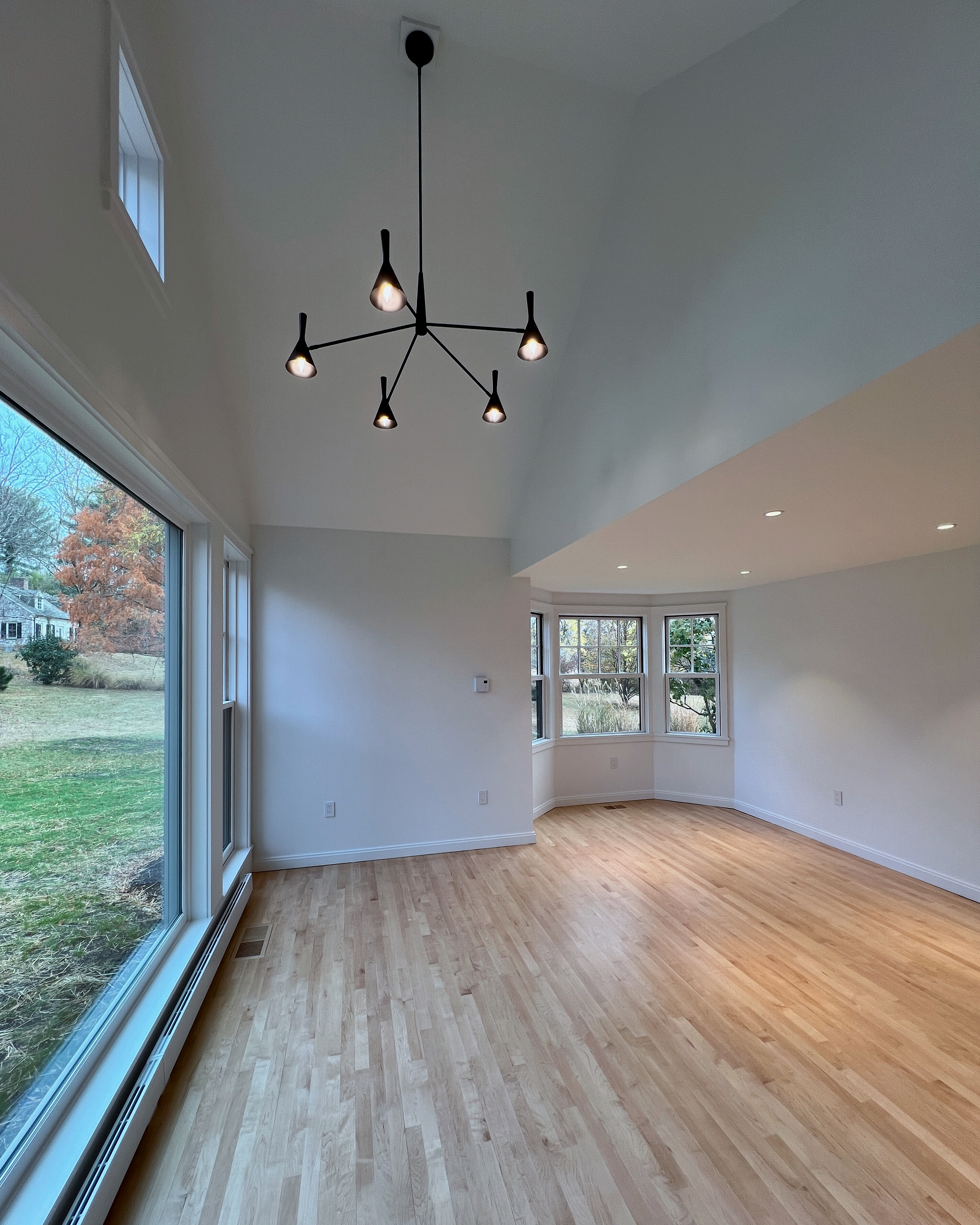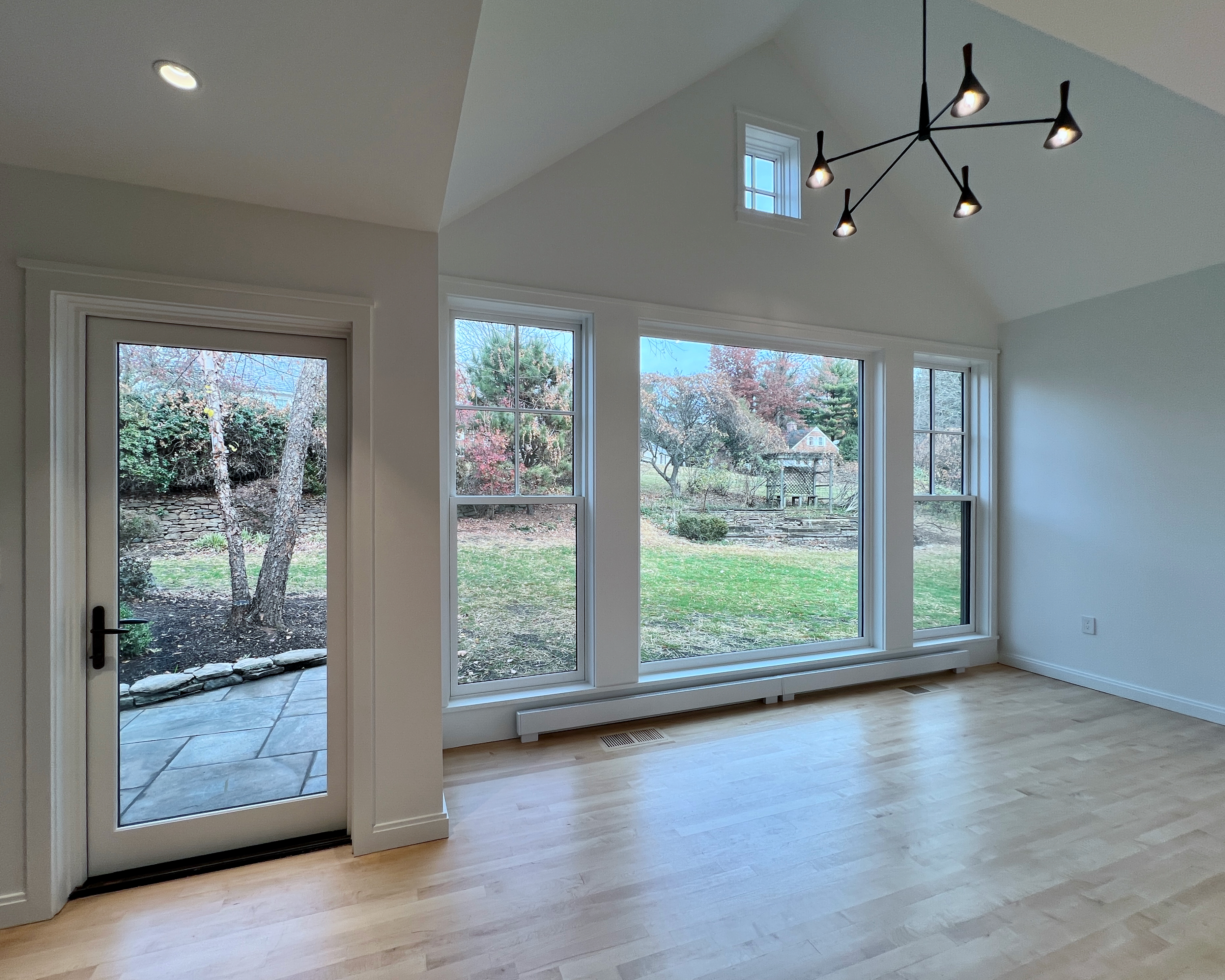 This home was originally constructed in 1953, it was "House #8" of a small development of modest homes clustered around a Lake. The original layout was congested. The serpentine circulation path cut through the living room, small dining room, and galley kitchen. We reorganized all the spaces on the first floor and designed a small but purposeful addition into the backyard to relieve the plan and allow larger living and social spaces that did not double as corridors. Large format glazing at the addition improved views and indoor/outdoor connectivity. The garage was converted into a bedroom suite. The second floor features a new rear-facing shed dormer to enlarge the bathroom and create a laundry closet.