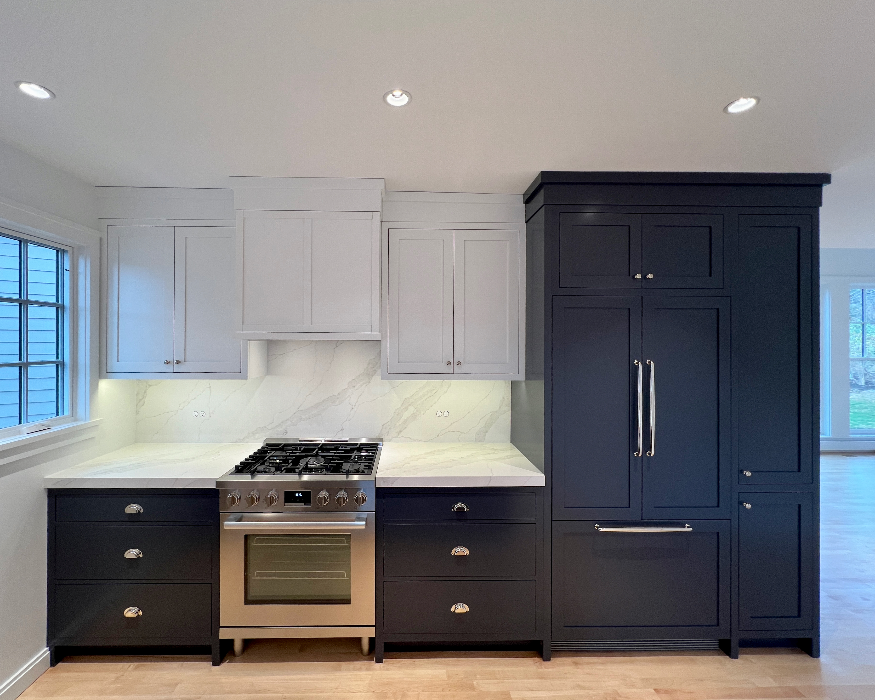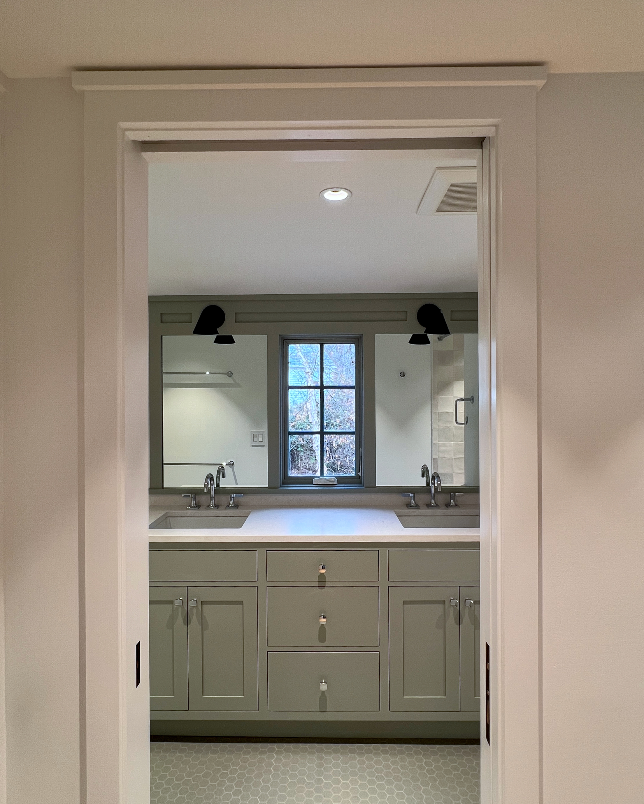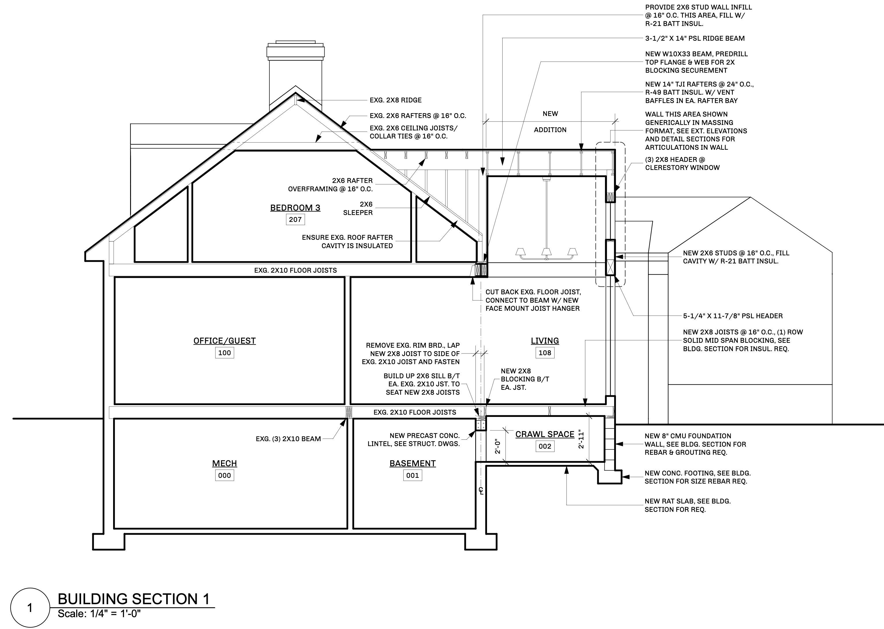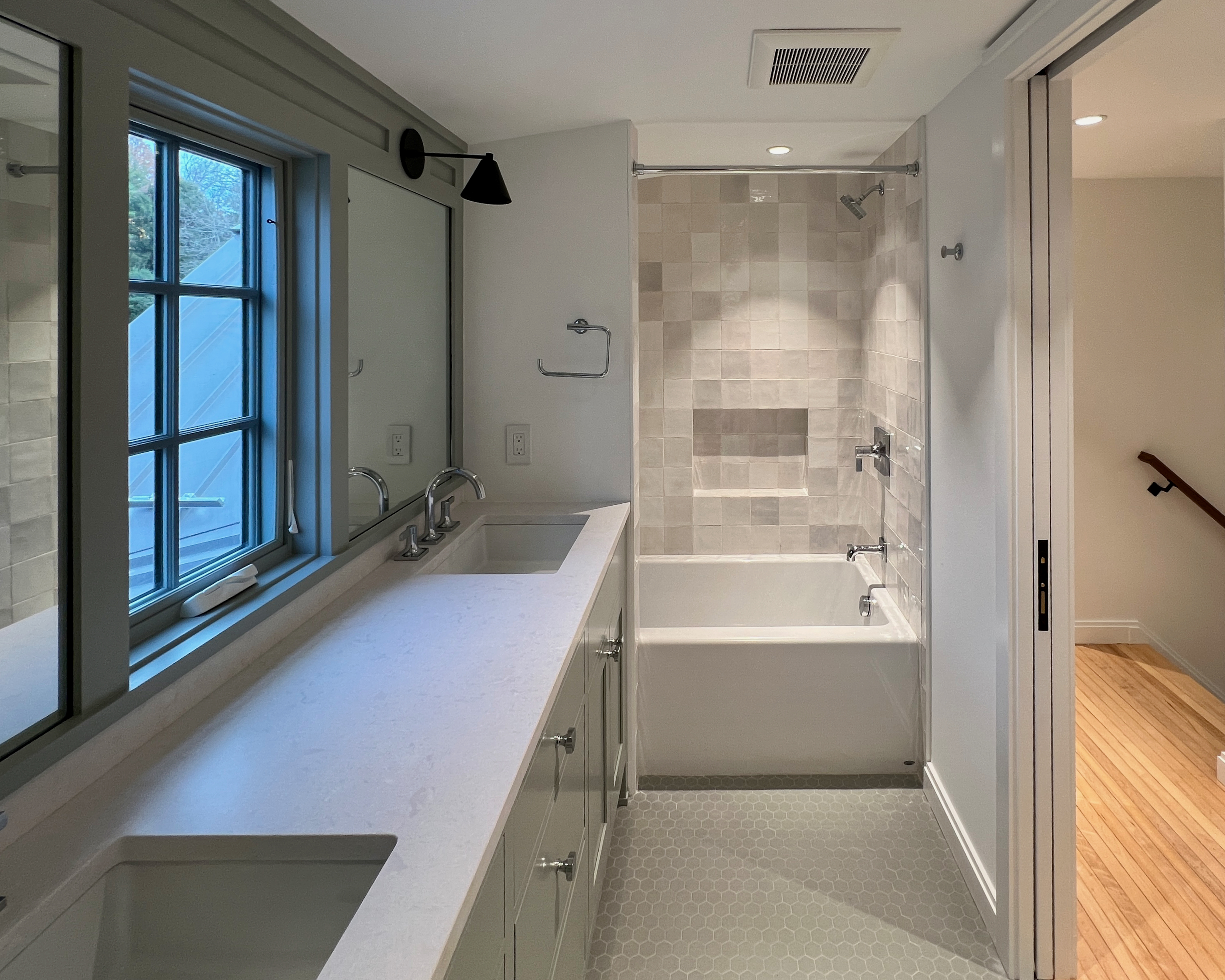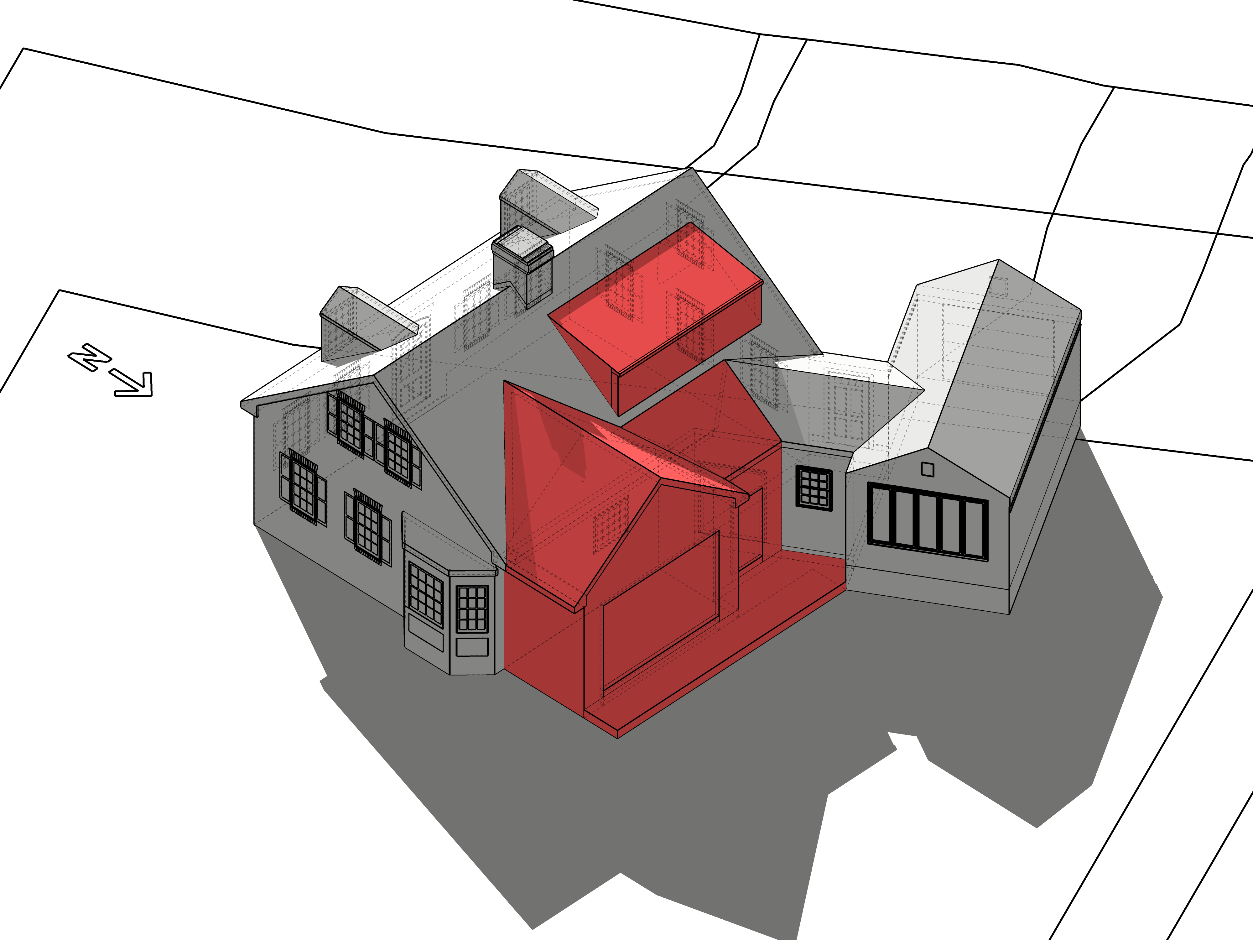 This home was originally constructed in 1953, it was "House #8" of a small development of modest homes clustered around a Lake. The original layout was congested. The serpentine circulation path cut through the living room, small dining room, and galley kitchen. We reorganized all the spaces on the first floor and designed a small but purposeful addition into the backyard to relieve the plan and allow larger living and social spaces that did not double as corridors. Large format glazing at the addition improved views and indoor/outdoor connectivity. The garage was converted into a bedroom suite. The second floor features a new rear-facing shed dormer to enlarge the bathroom and create a laundry closet.