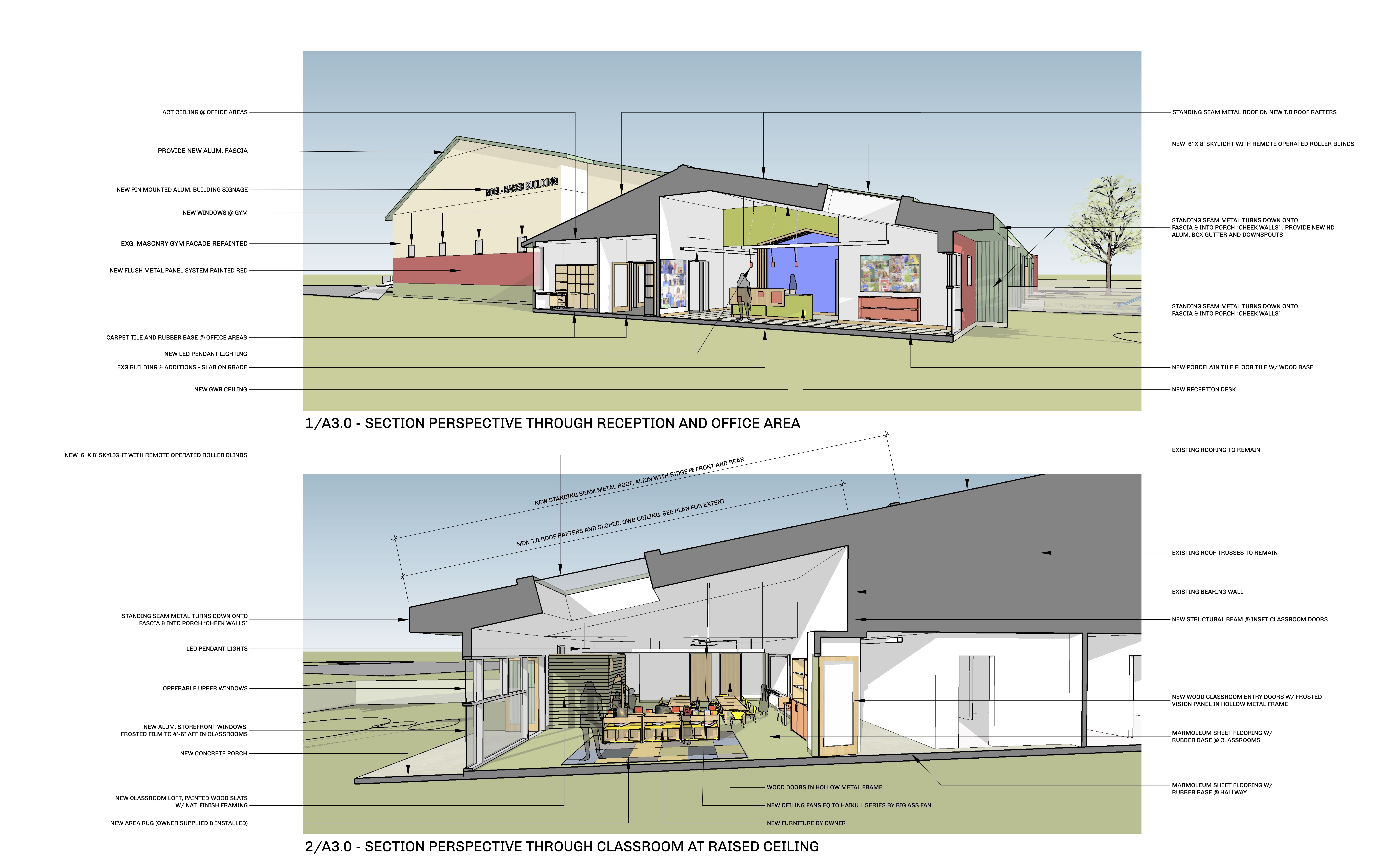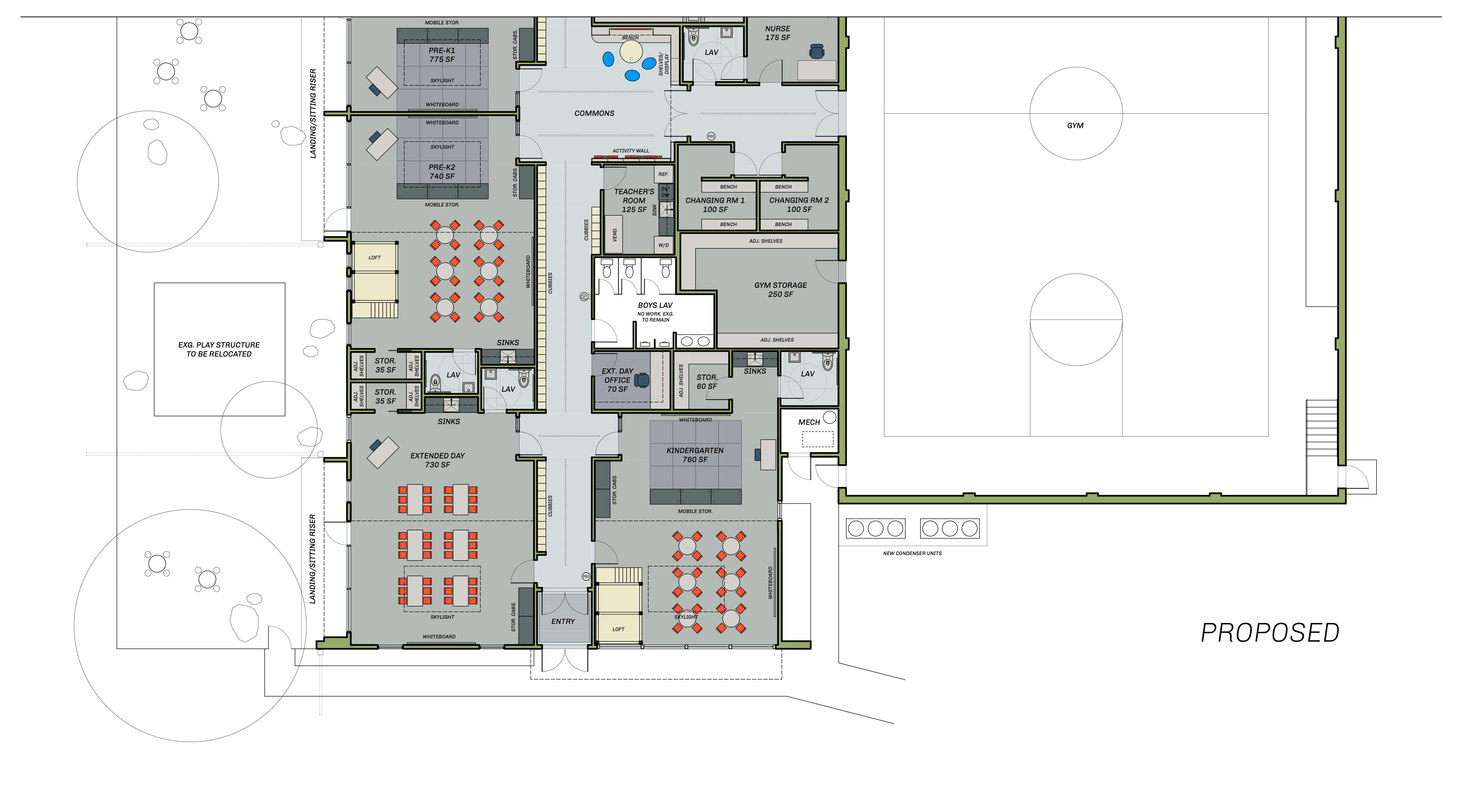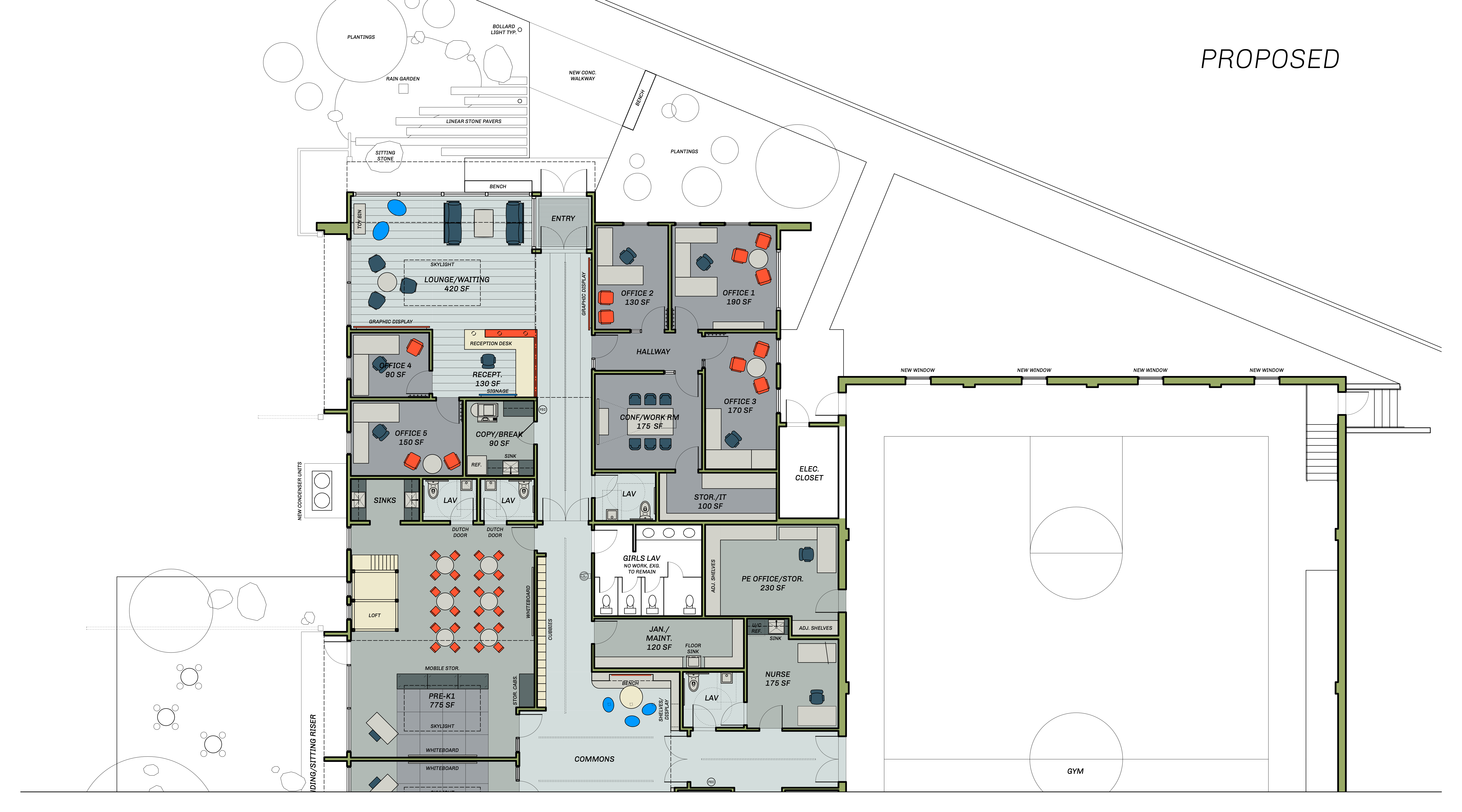 FSMH has excellent existing facilities and is situated on a 26-acre campus with sports fields, outdoor learning spaces, and wooded hiking trails, but lacks a welcoming “Front Door.” Our design focuses principally on improving the older of the two classroom buildings on campus. It opens up the entry and the gym lobby to allow informal gathering/hosting visitors, connects classrooms to the outdoors, improves accessibility, and modestly expands the building footprint to better accommodate aftercare and administrative spaces.