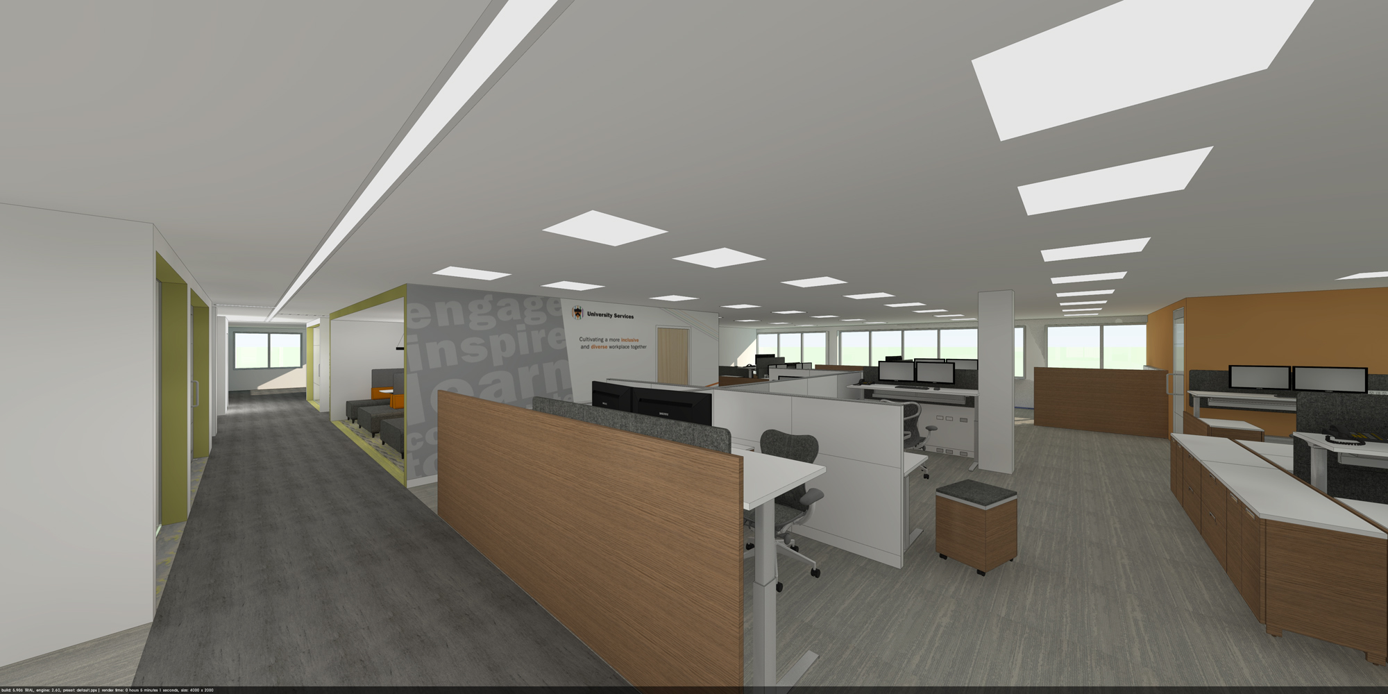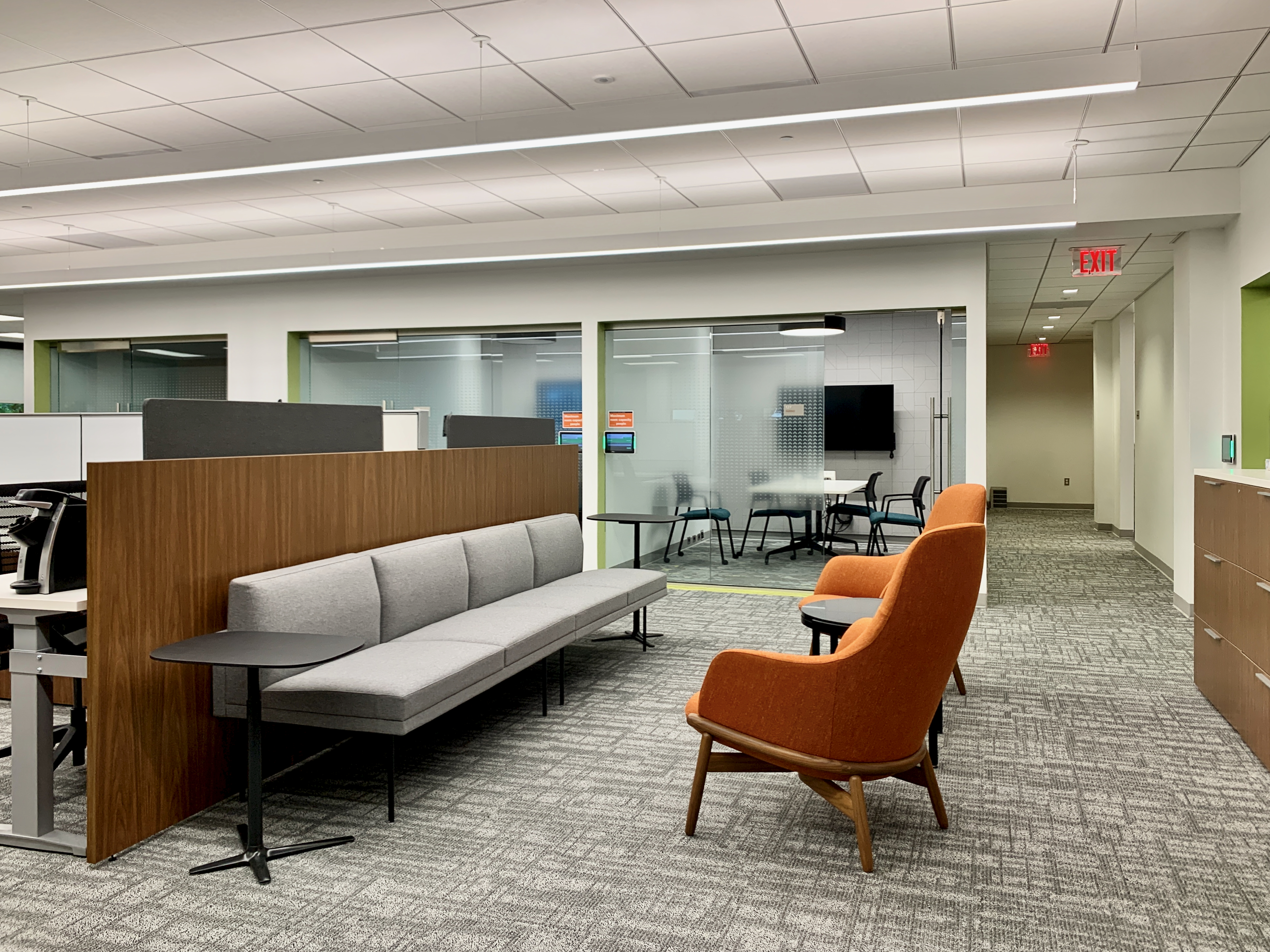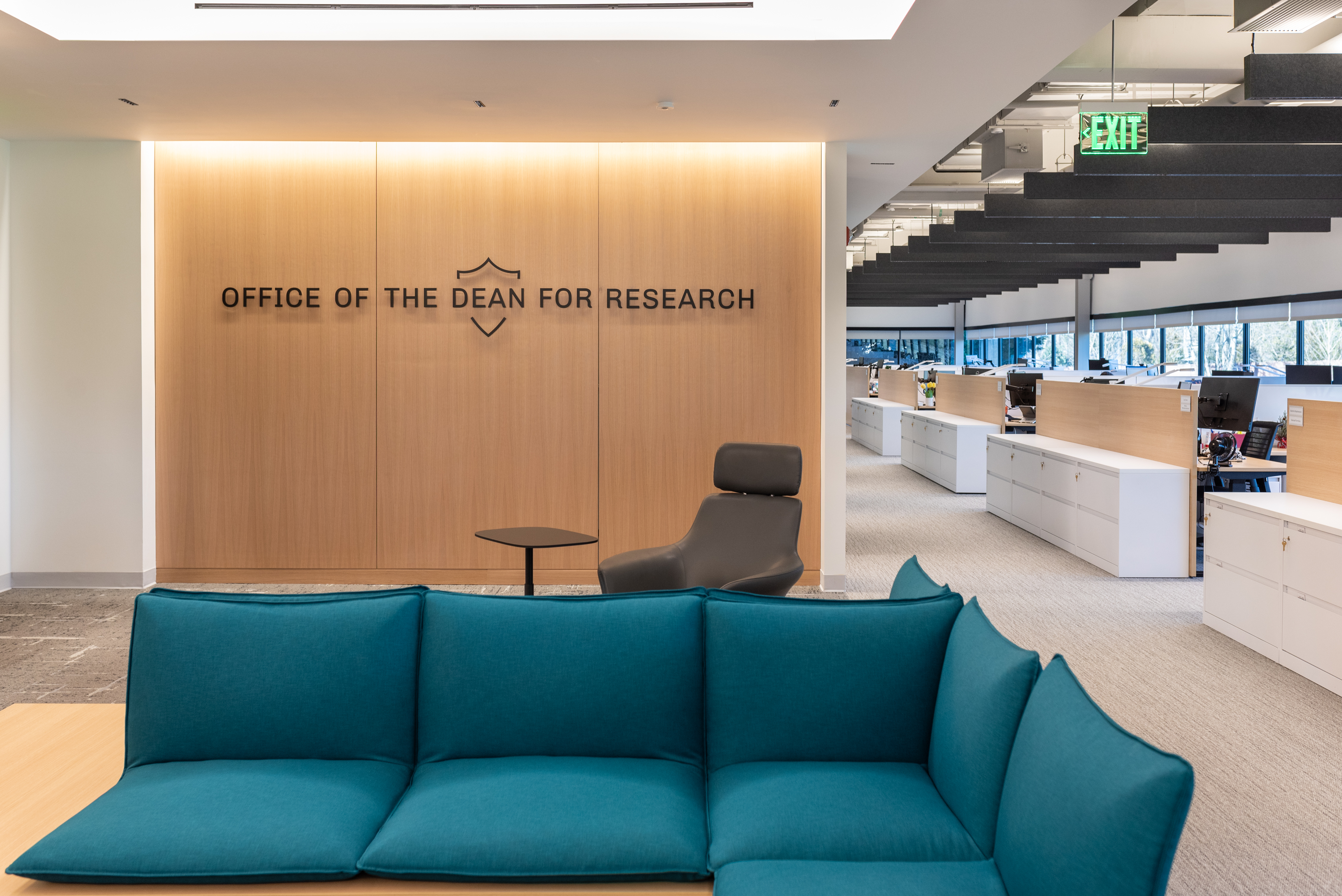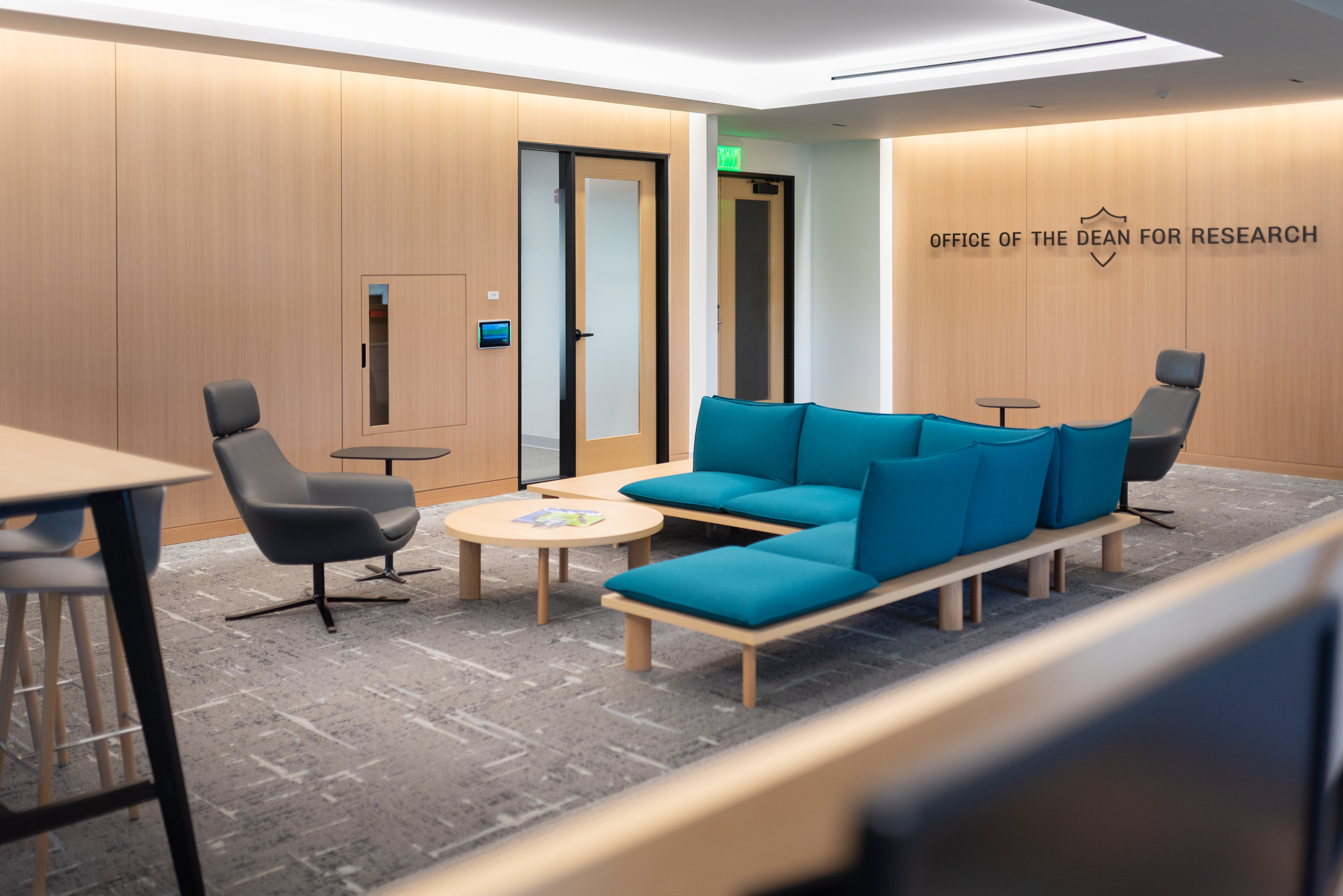 This 6,200 SF office suite was renovated for the Office of the Dean for Research. The floor plan flips workstations and shared spaces to the windows and allows daylight to filter through to the interior offices. The entry features an illuminated ceiling cove and rift sawn white oak wall panels. Infrastructure was carefully organized and felt clad pendant lights were utilized to increase acoustic comfort in the open work areas.