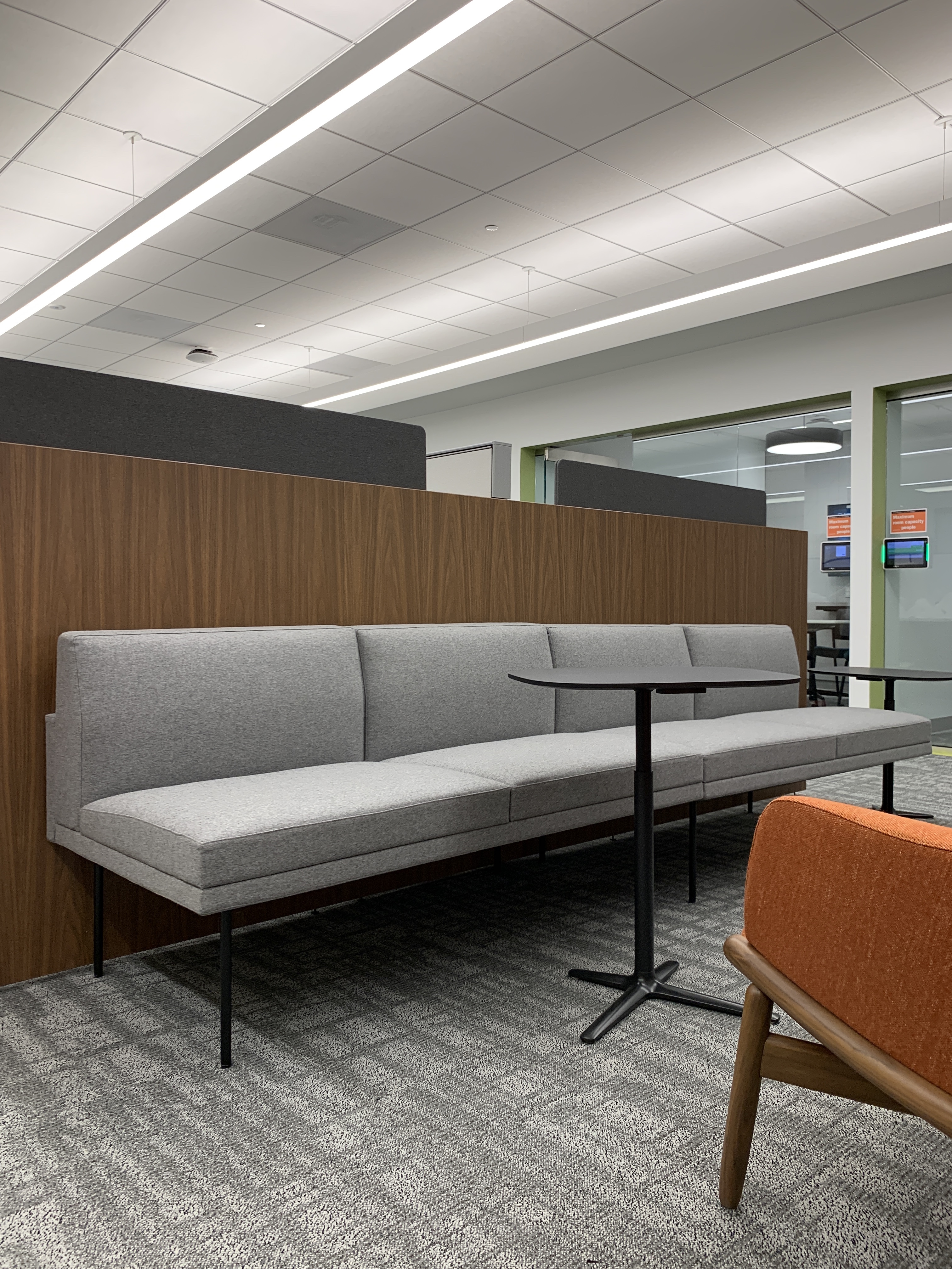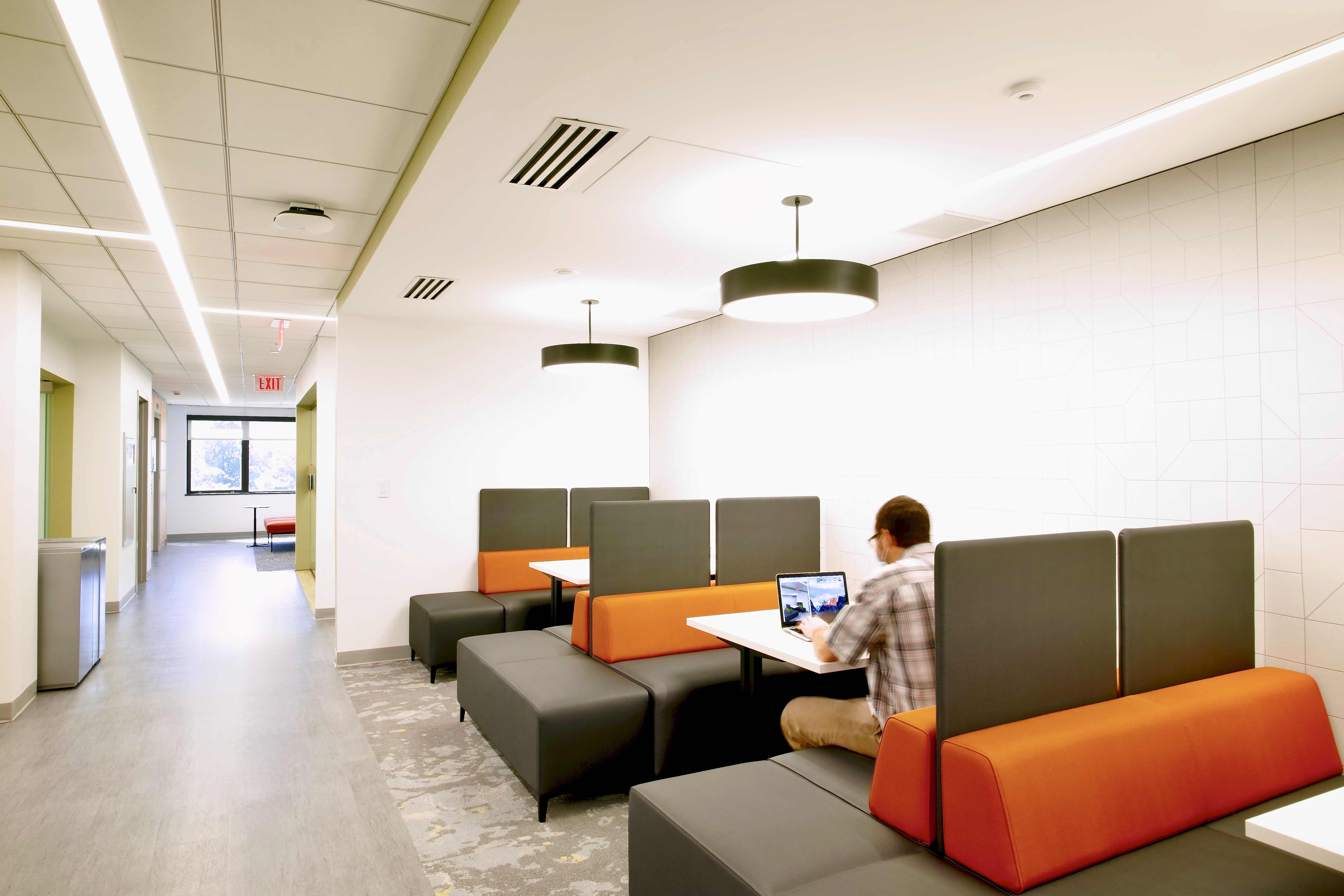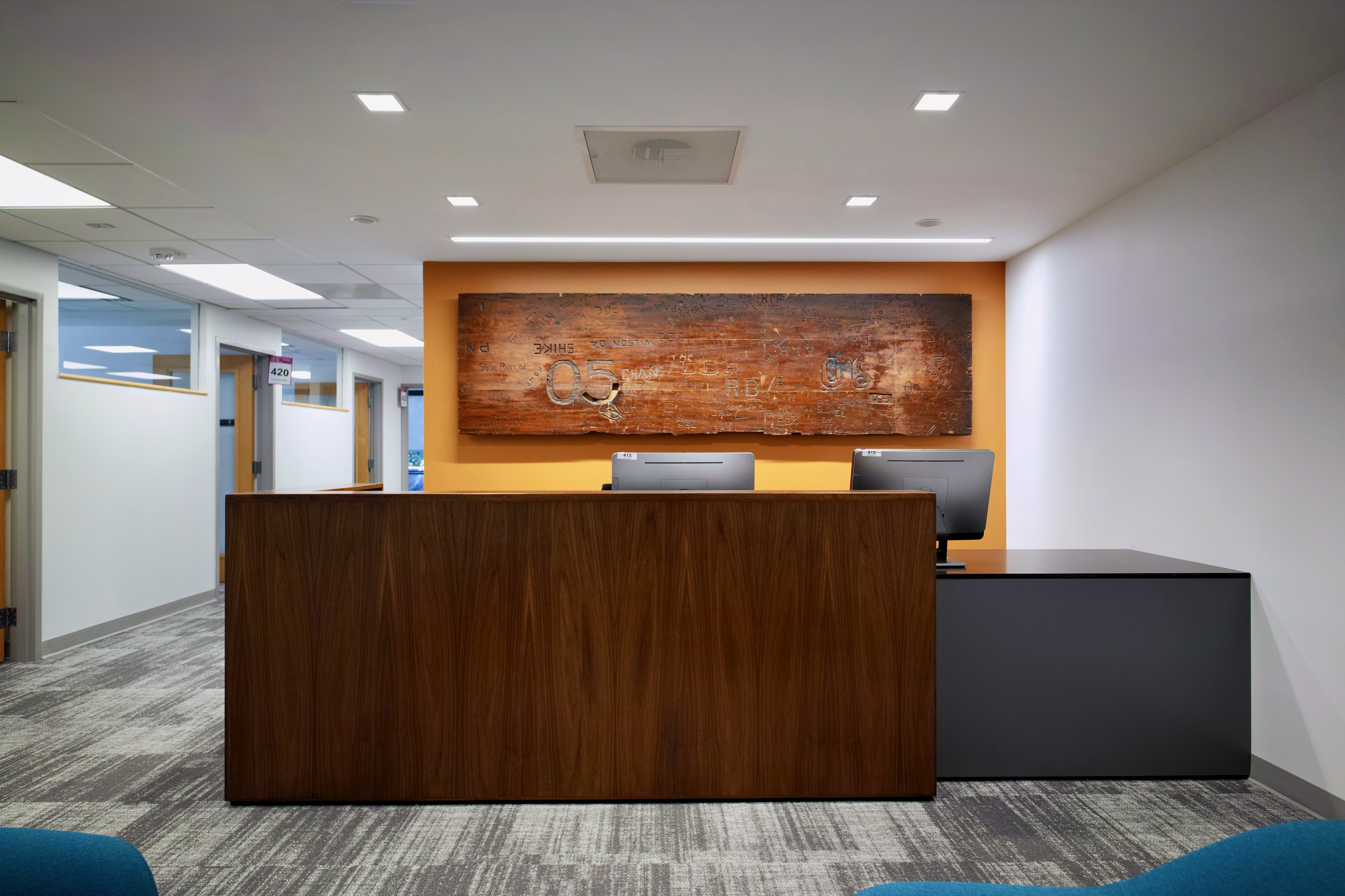 The goal of the project was to create an easily accessible and convenient service center for students to interface with various University Services, as well as touchdown space for University Services staff. The Point is in one of the lower levels of a highrise building on campus, which presented several design challenges. We used expanses of luminous panels and glass to help create a feeling of spaciousness and openness in an area of relatively low ceiling heights. Making The Point highly visible was another challenge. We responded to this by designing an orange acoustical felt accent wall with a corner-wrapping graphic sign that is visible from the entry doors.