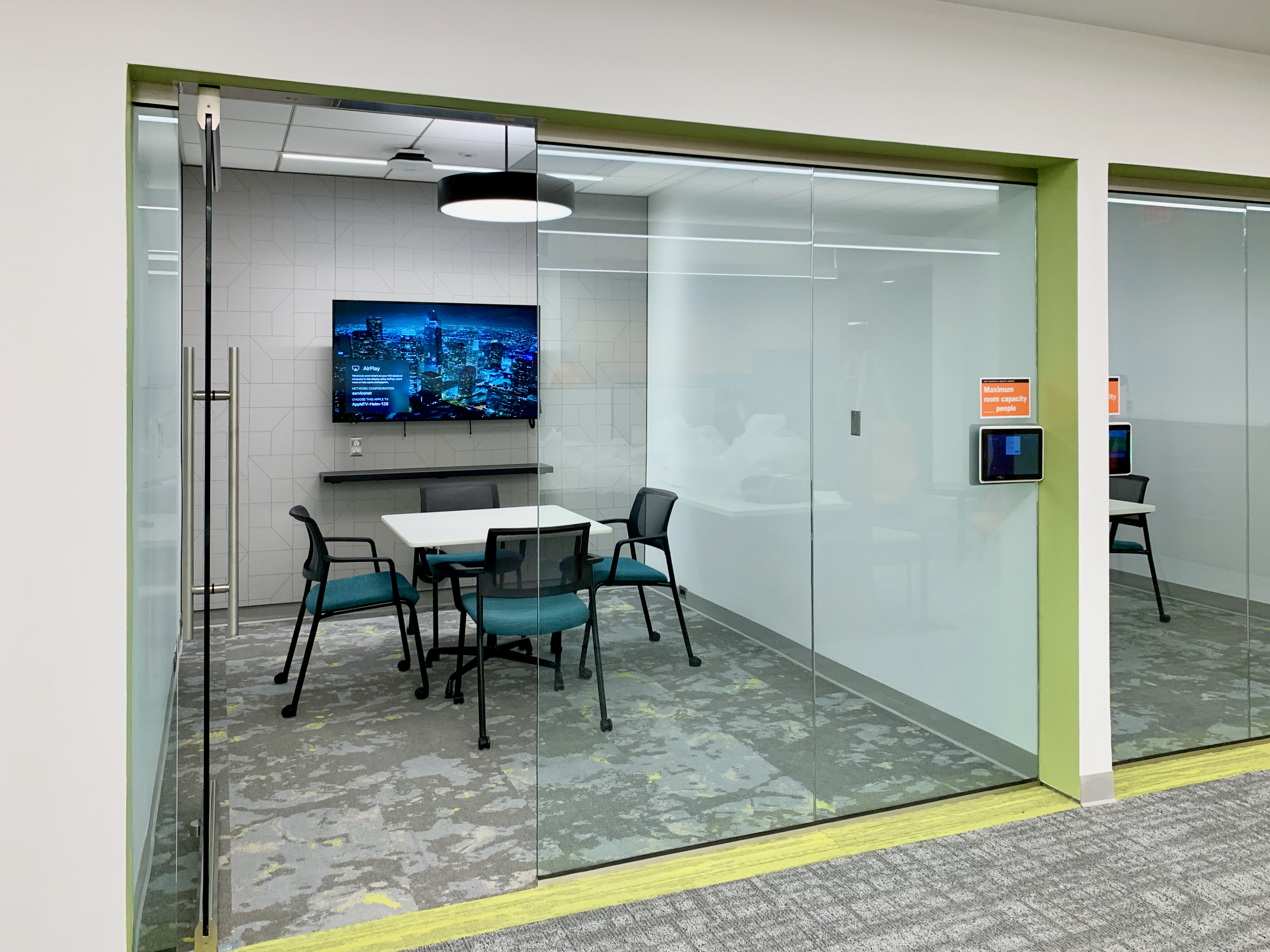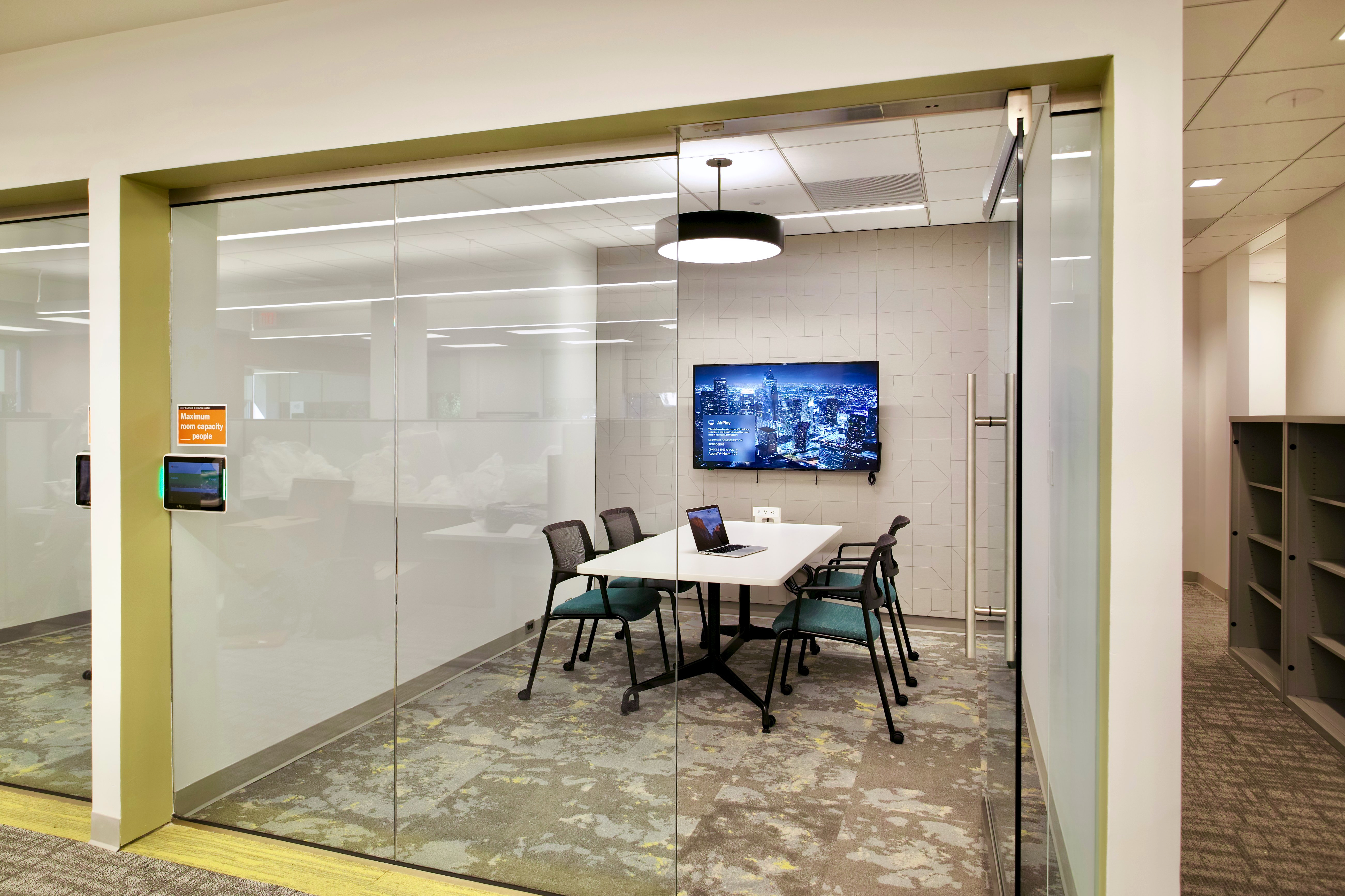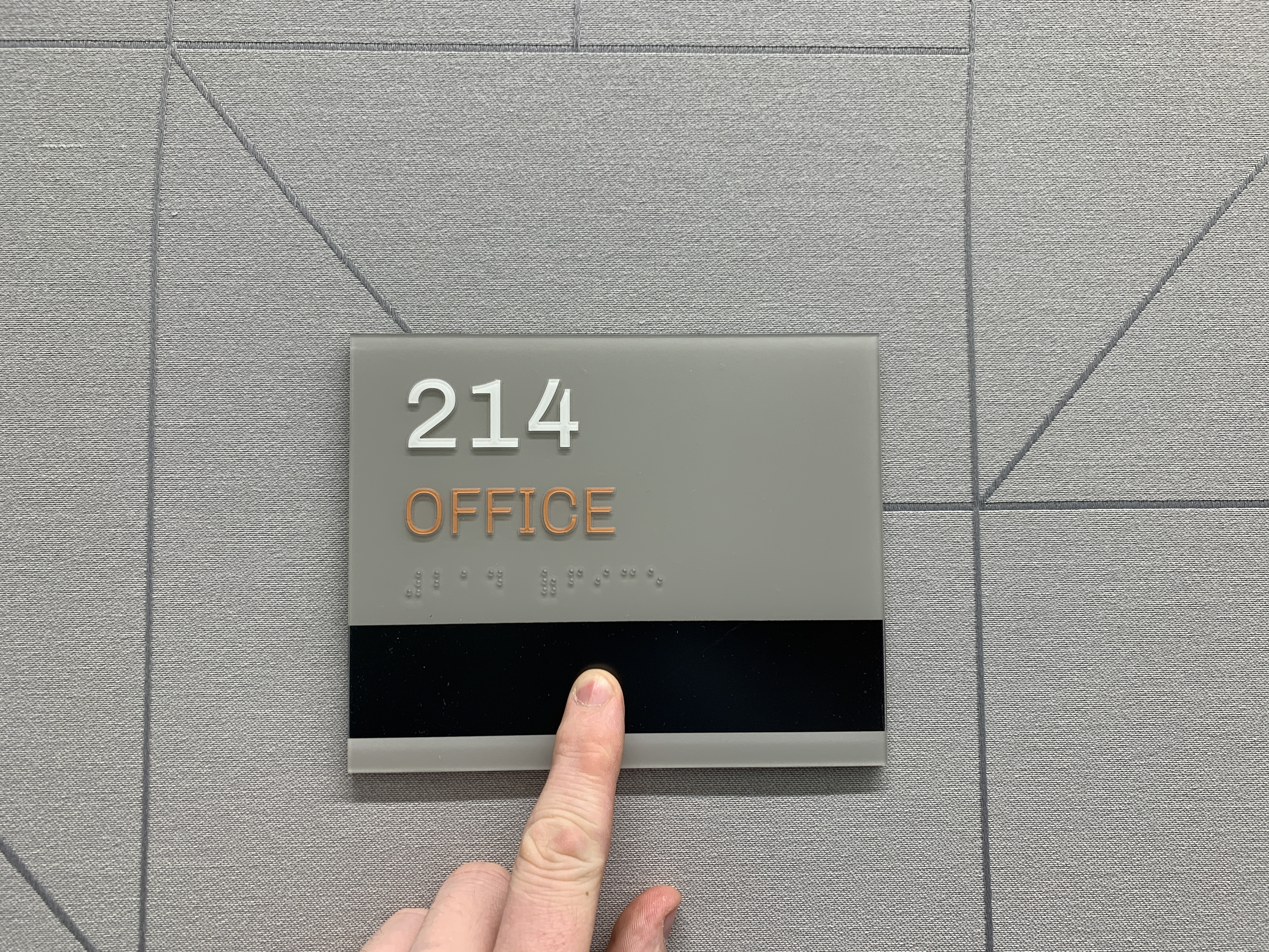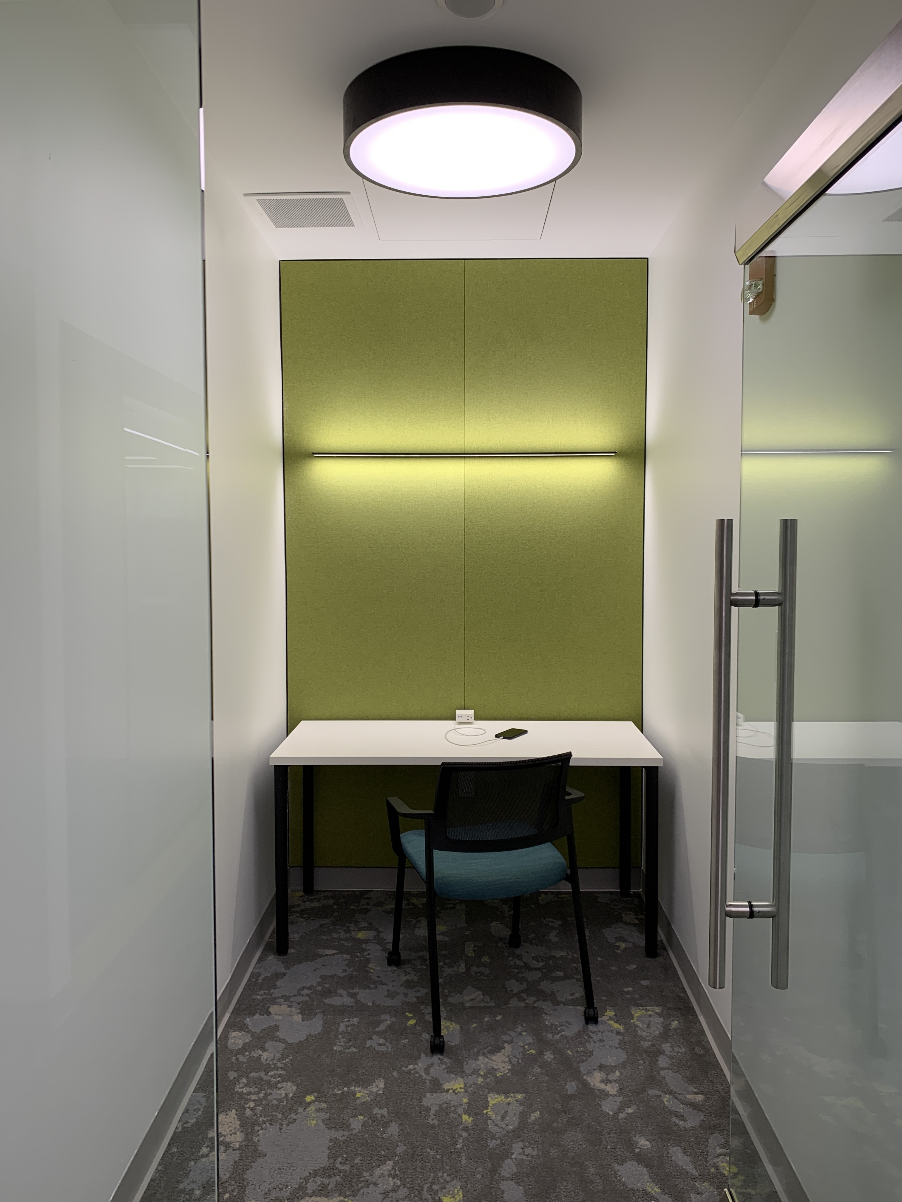 The goal of the project was to create an easily accessible and convenient service center for students to interface with various University Services, as well as touchdown space for University Services staff. The Point is in one of the lower levels of a highrise building on campus, which presented several design challenges. We used expanses of luminous panels and glass to help create a feeling of spaciousness and openness in an area of relatively low ceiling heights. Making The Point highly visible was another challenge. We responded to this by designing an orange acoustical felt accent wall with a corner-wrapping graphic sign that is visible from the entry doors.