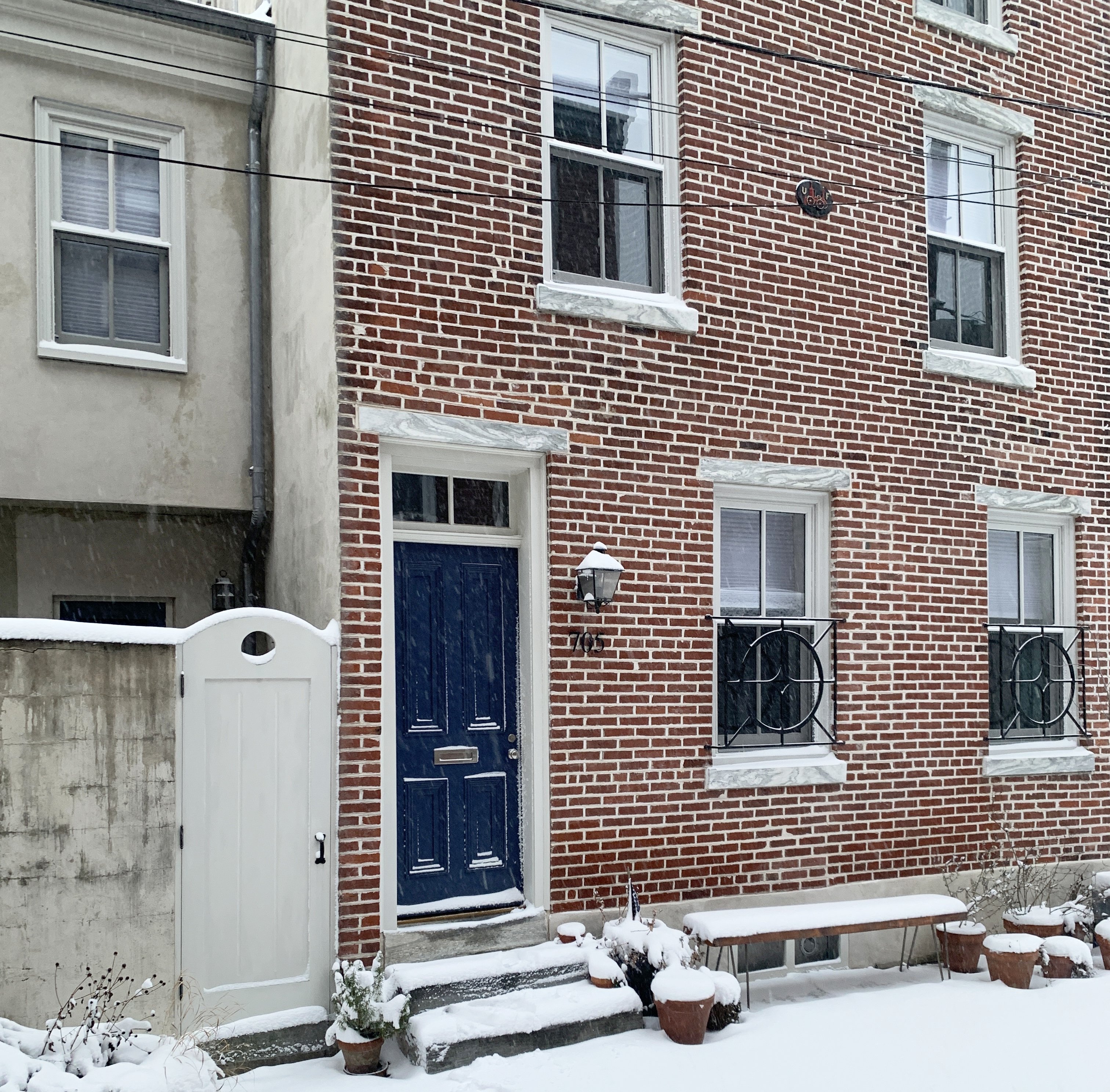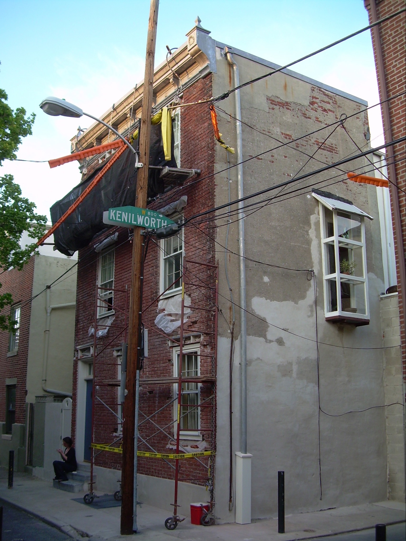 Extensive masonry repairs began with the removal of non-native and spalled brick, rebuilding large sections of the bearing walls where required. New marble headers and sills were inserted at all window and door openings. The front façade was repointed with natural hydraulic lime mortar, tooled to a beveled ridge profile. Deteriorated stucco on the sides of the house was repaired with new NHL stucco and lime painted. New SBS modified bitumen roofing and a custom lead coated copper cornice was installed. The chimney was rebuilt from the ground up, relined with double walled stainless steel chimney pipe, and topped with a sheet metal cap. Existing wood double hung windows were restored. Other improvements include new custom window grates, sidewalk doors, light fixtures, waterjet cut house numbers, electrical service entrance, downspout boxing, gate door, and front door with transom.