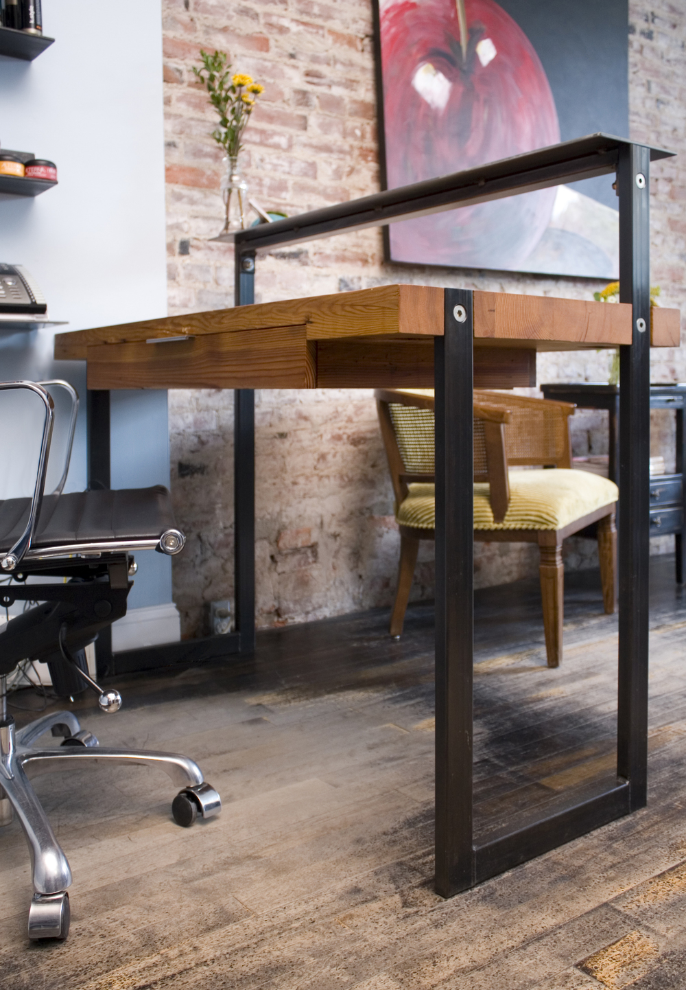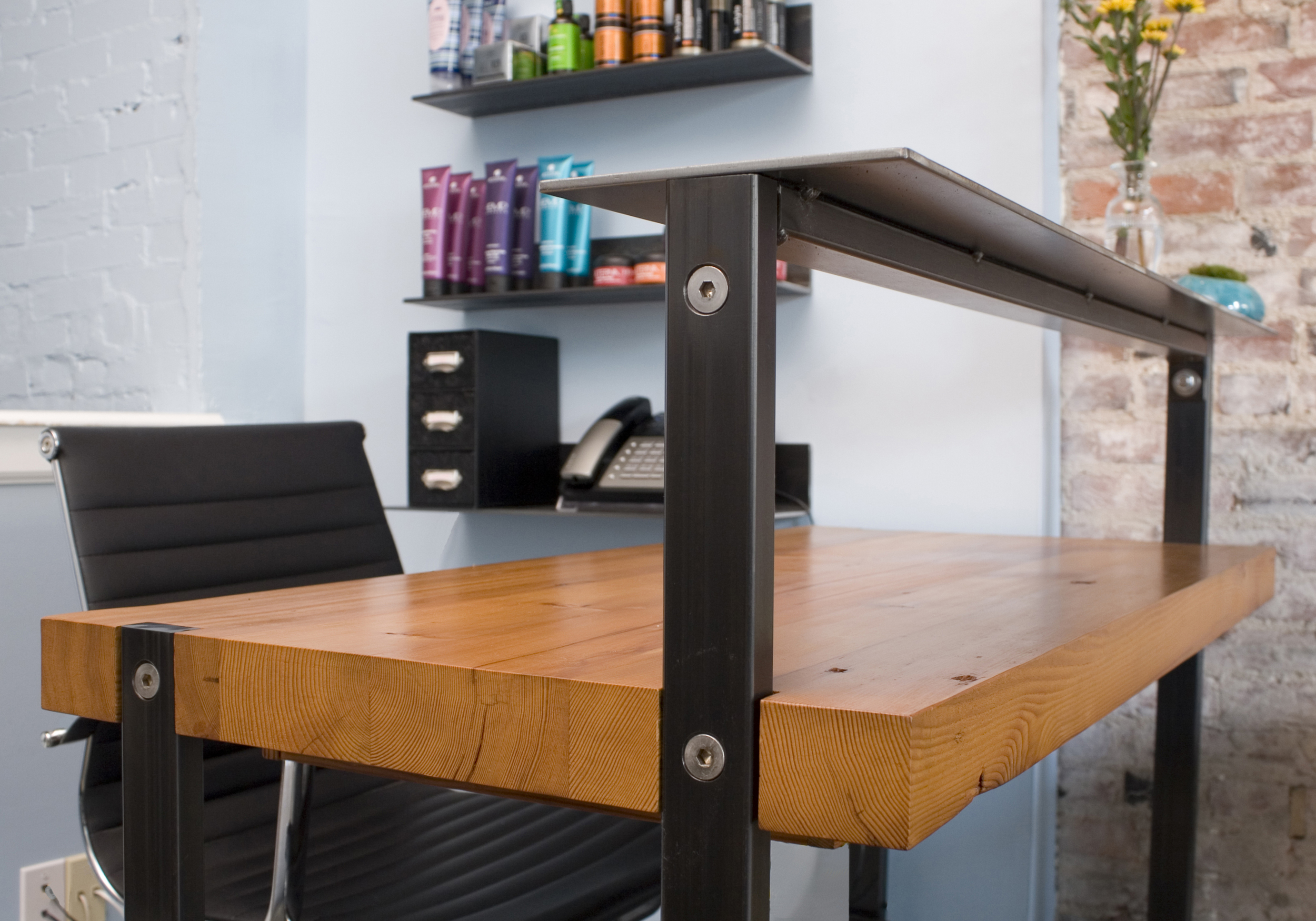 We designed and oversaw fabrication of a new reception desk, storage cabinet, and display shelving to refresh the look and improve the functionality of a hair salon. All pieces utilized salvaged long leaf pine and blackened steel components made by local craftsmen. This project was a collaboration with (re)work Architecture and Design. Connections between the wood and steel framework are intentionally expressed. Clear tongue oil finish enhances the pine's rich natural beauty and celebrates the wood's previous life as flooring and joists.